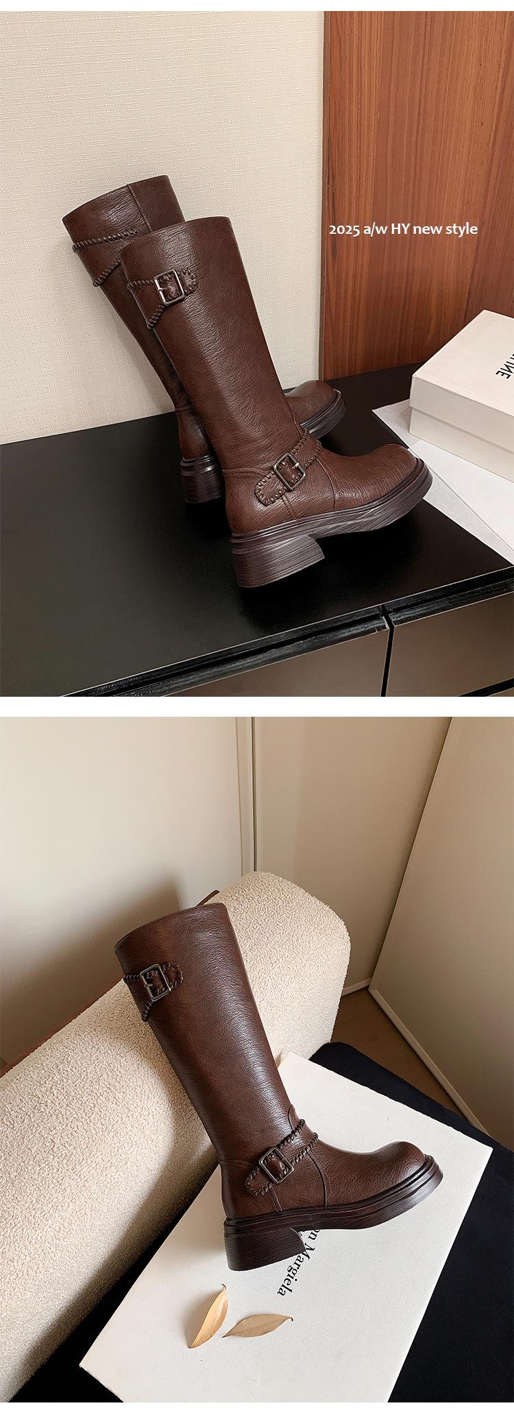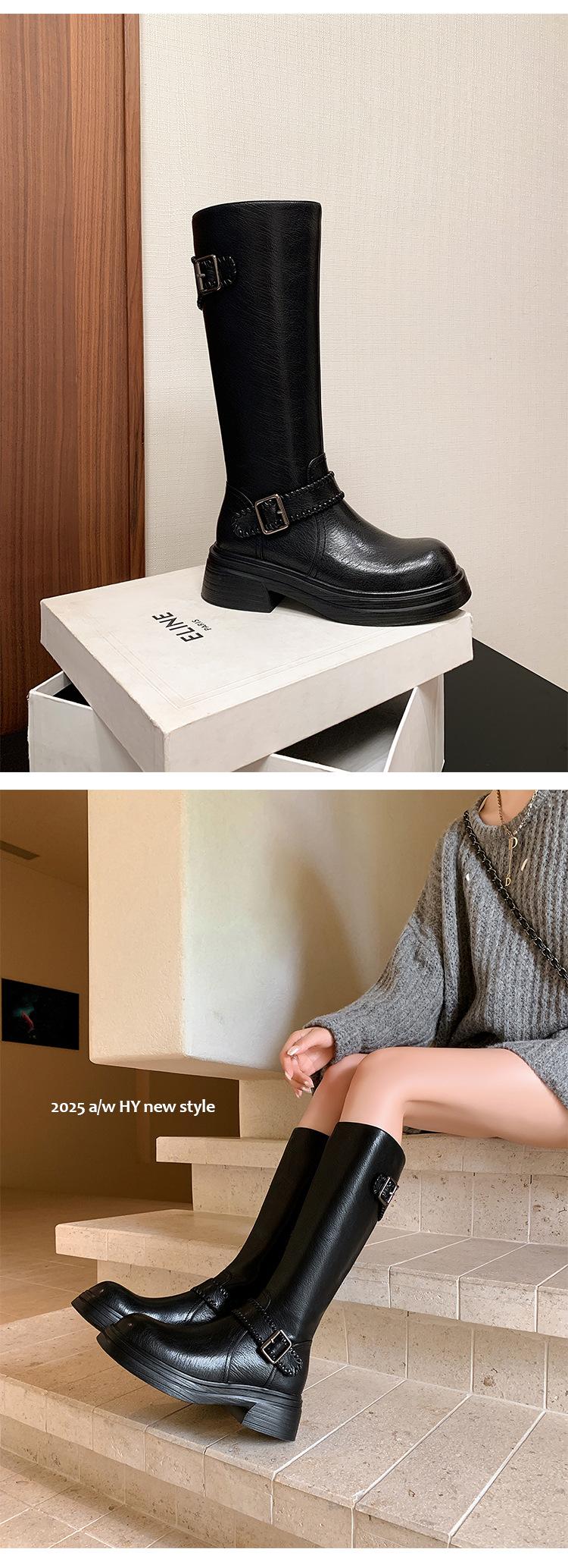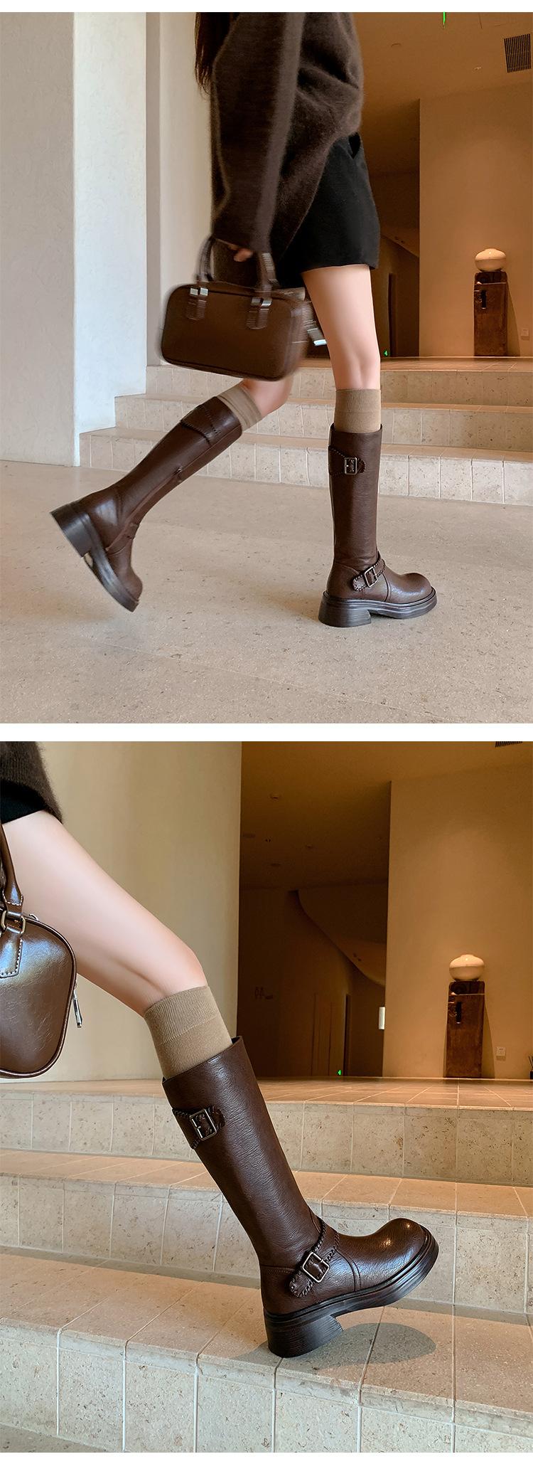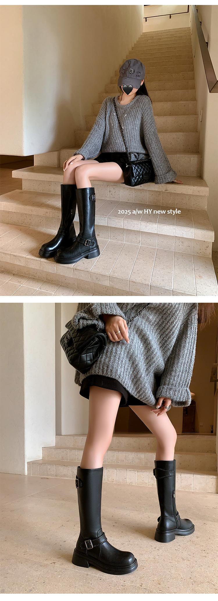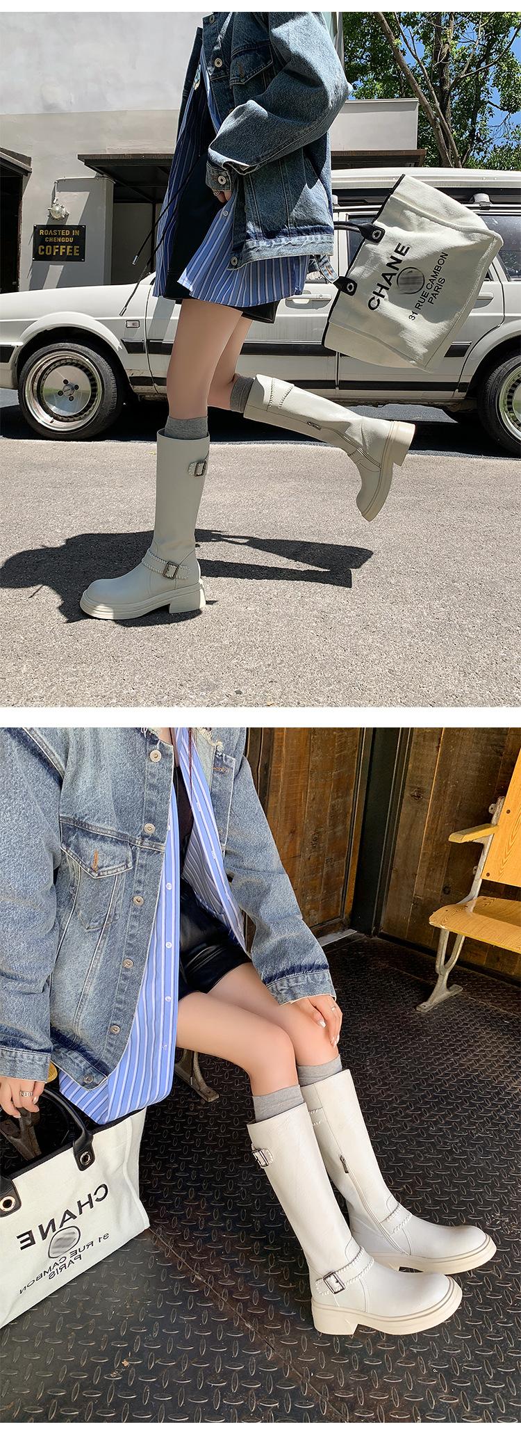 Dulce Chica Cool Picante Botas Simples de Caballero por Encima de la Rodilla 2025 Otoño/Invierno Nuevo Punta Redonda Suela Gruesa Tacón Ancho Hebilla Botas Altas
