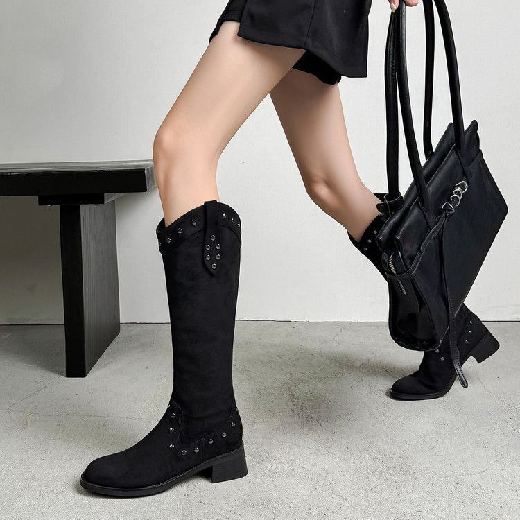 Otoño/Invierno 2025 Nuevas Botas Largas Retro Cómodas para Mujer Moda Versátil Punta Redonda Tacón Ancho Cierre Lateral Botas Altas para Mujer