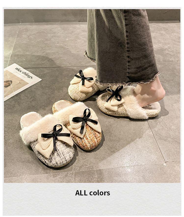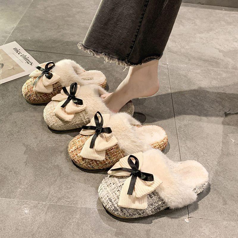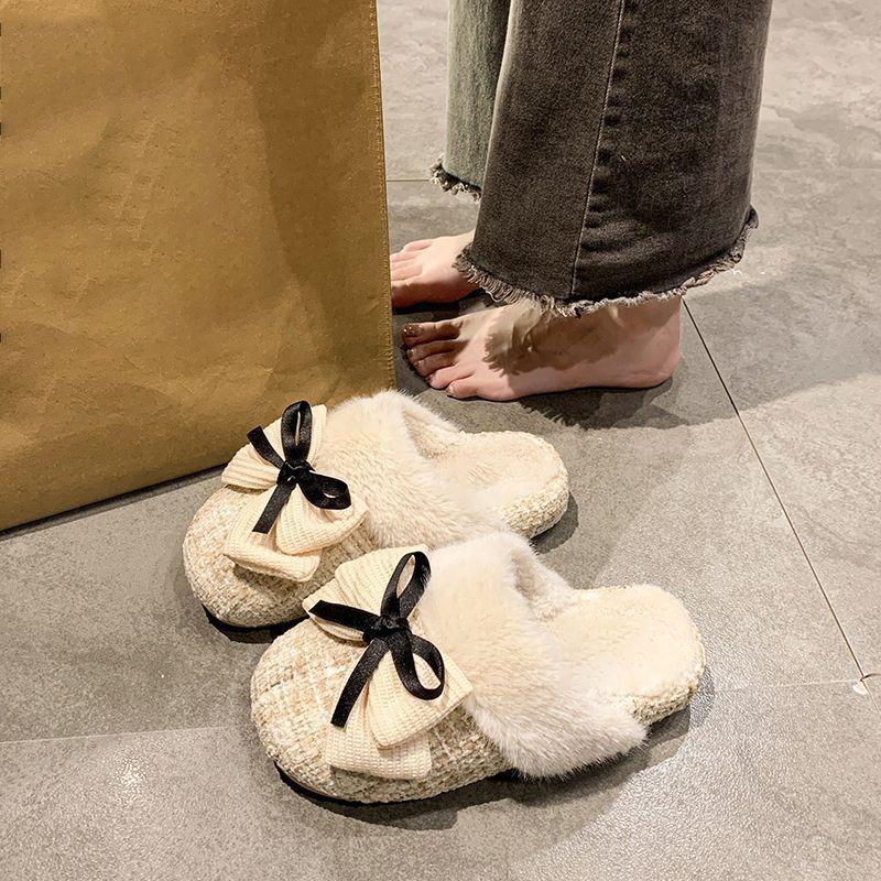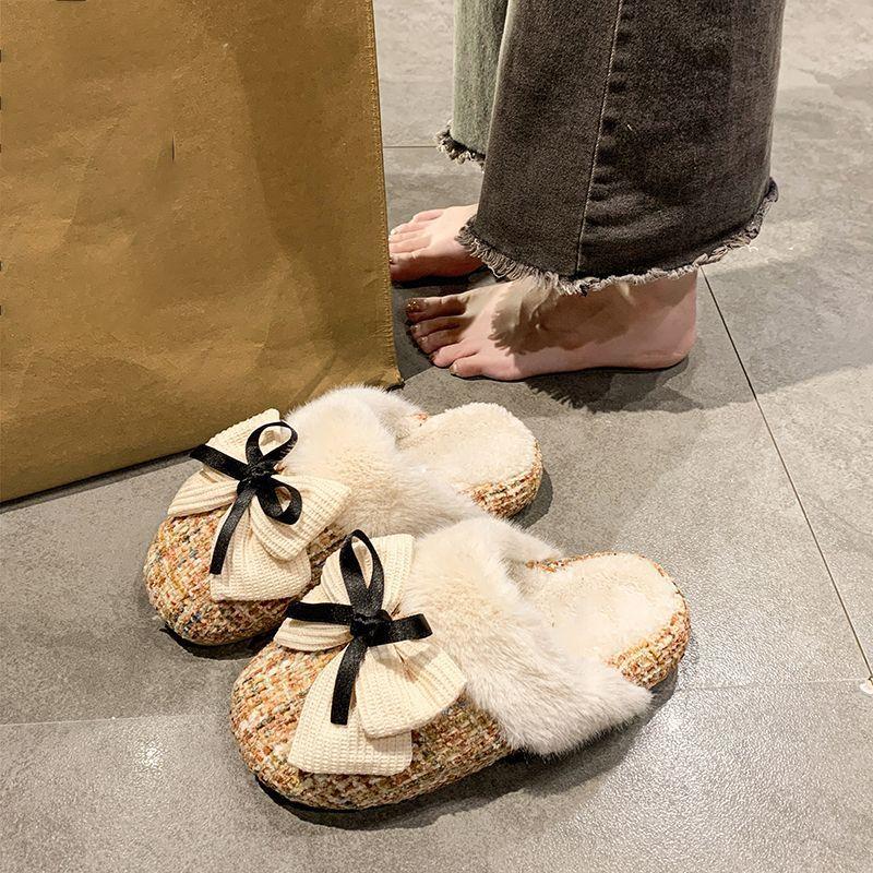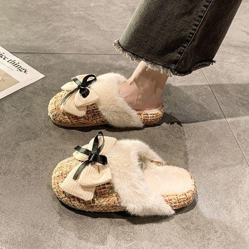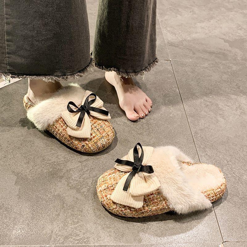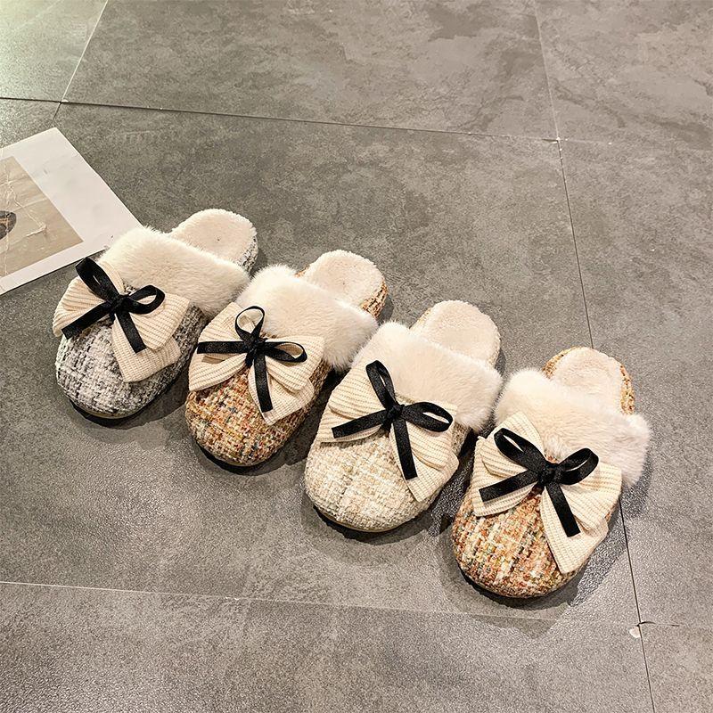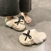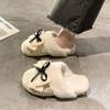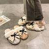Pantuflas de Algodón Cómodas para el Hogar para Mujer Estilo de Hada Lazo Pantuflas Peludas para Exterior 2025 Otoño e Invierno Nuevo Versátil de Suela Gruesa