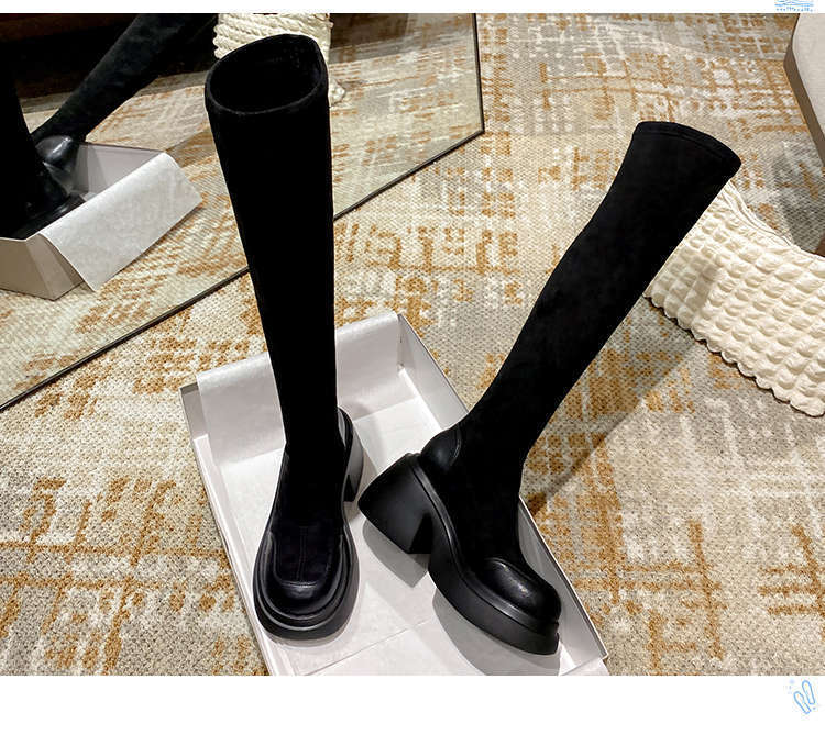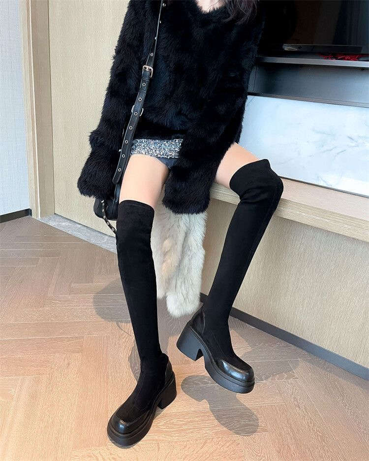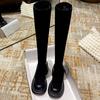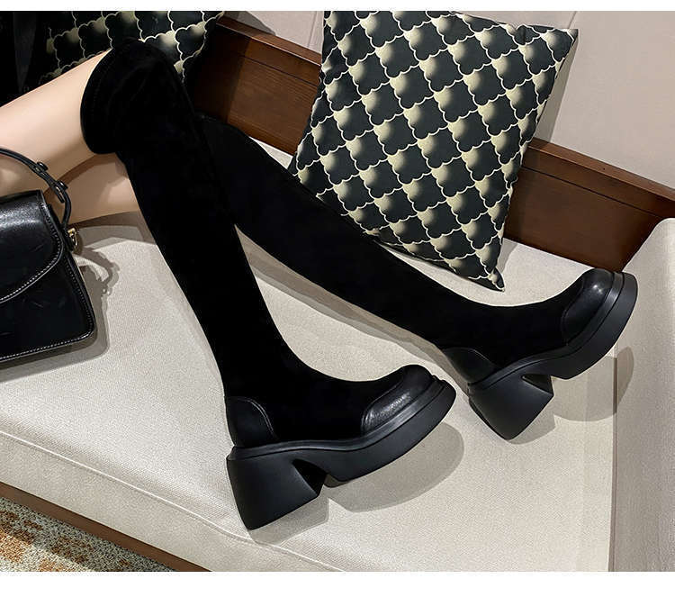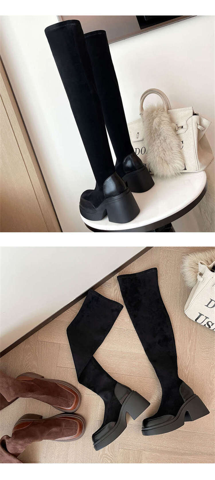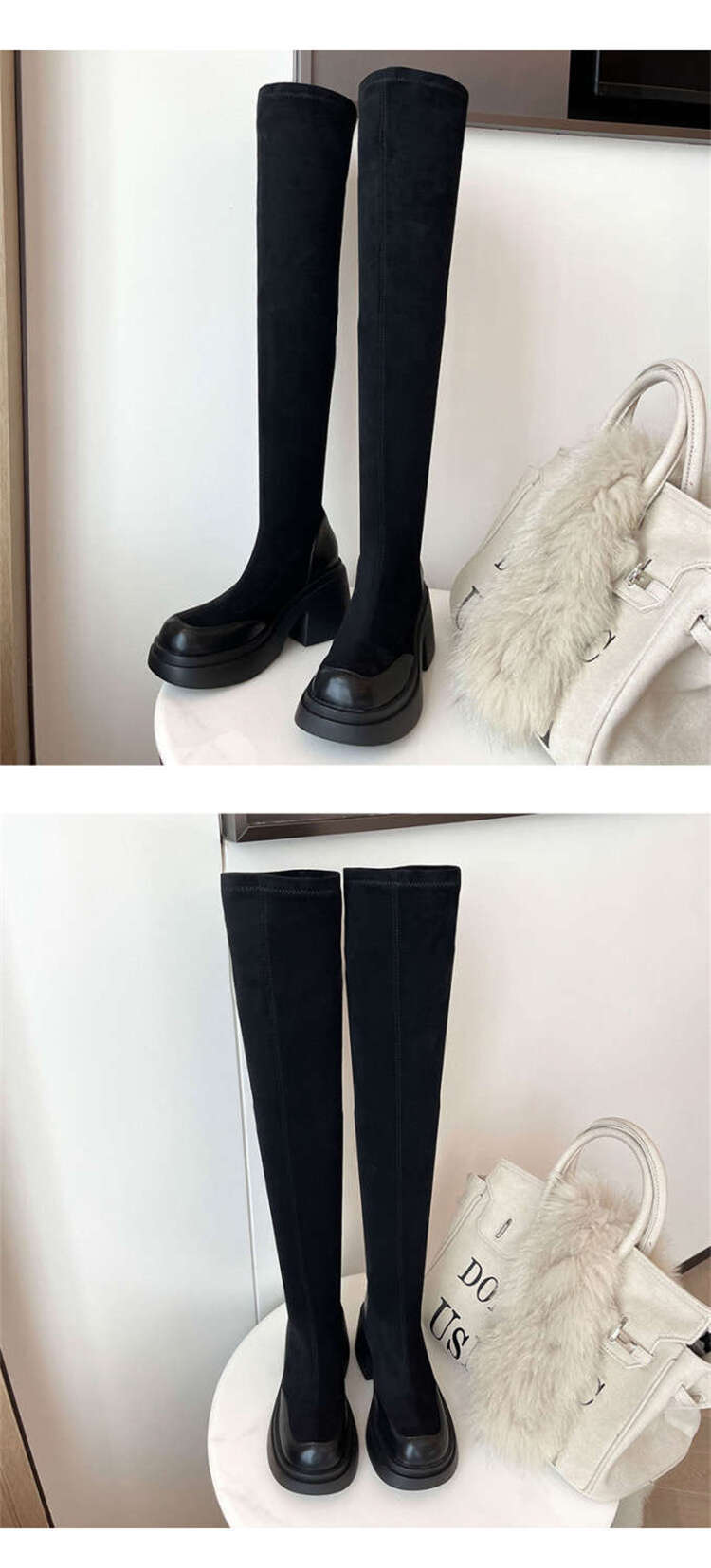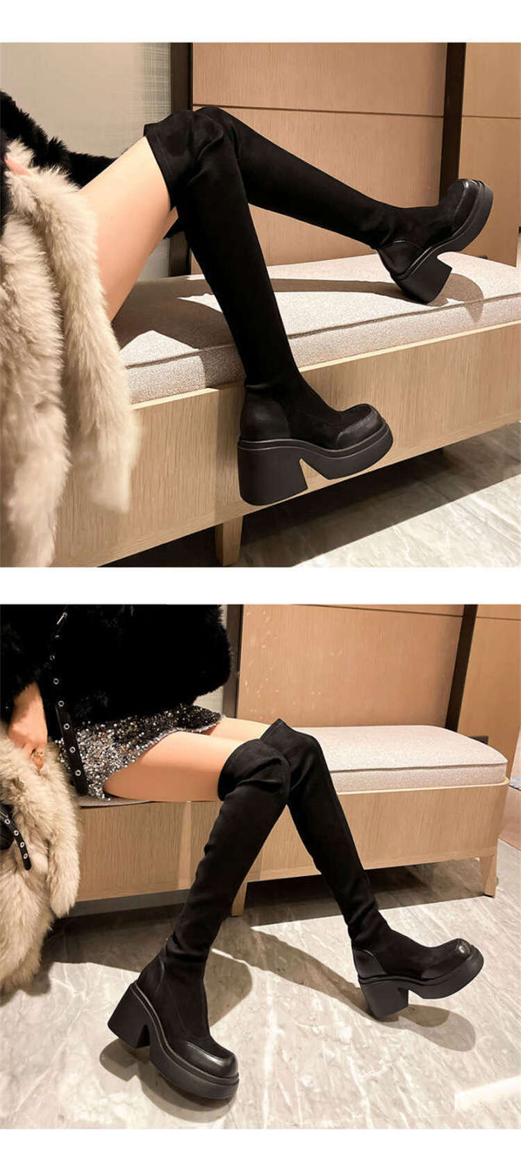 Botas Stretch de Gamuza Negra para Mujer 2025 Invierno Nuevo Tacón Grueso Chunky Botas Sobre la Rodilla Adelgazantes Botas tipo Calcetín Botas Largas