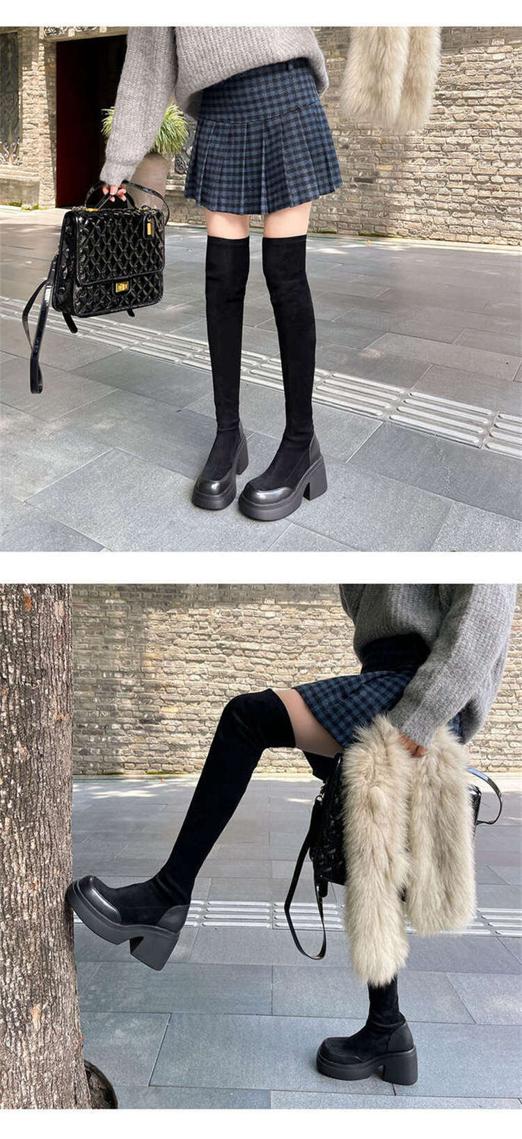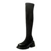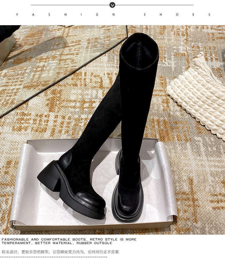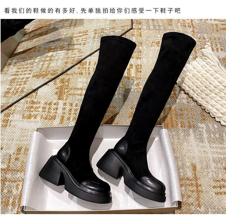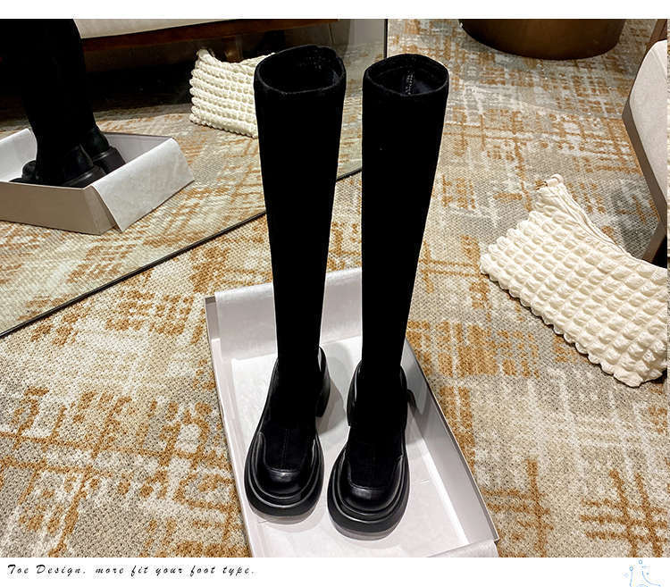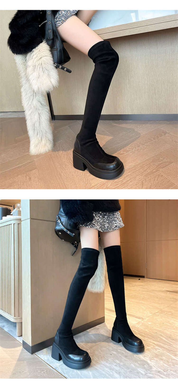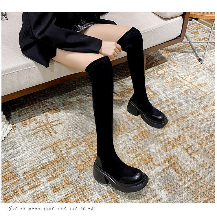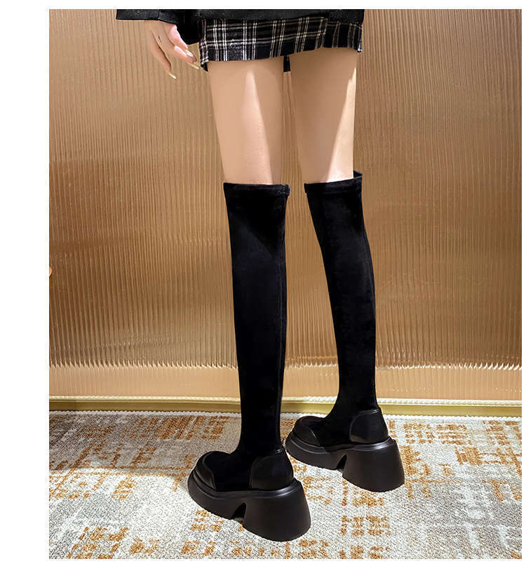 Botas Stretch de Gamuza Negra para Mujer 2025 Invierno Nuevo Tacón Grueso Chunky Botas Sobre la Rodilla Adelgazantes Botas tipo Calcetín Botas Largas
