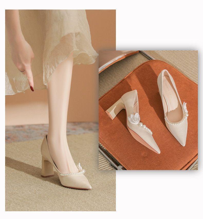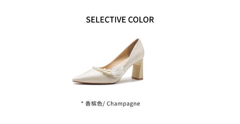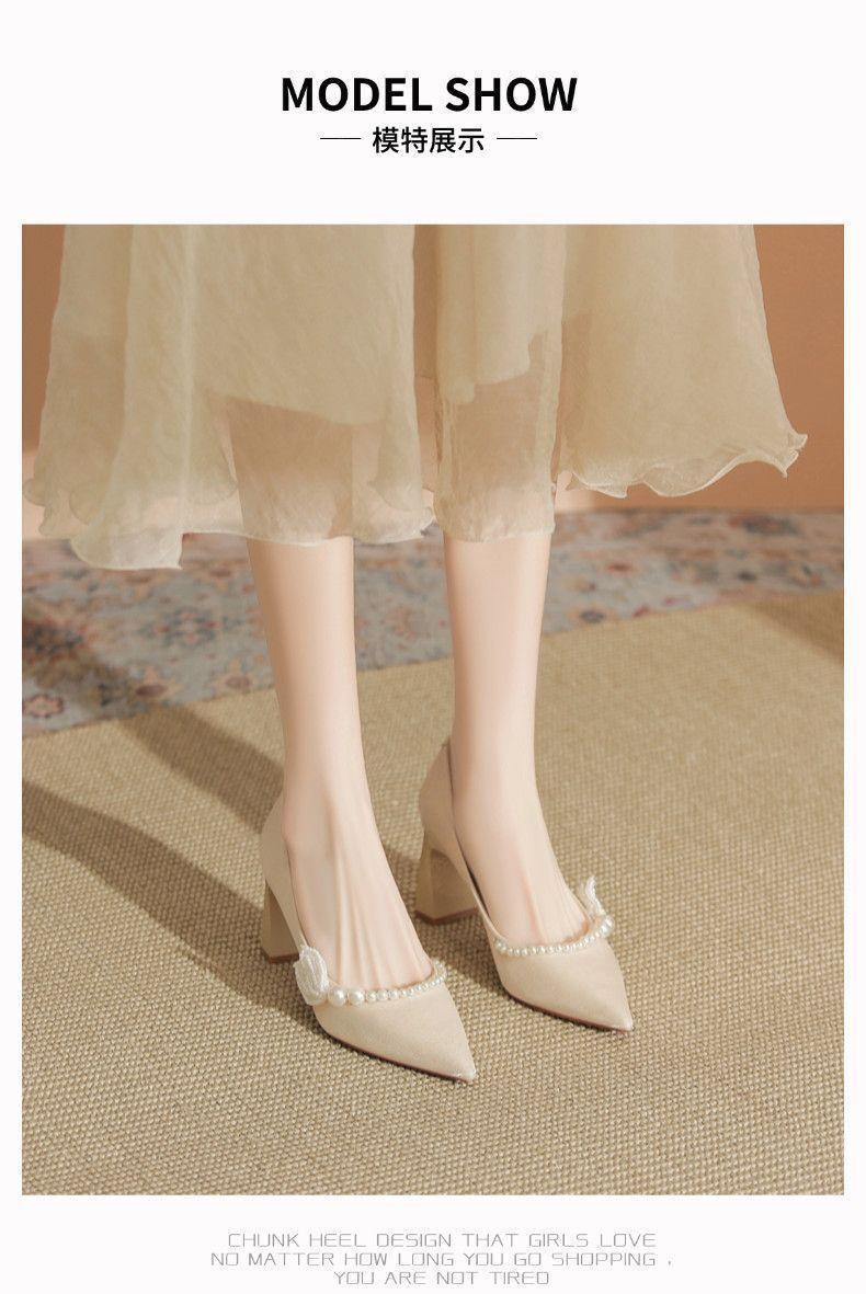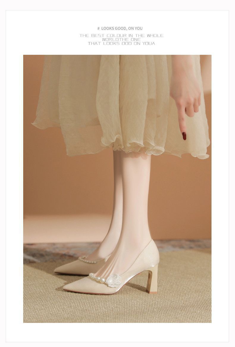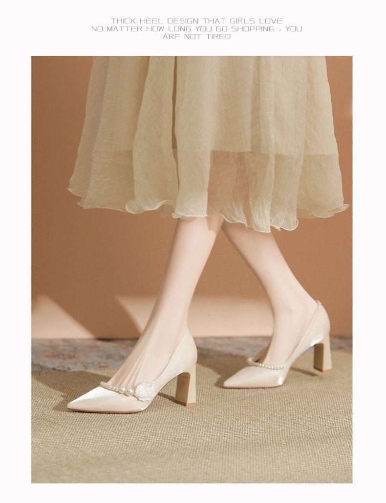 Zapatos de Boda Perlas Pies No Cansados Moda Tacones Altos Mujeres Tacón Ancho 2025 Verano Nuevo Color Champán Punta Afilada Zapatos Individuales Zapatos de Dama de Honor