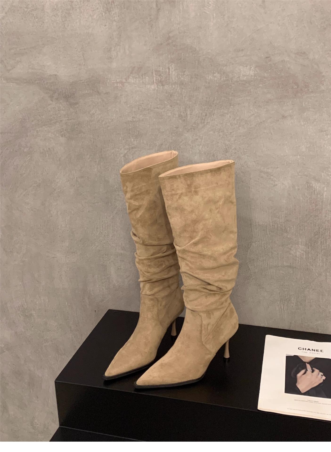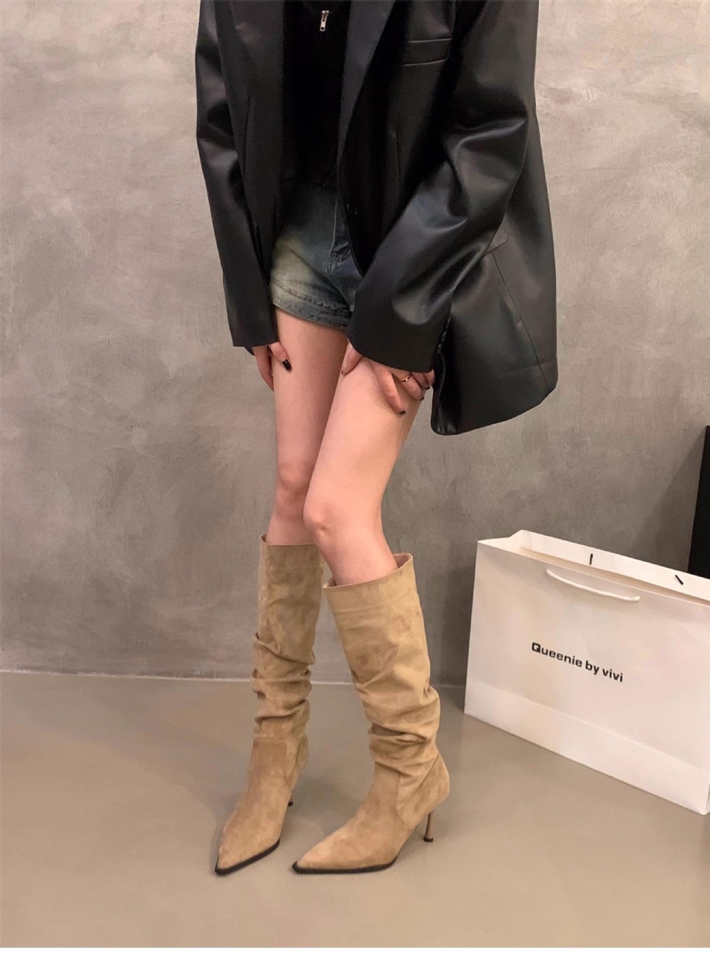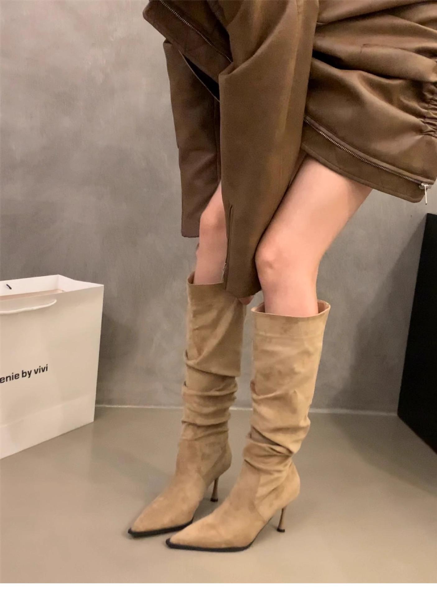 Botas Largas Caídas Caqui de Tacón Alto y Punta Afilada Zapatos de Mujer Otoño/Invierno 2025 Nuevas Botas Altas de Caballero Ajustadas de Ante