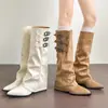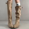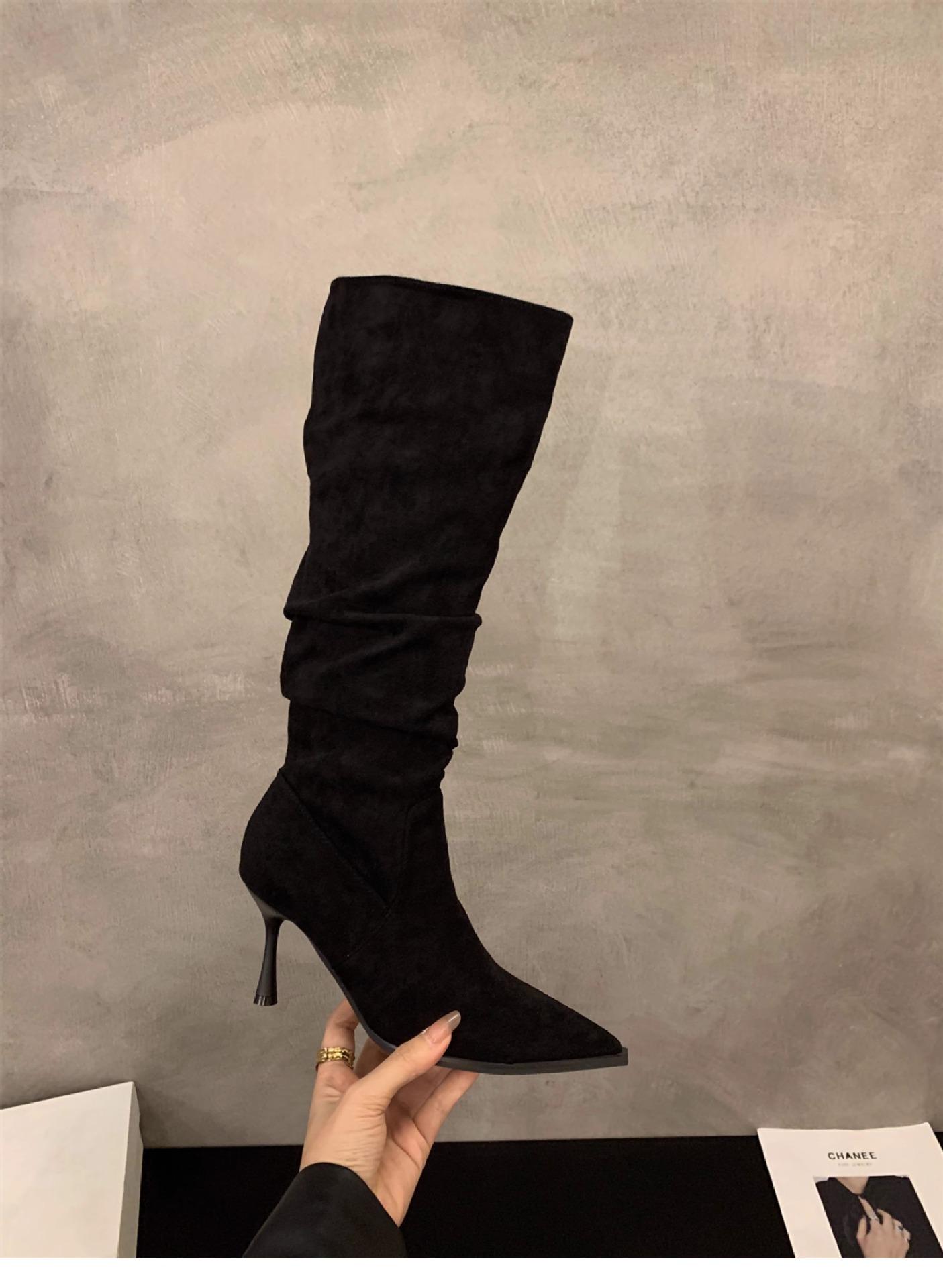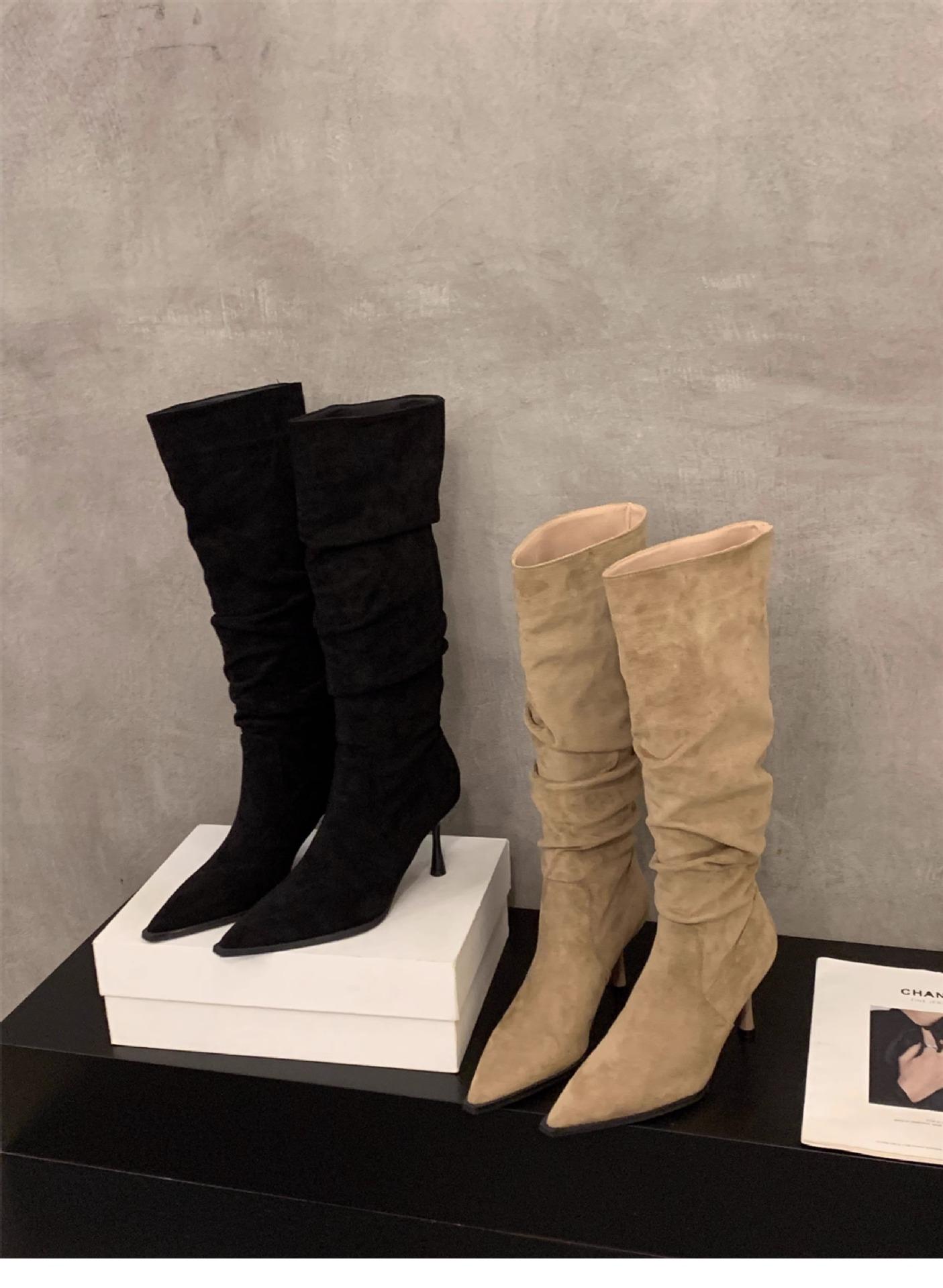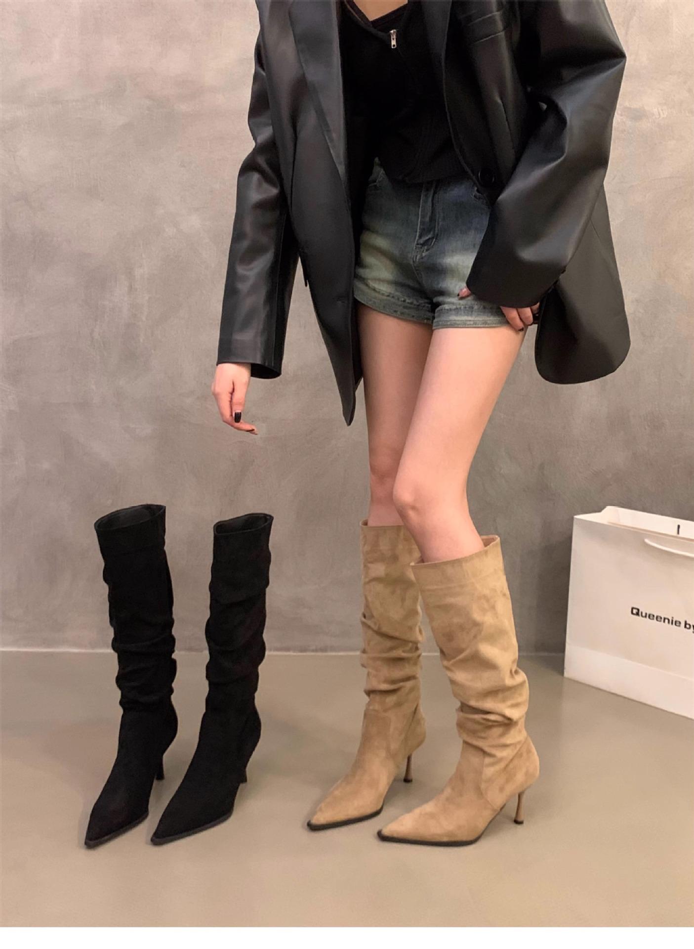 Botas Largas Caídas Caqui de Tacón Alto y Punta Afilada Zapatos de Mujer Otoño/Invierno 2025 Nuevas Botas Altas de Caballero Ajustadas de Ante