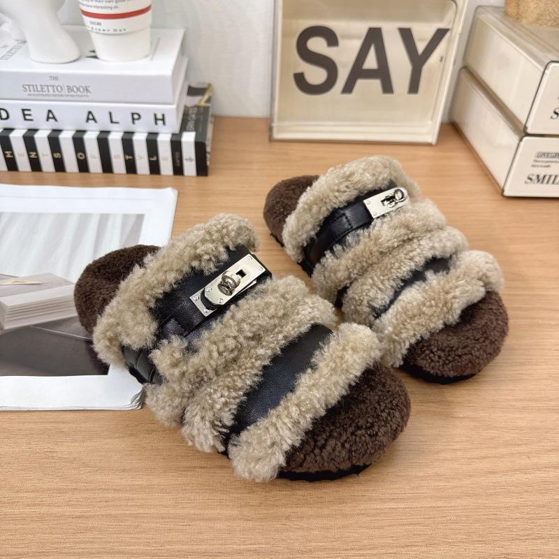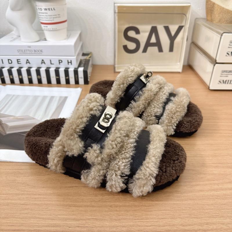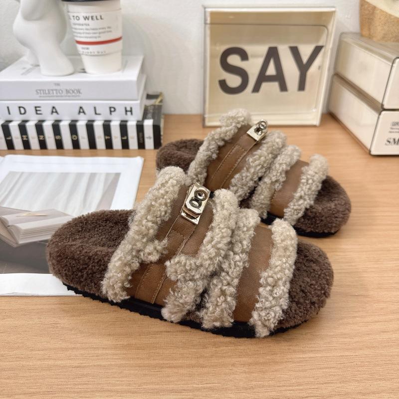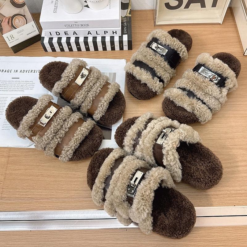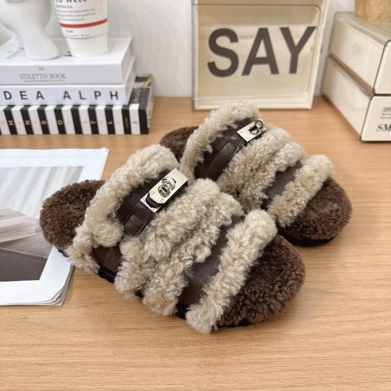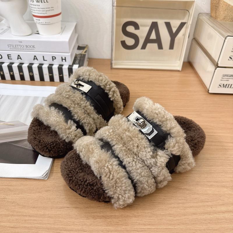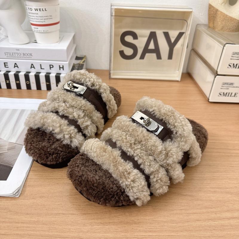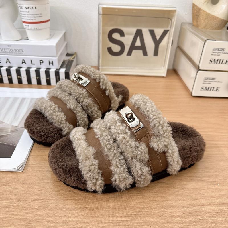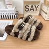 Otoño 2025 Nueva Moda Zapatos Peludos de Suela Gruesa Zapatillas de Exterior de Una Tira para Mujer