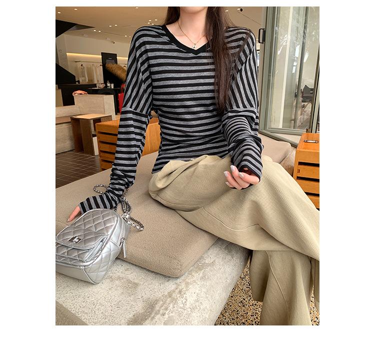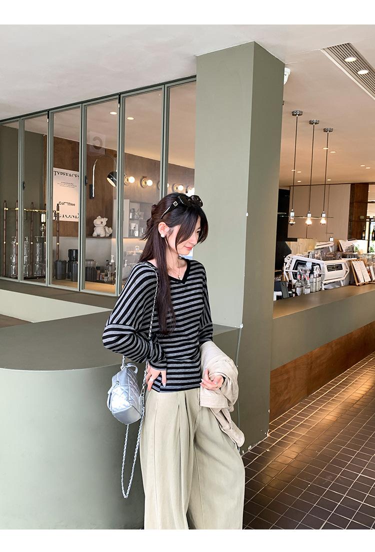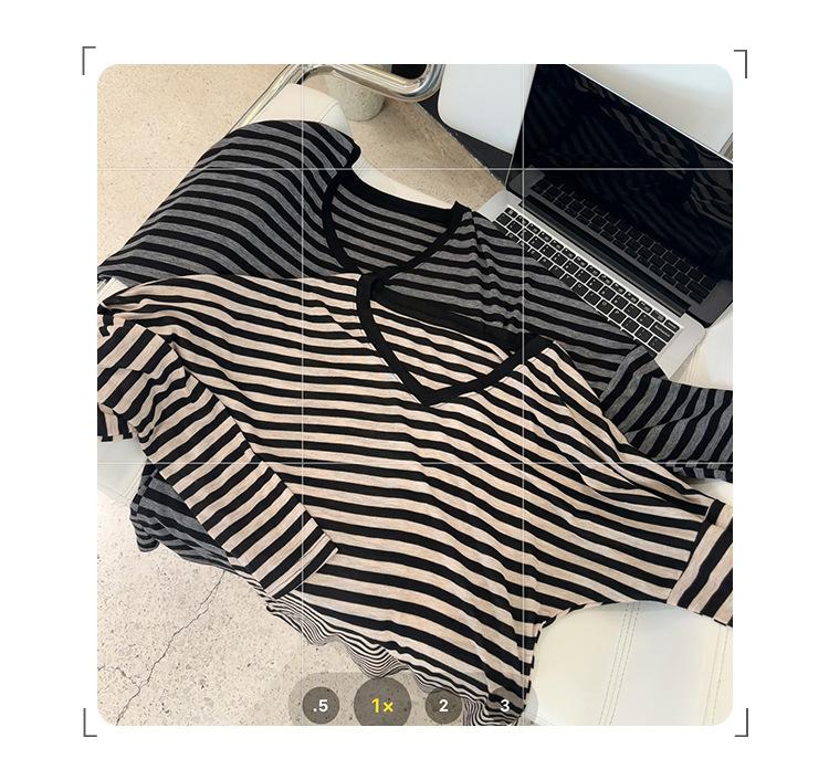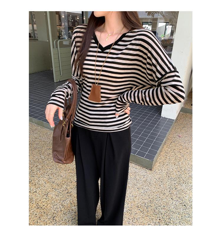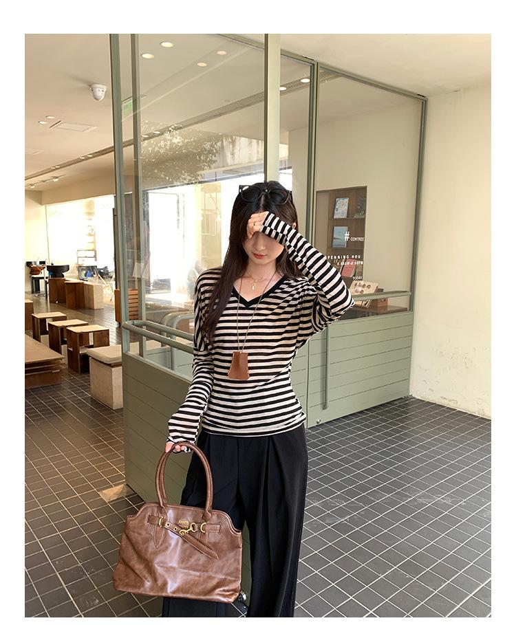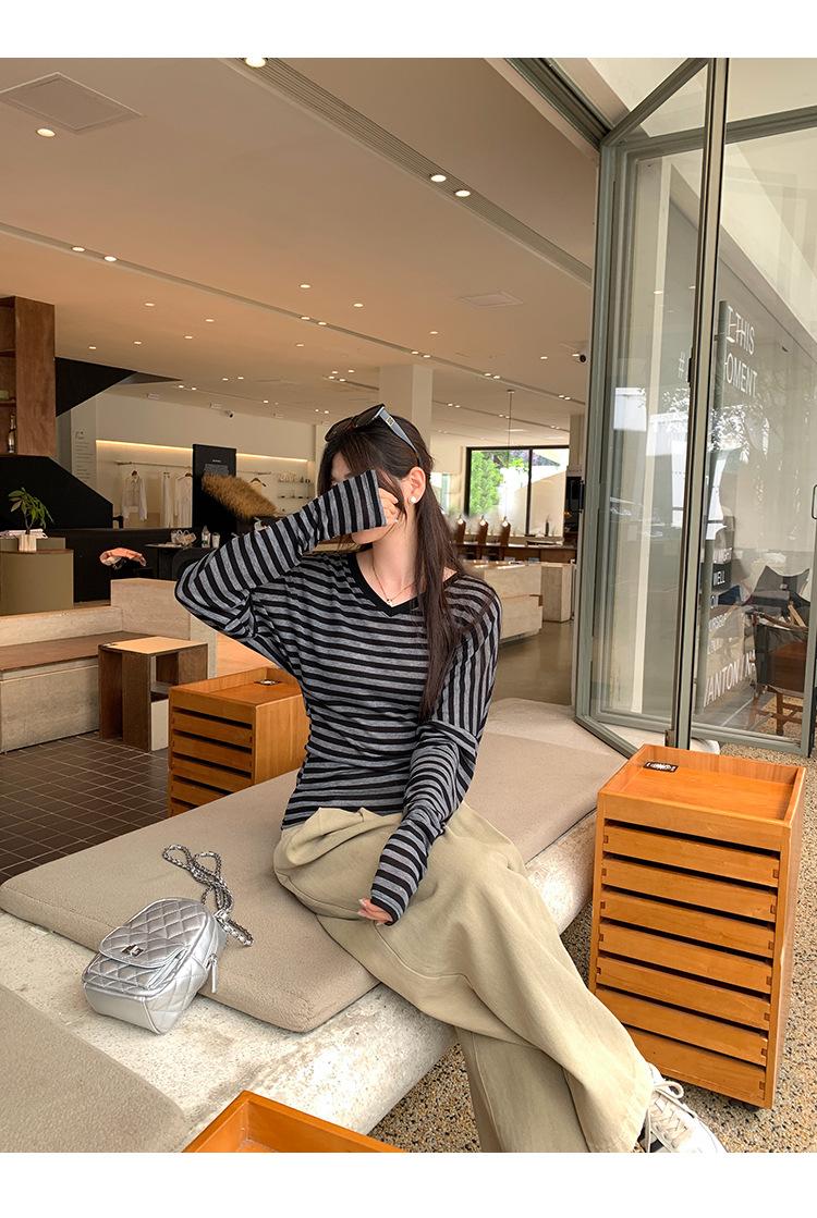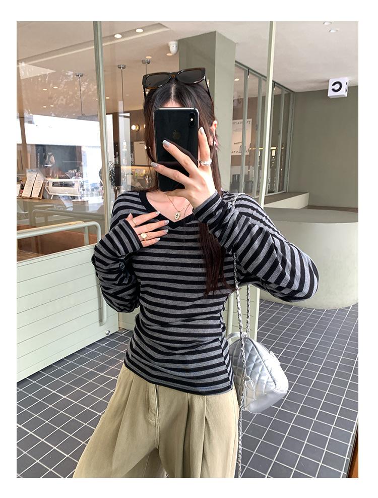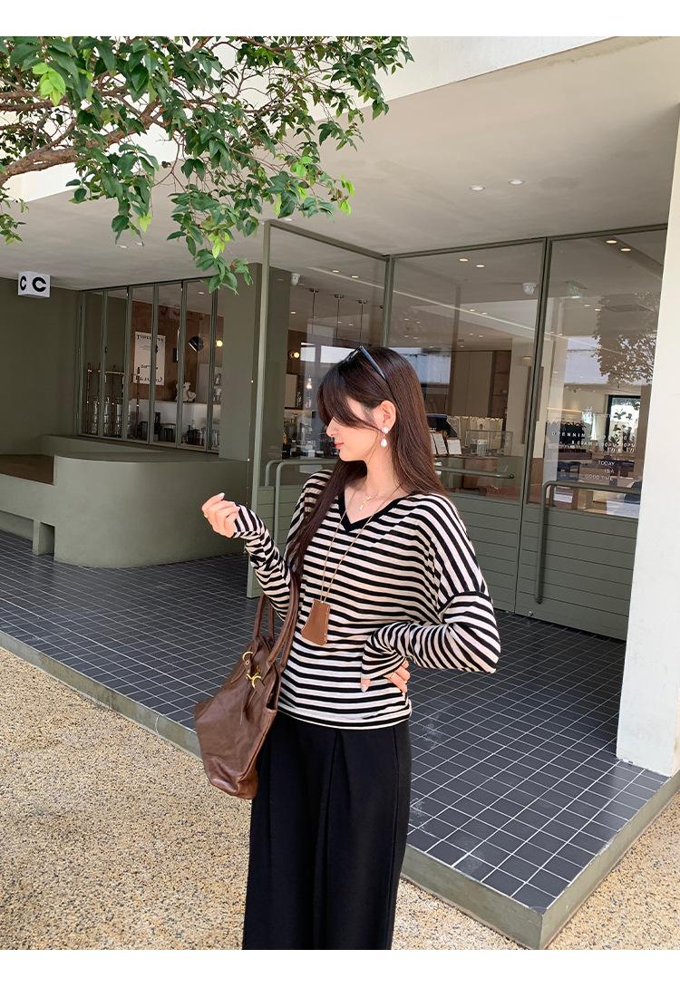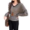 Playera Francesa Hot Girl Cuello en V Manga Larga Mujer Otoño 2025 Nueva Diseño Coreano Sentido Chic Rayada Versátil Top