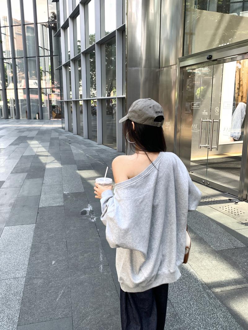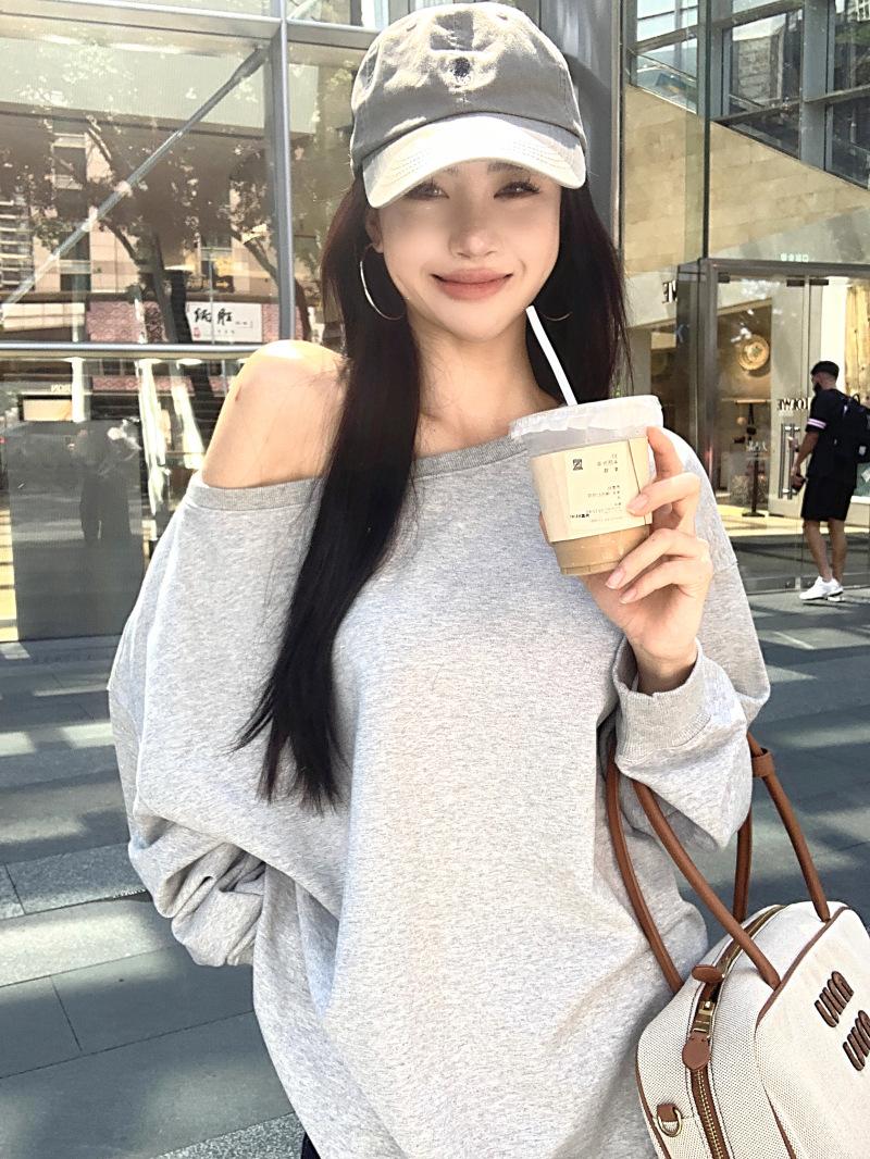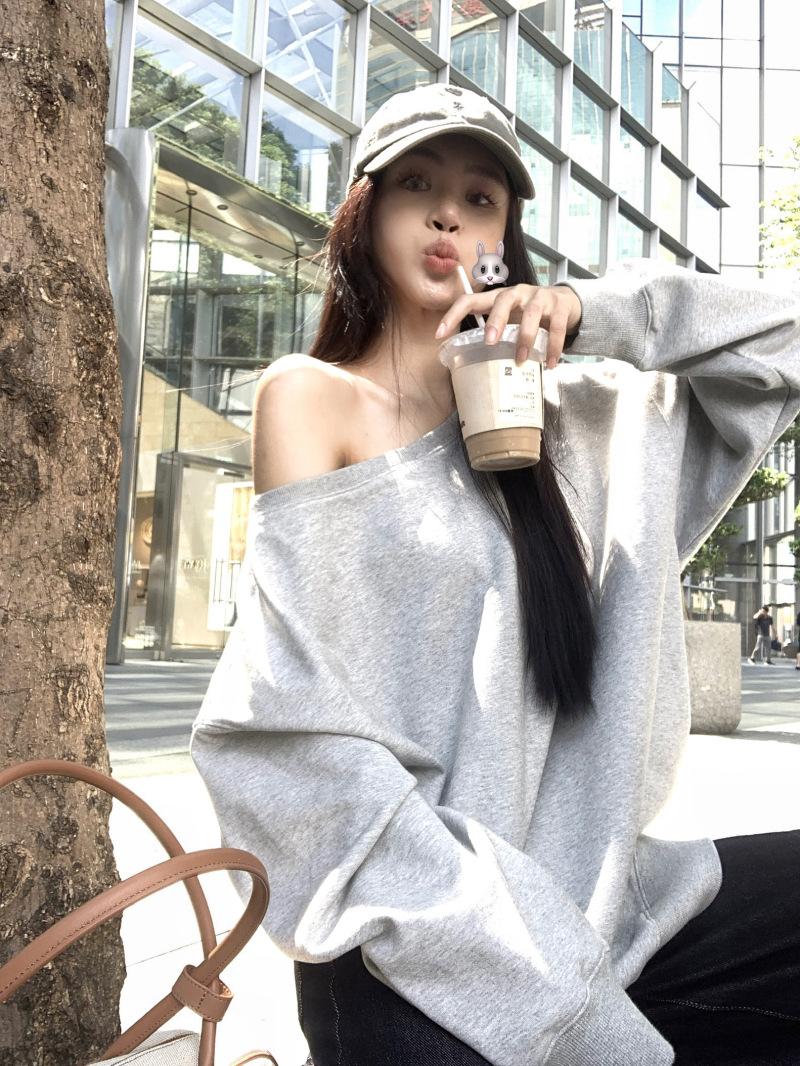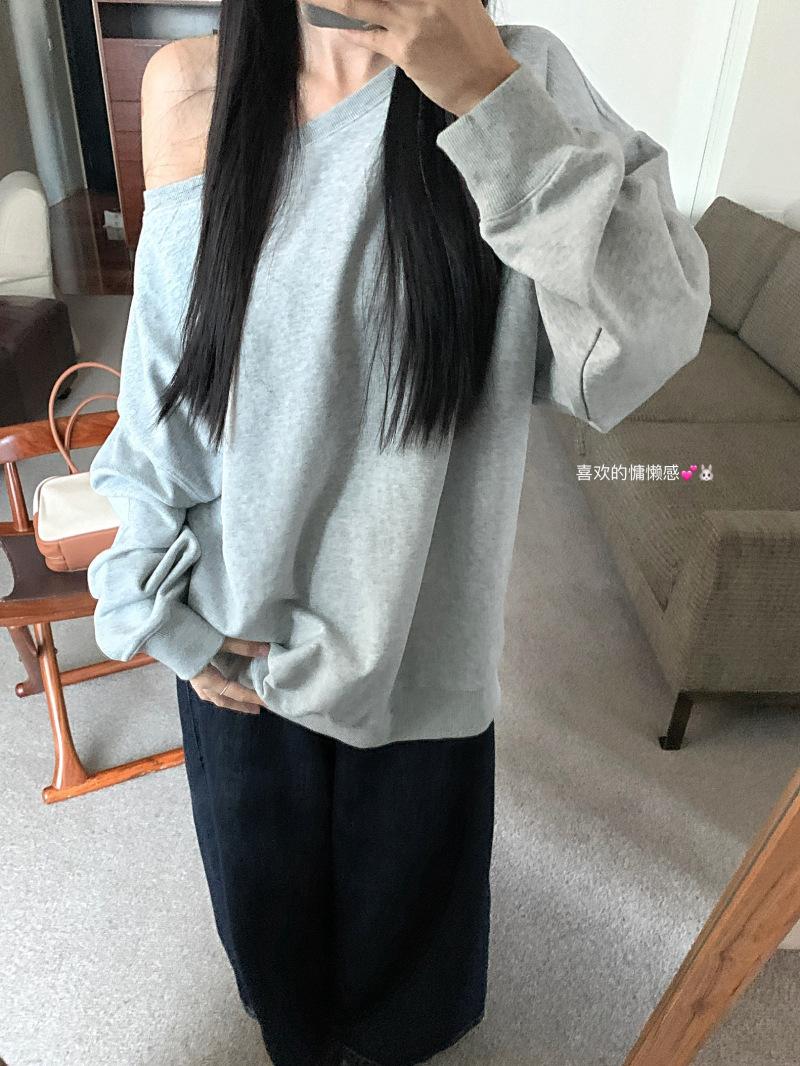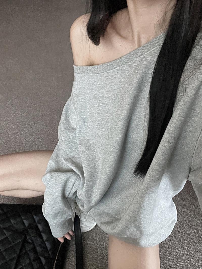 Sudadera de Hombro Caído Gris de Tiro Real para Mujer Otoño 2024 Nuevo Top de Hombro Caído Holgado
