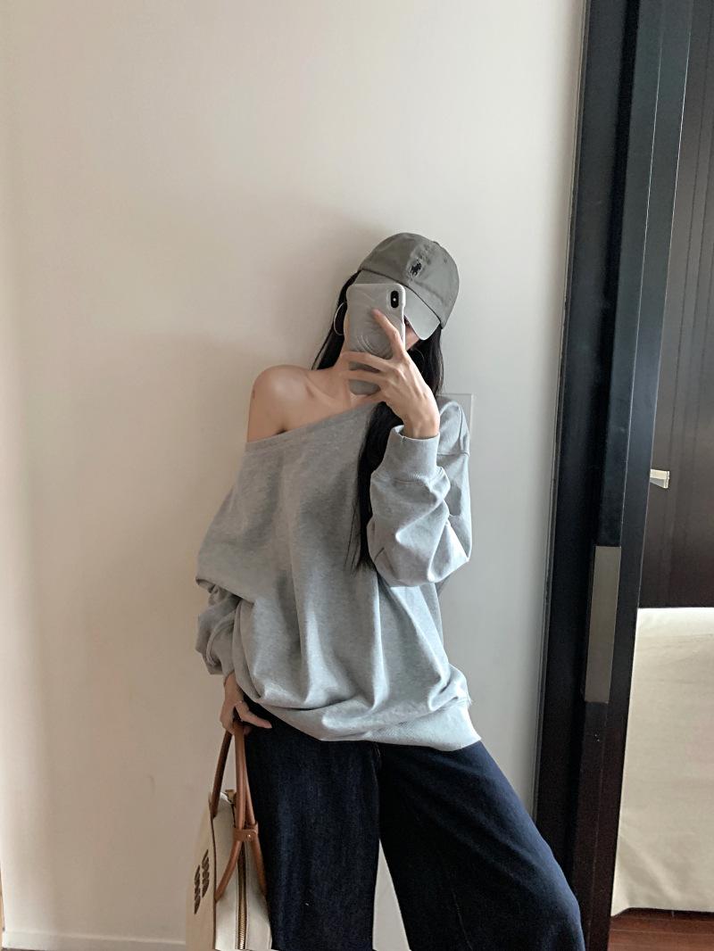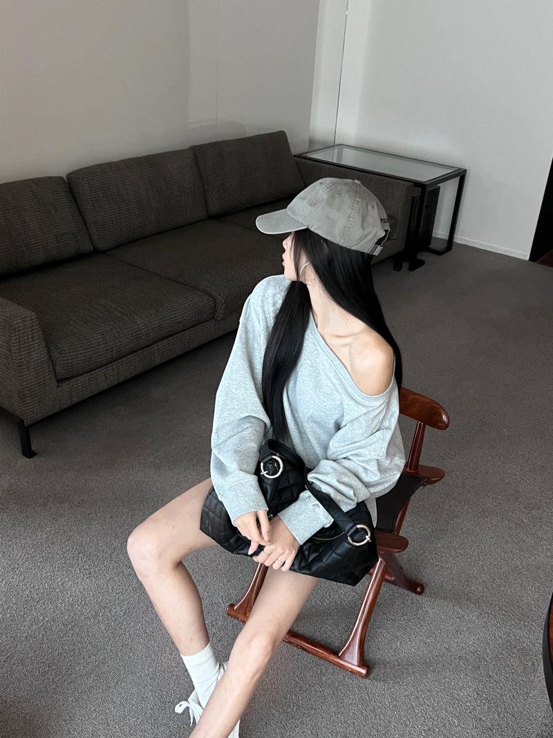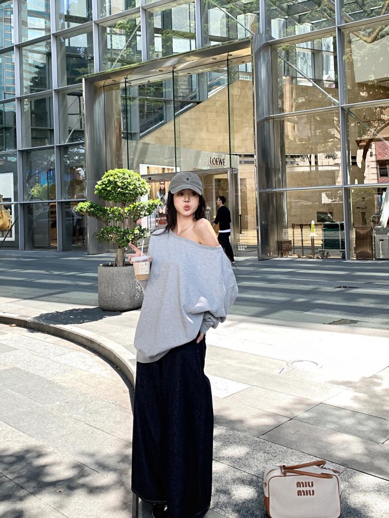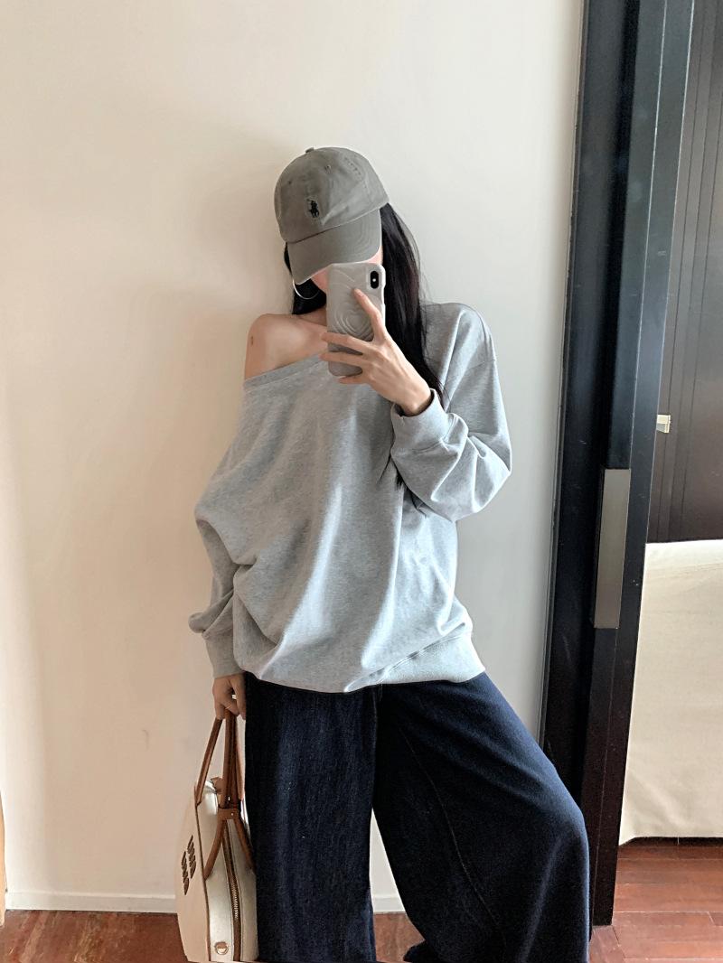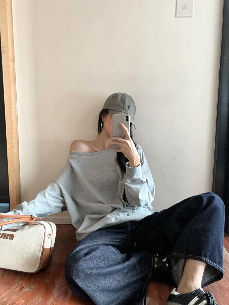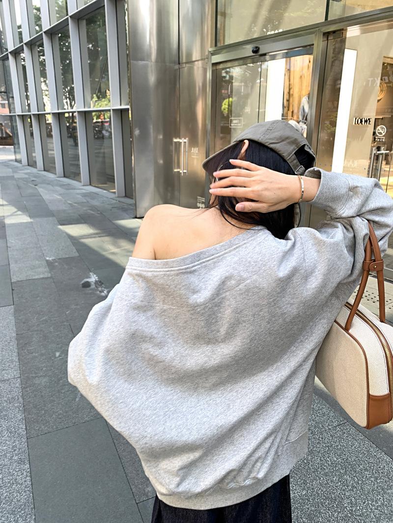 Sudadera de Hombro Caído Gris de Tiro Real para Mujer Otoño 2024 Nuevo Top de Hombro Caído Holgado