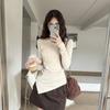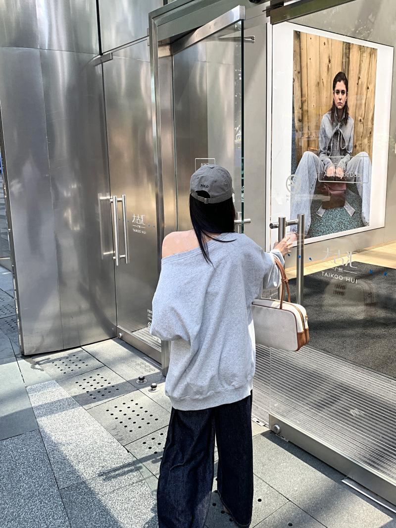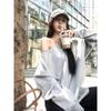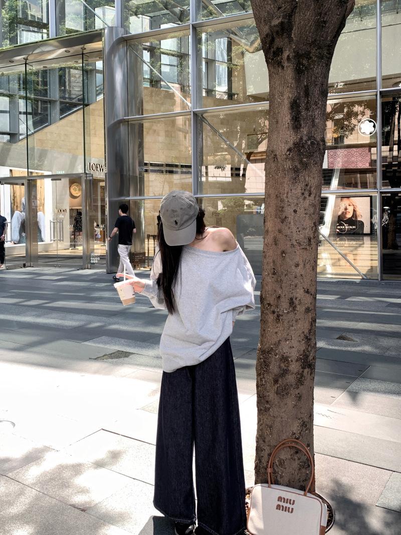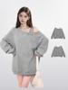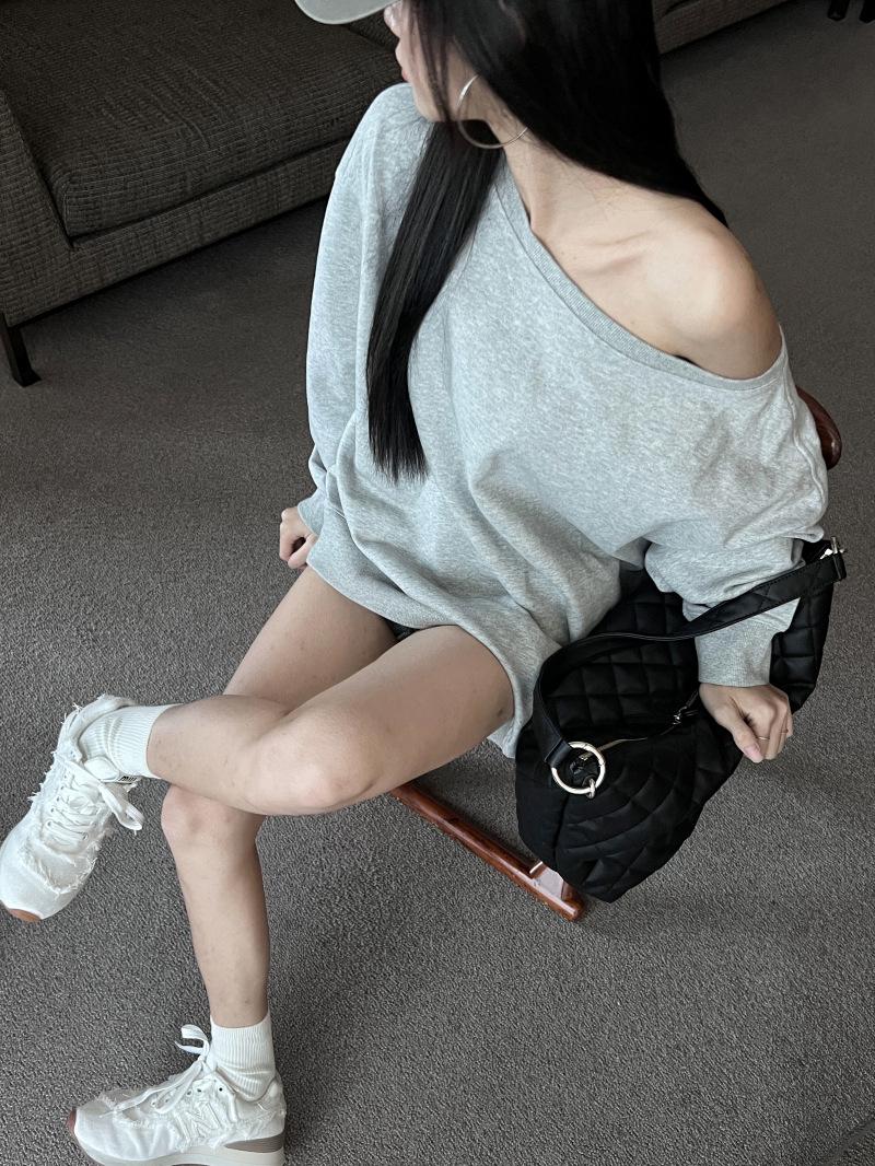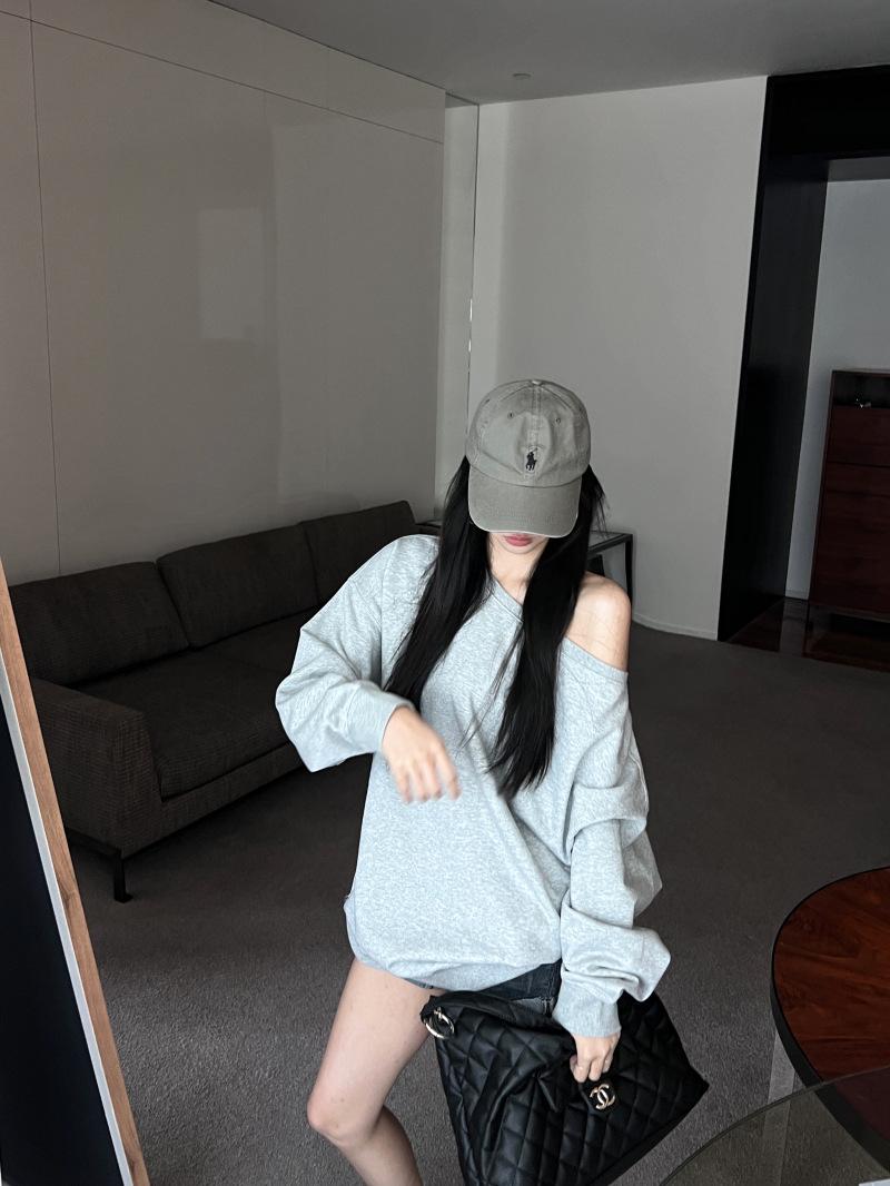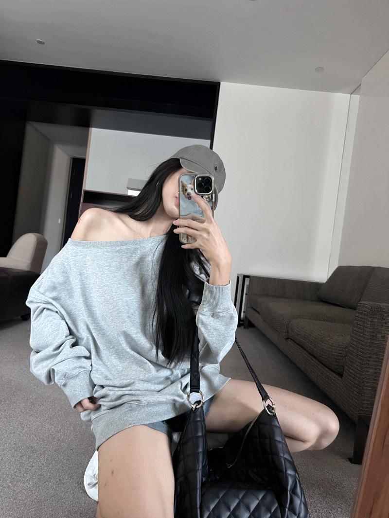 Sudadera de Hombro Caído Gris de Tiro Real para Mujer Otoño 2024 Nuevo Top de Hombro Caído Holgado