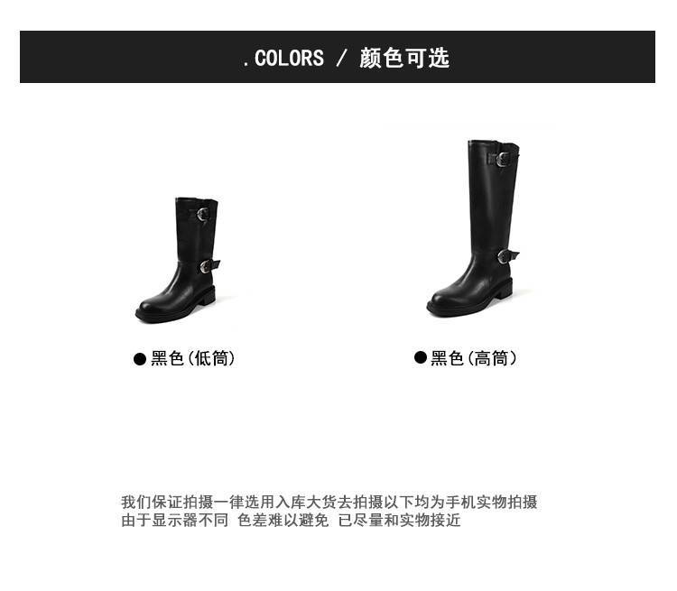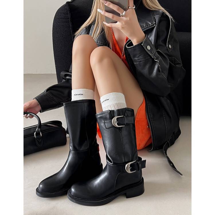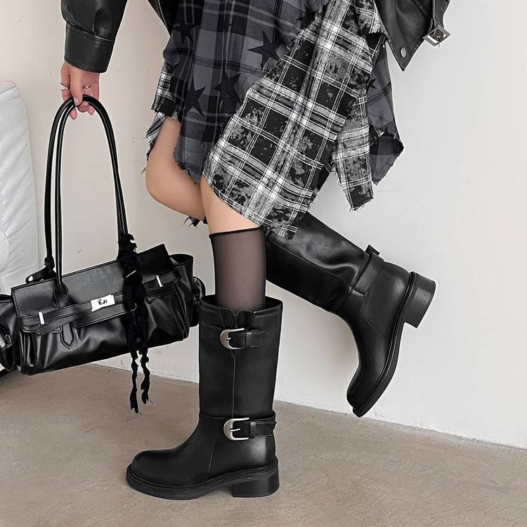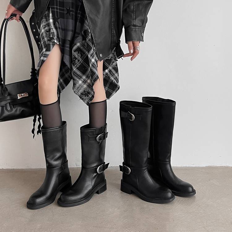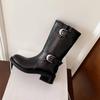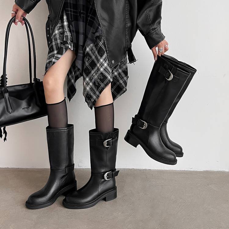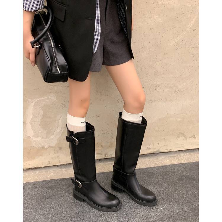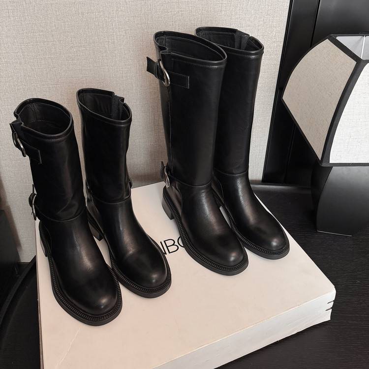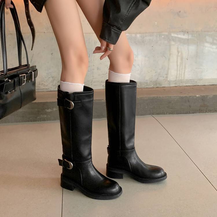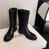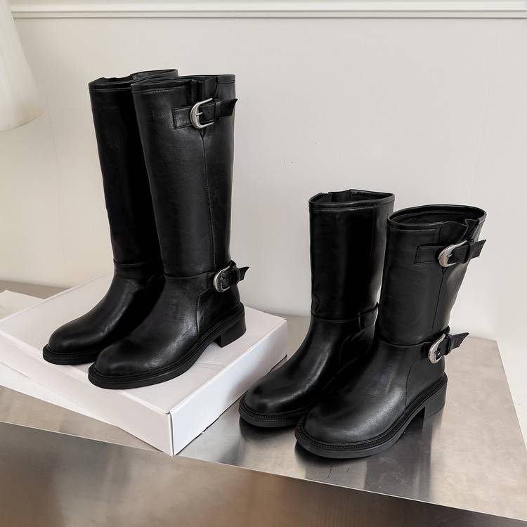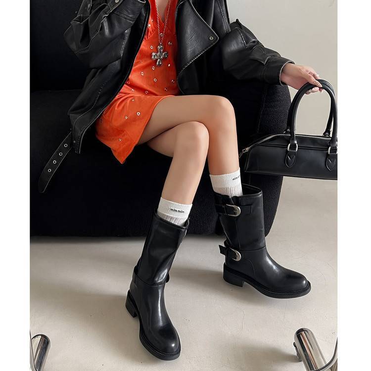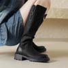 Botas de Cuero para Mujer Nuevas Punta Redonda Versátiles Talla Grande Botas para Mujer Tacón Medio Punta Redonda Suela Gruesa de Goma Botas de Caña Alta Cuero Genuino Botas de Caballero