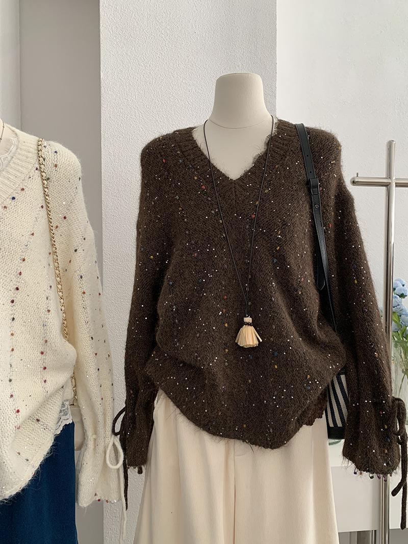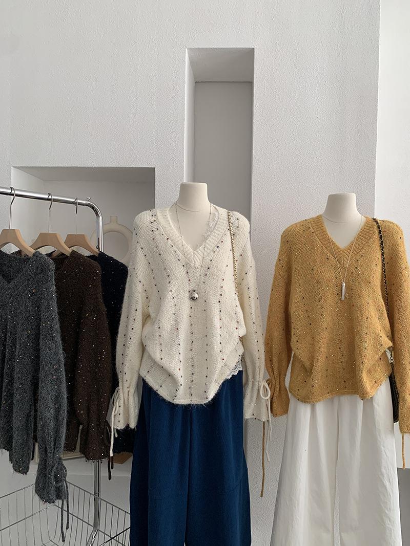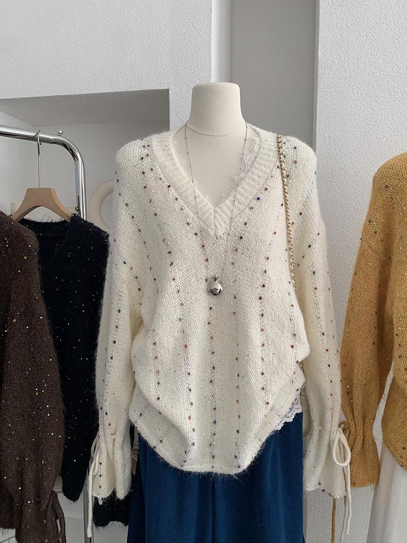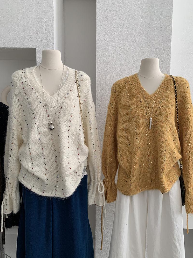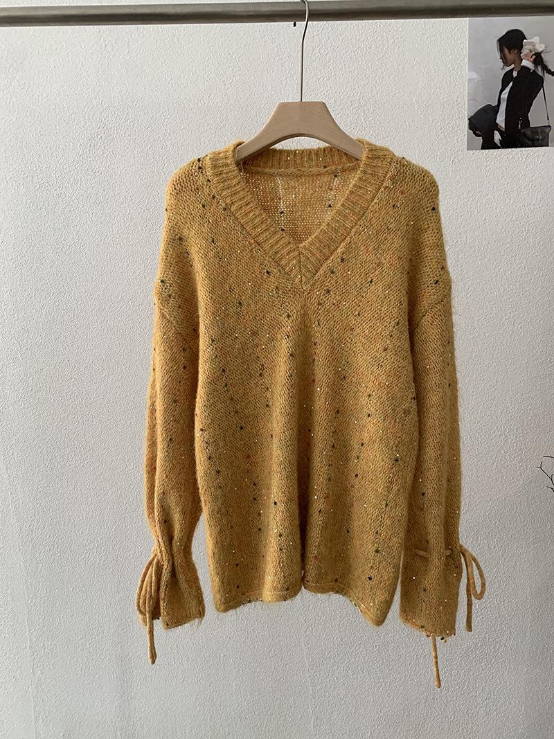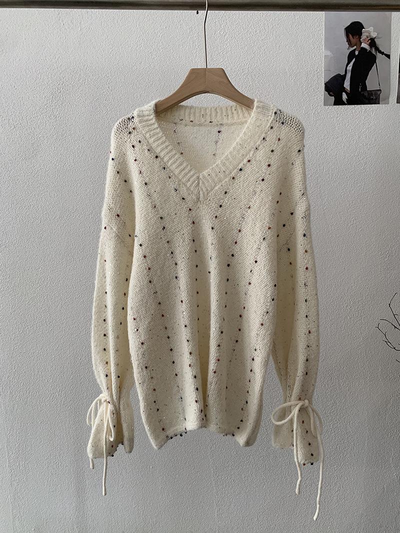 Suéter de Punto Cuello en V Punto de Color Oumaile para Mujer Otoño Nuevo Estilo Dulce Manga Larga Acampanada Top Holgado 4908