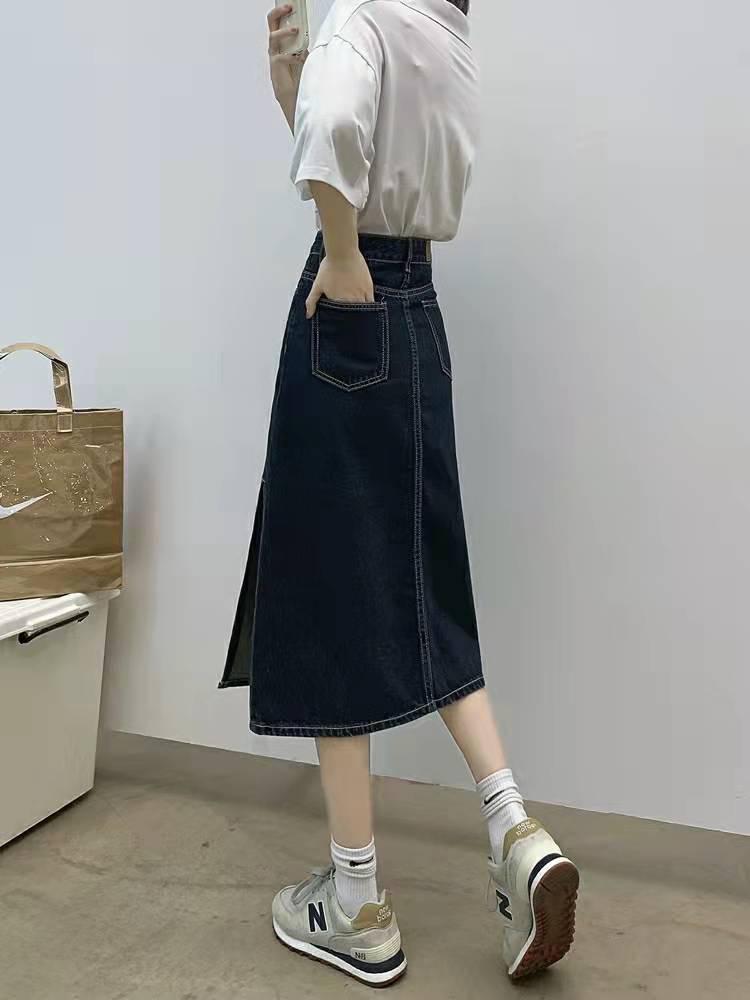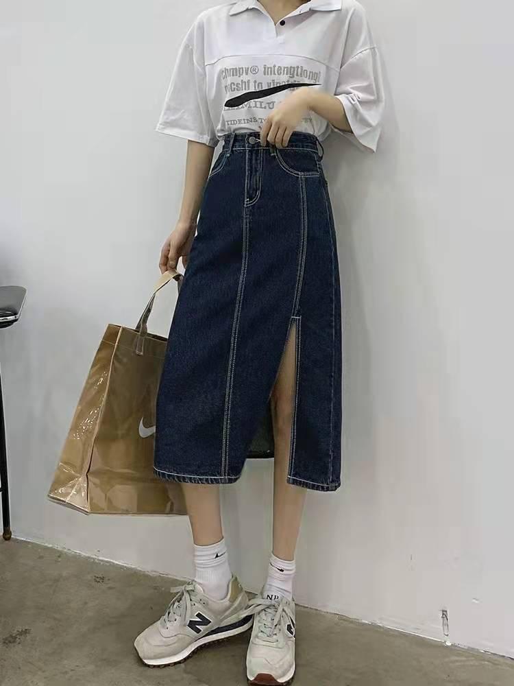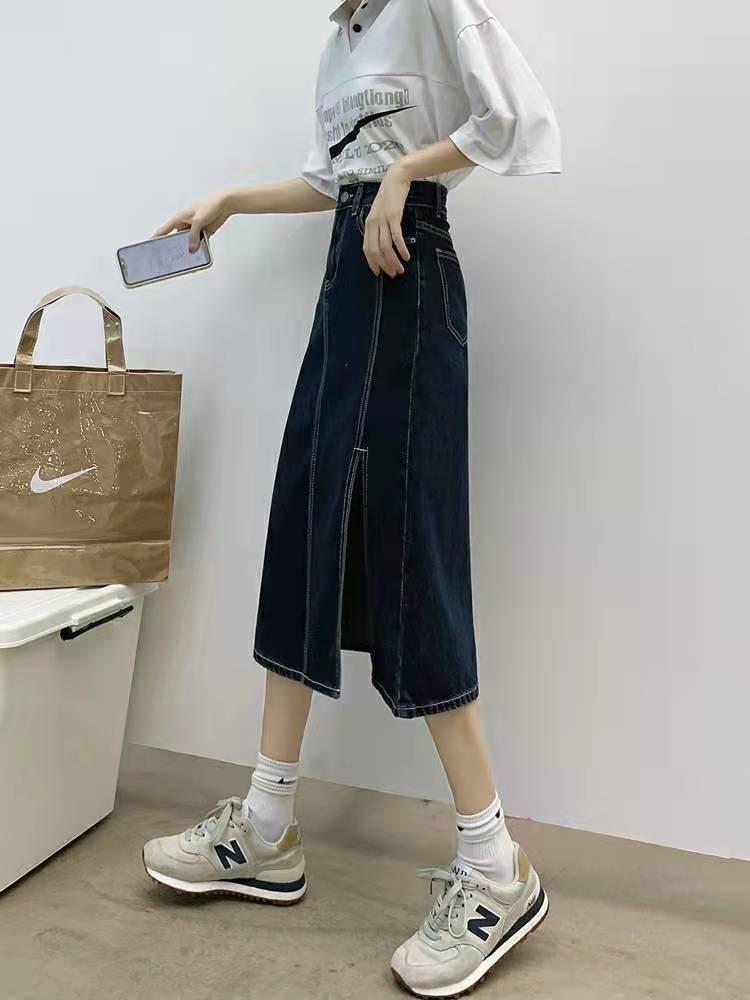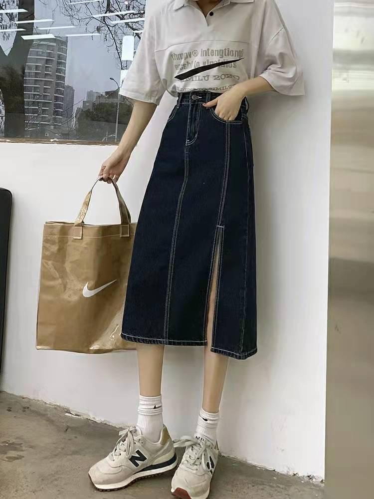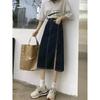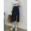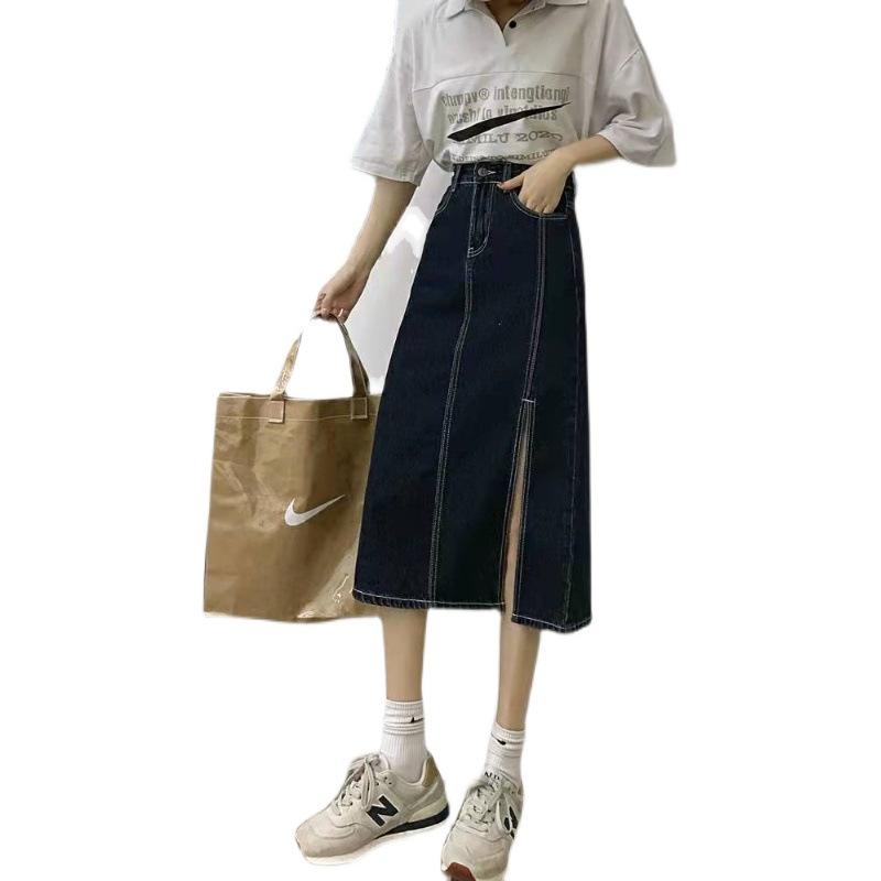 2023 nueva falda vaquera de verano de cintura alta para mujer adelgazante estilo coreano con abertura en la cadera de largo medio falda línea A