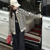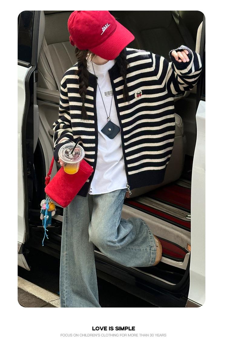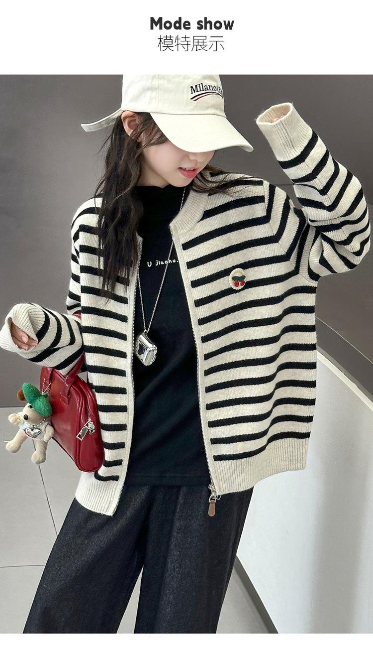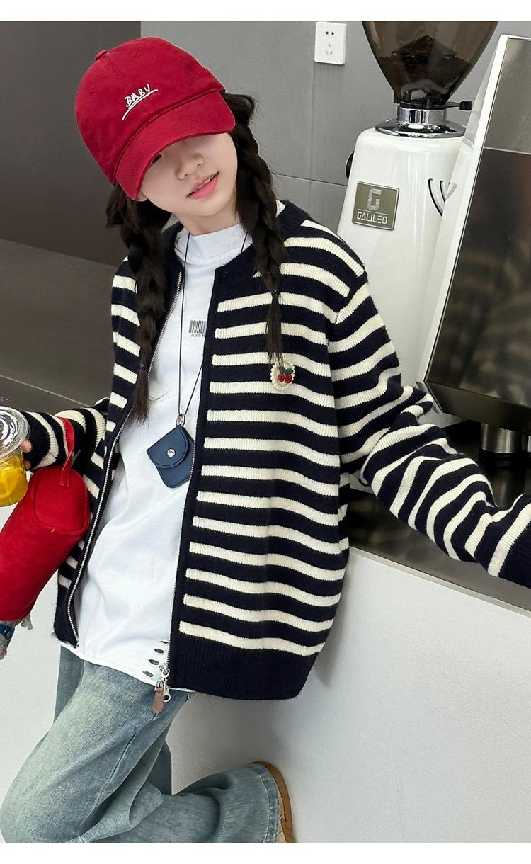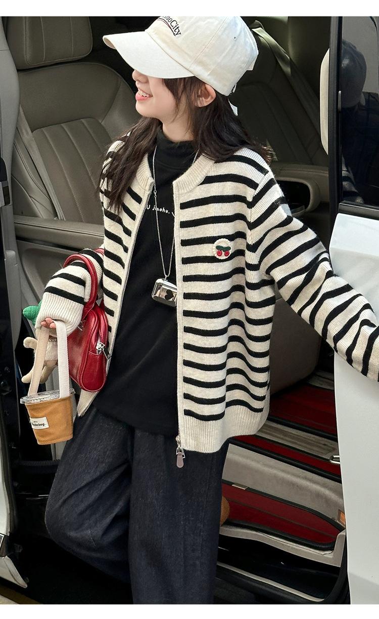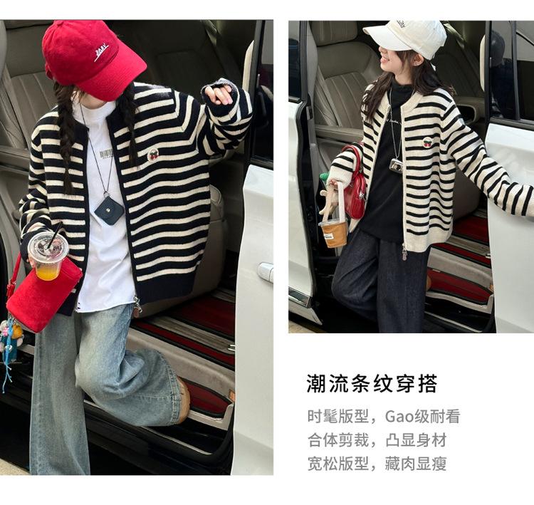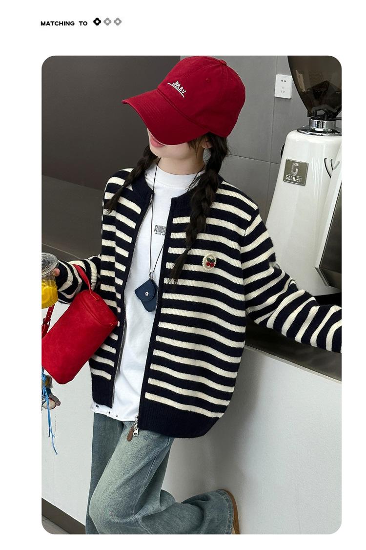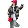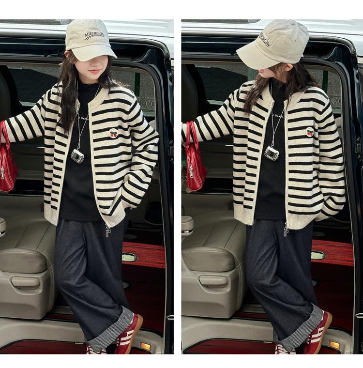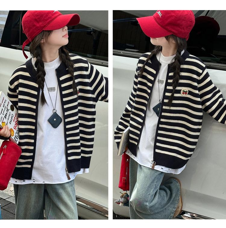 Abrigo para niña estilo primavera y otoño 2025 nuevo suéter de punto a rayas de moda para niños ropa de otoño para niña top de cuello redondo marea