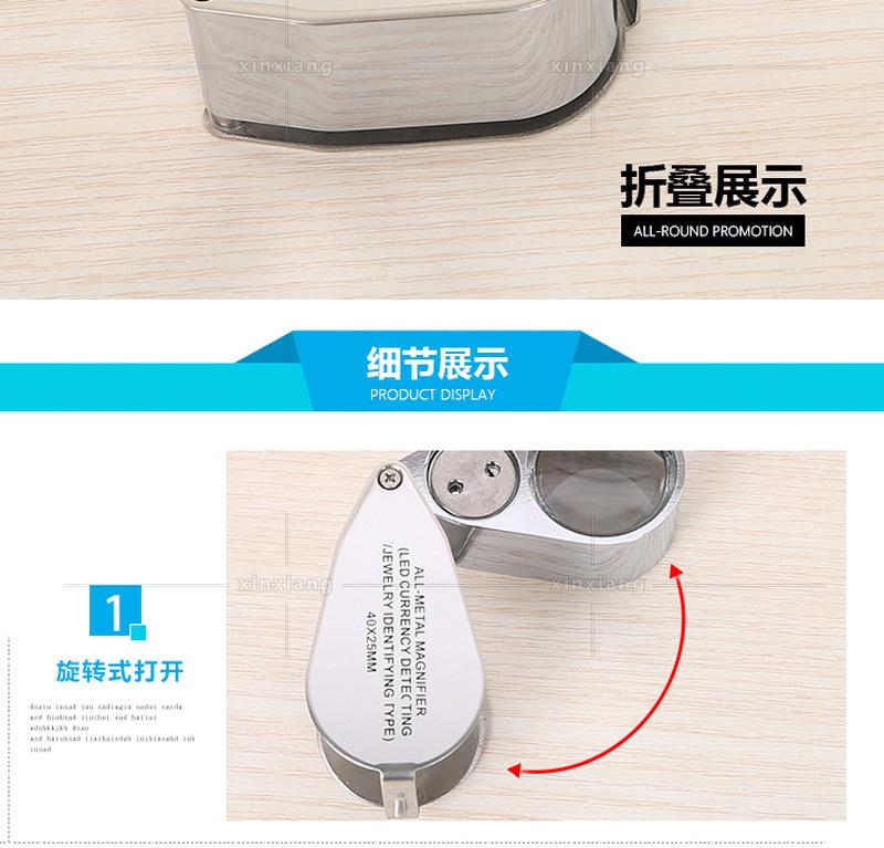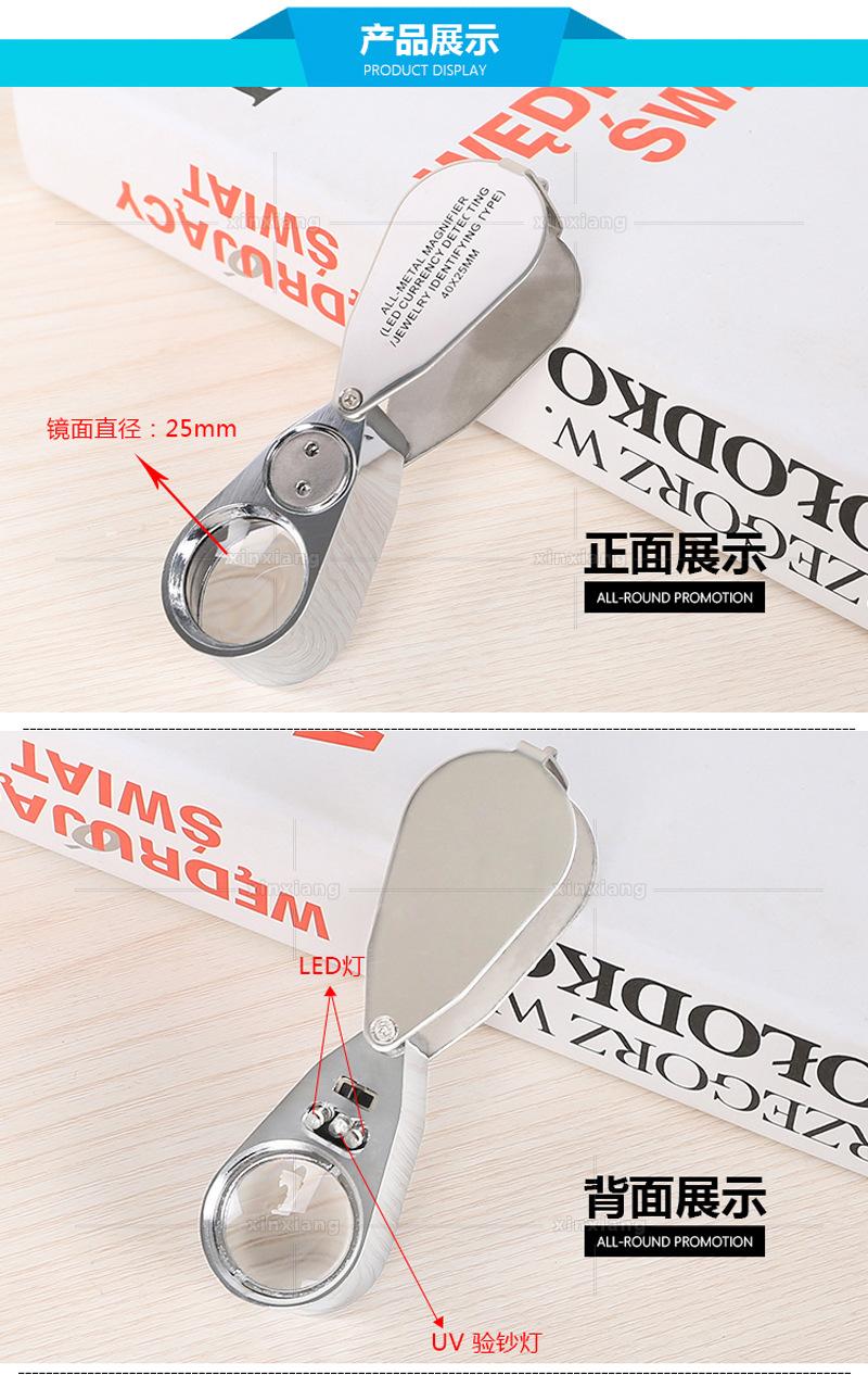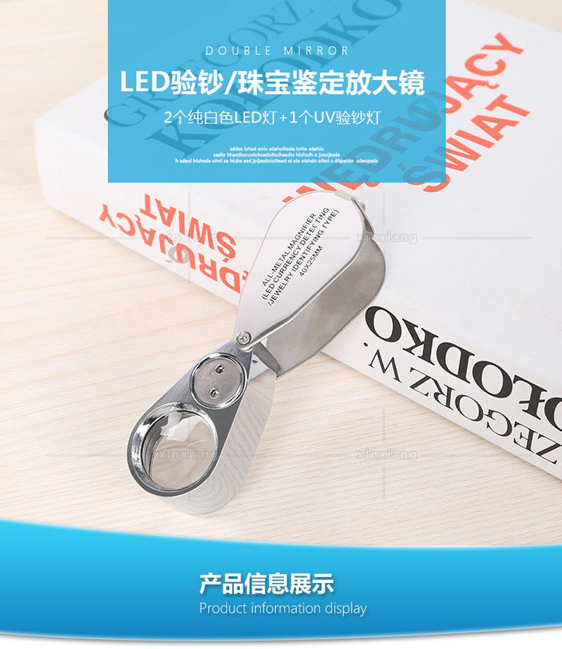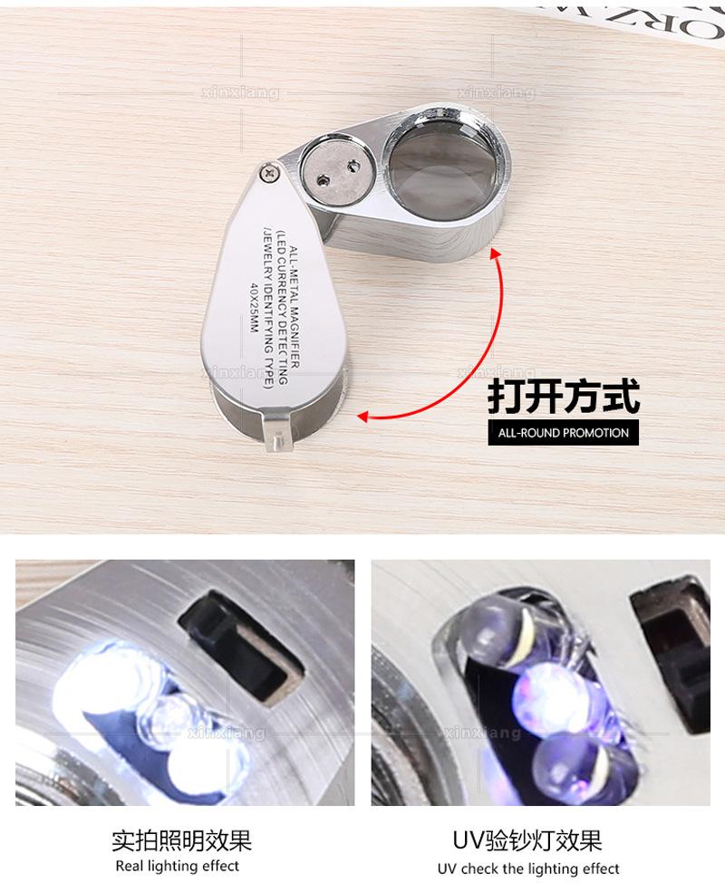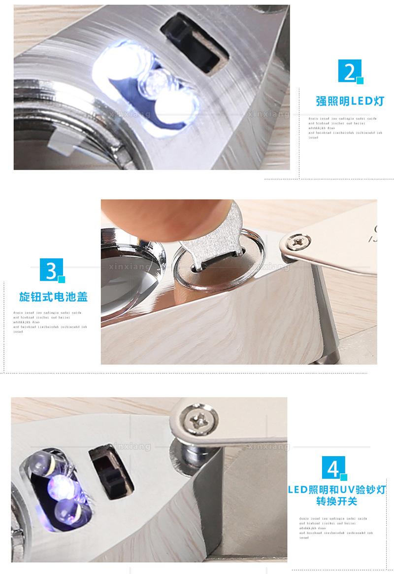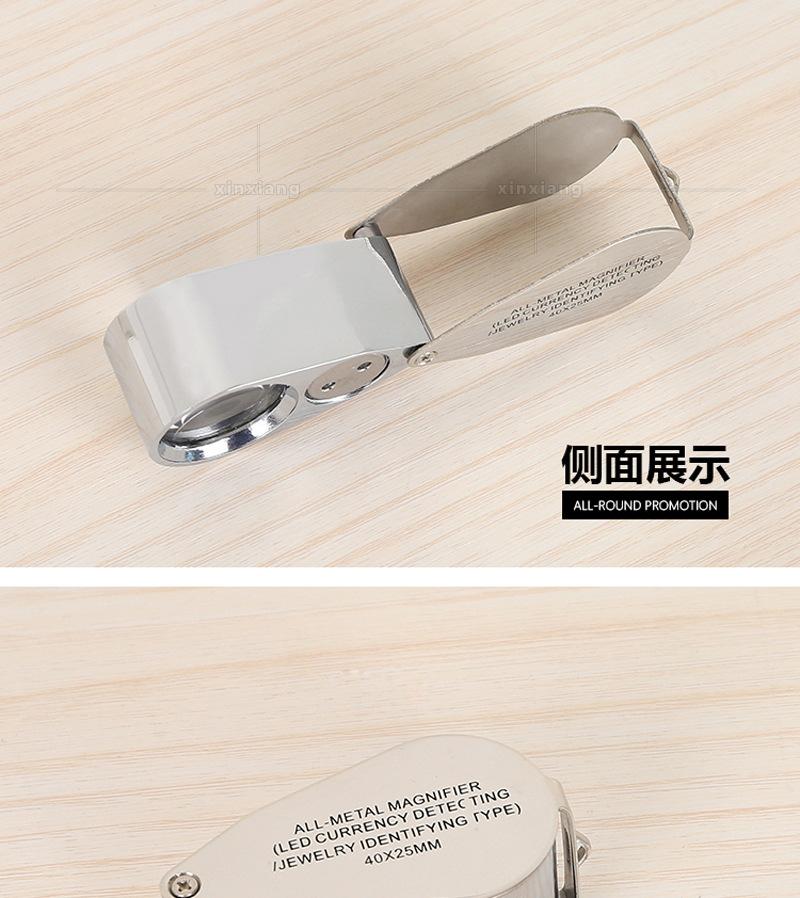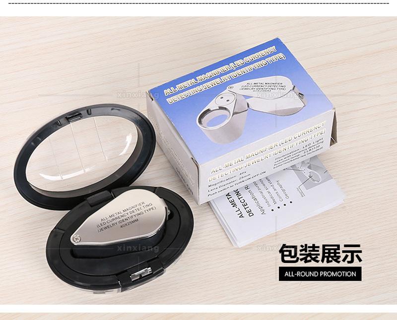 Lupa plegable de acero inoxidable con luz LED 40x para joyería, antigüedades, diamantes, jade, identificación, colección, embalaje en caja de regalo
