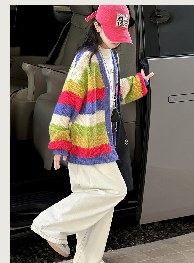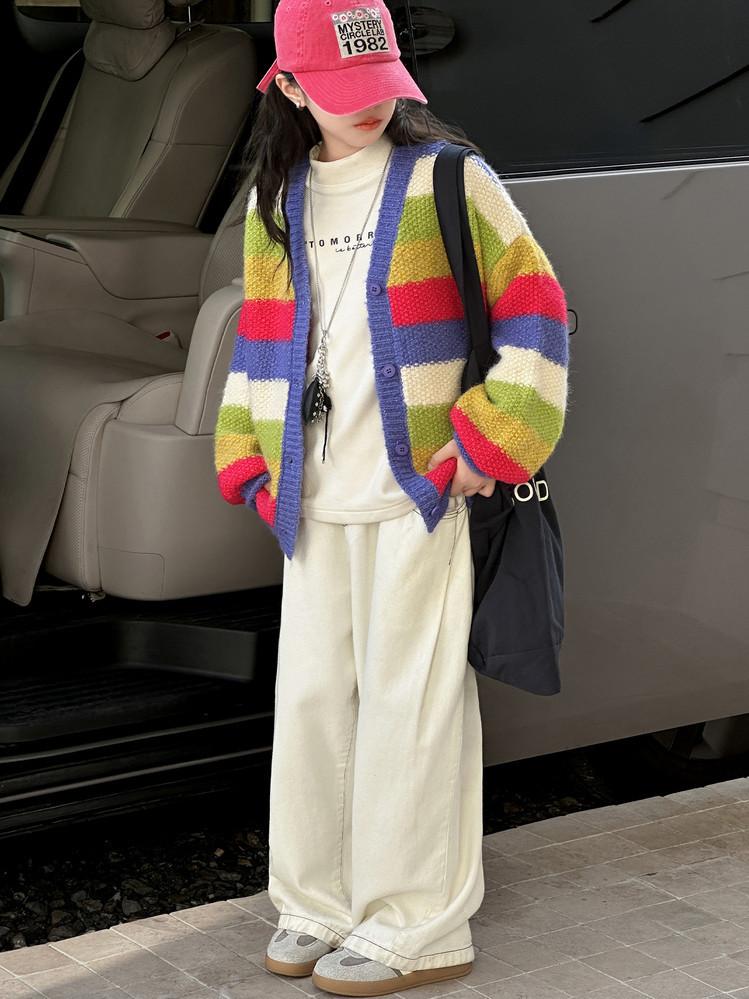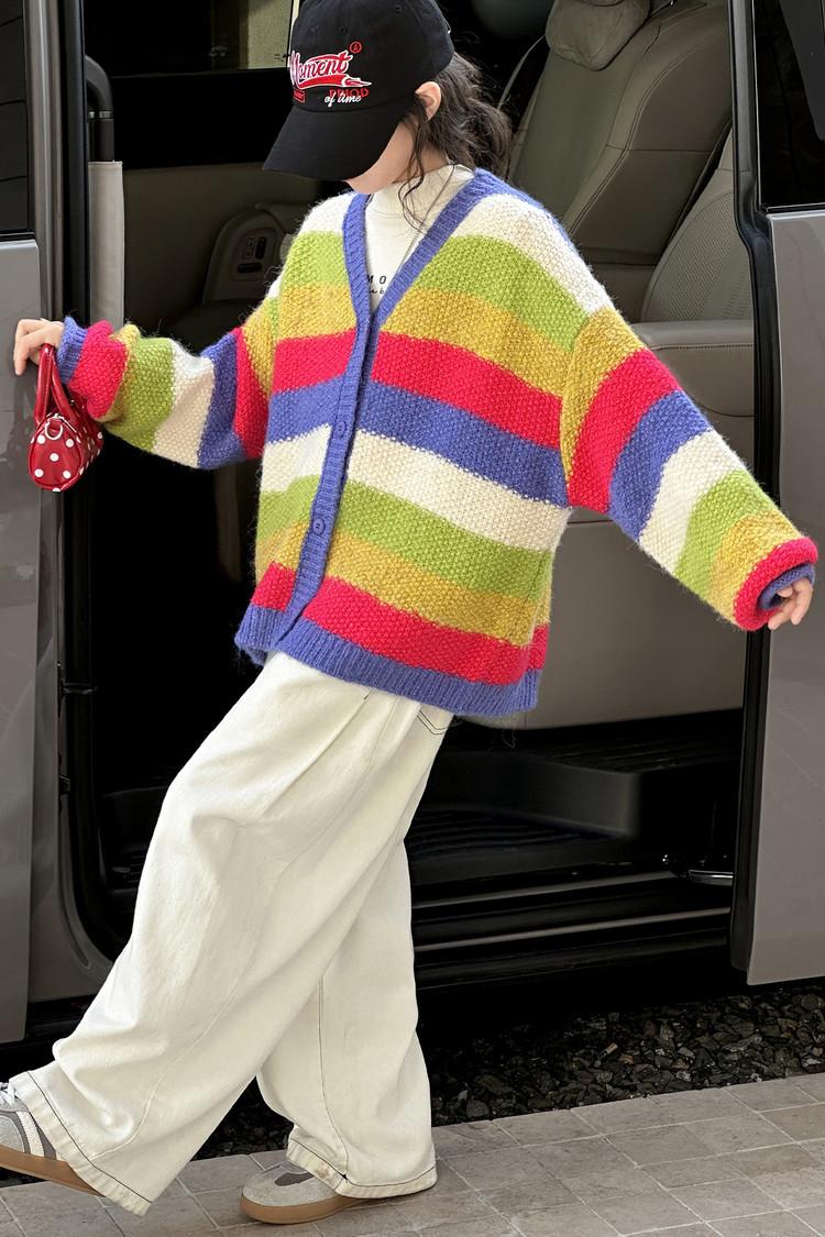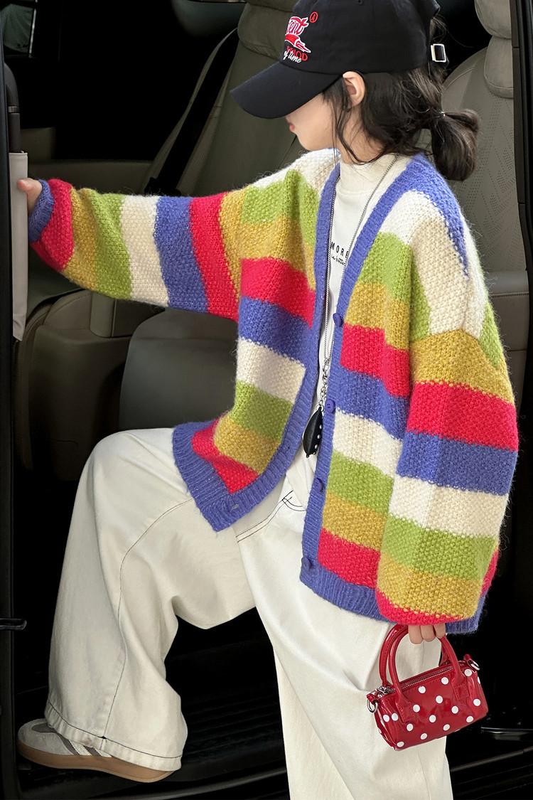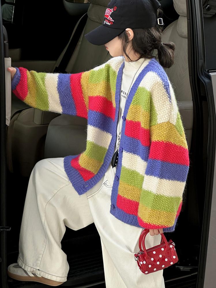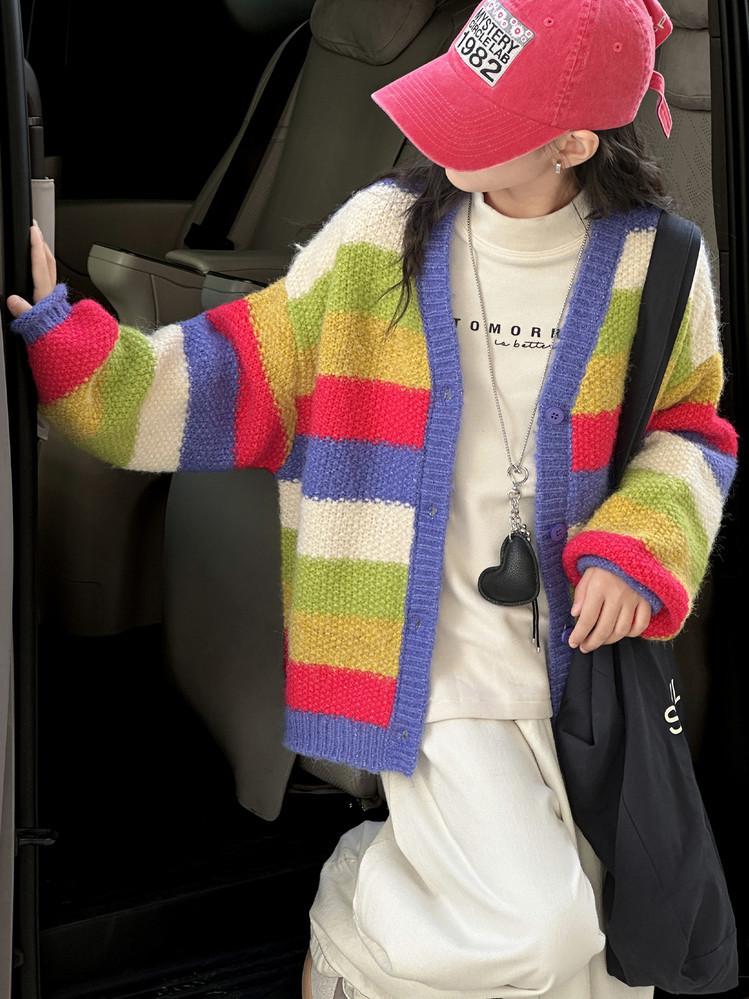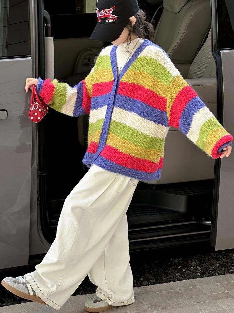 Cárdigan de Otoño e Invierno para Niñas 2025 Nuevo Suéter de Punto Rayado de Color Dulce Estilo Coreano Casual a la Moda Marea