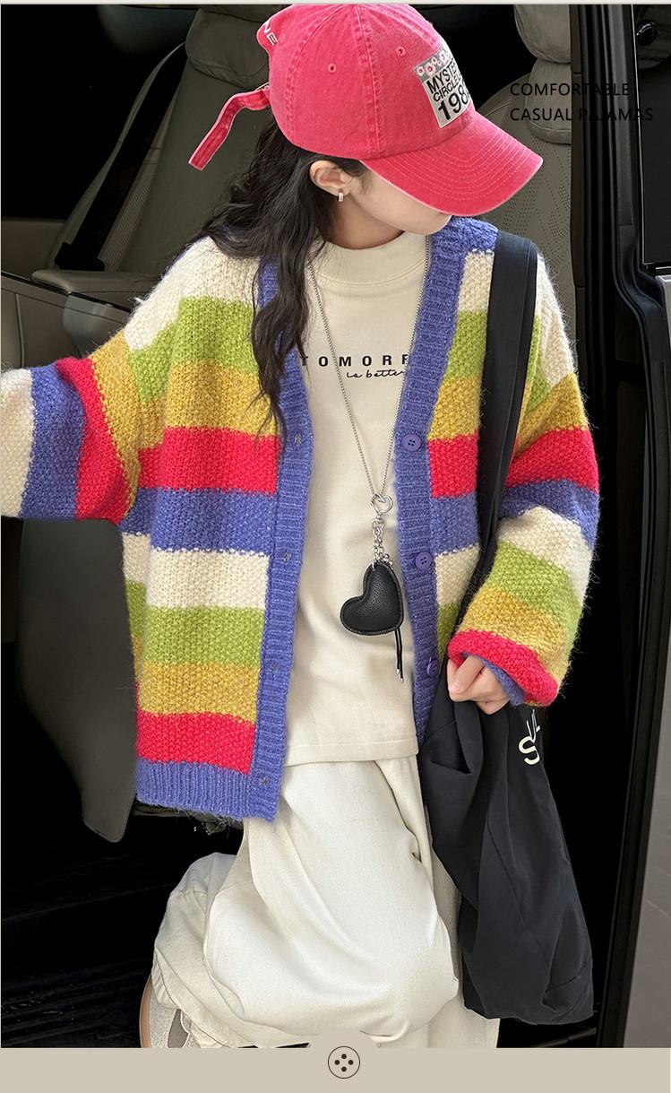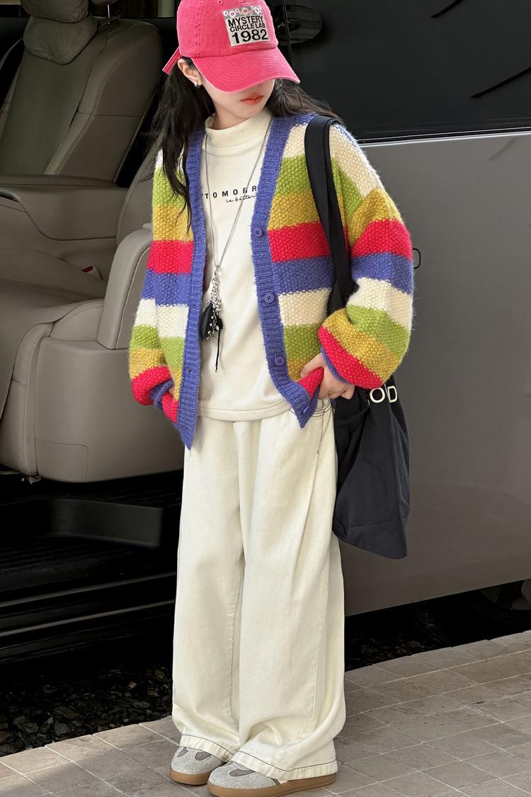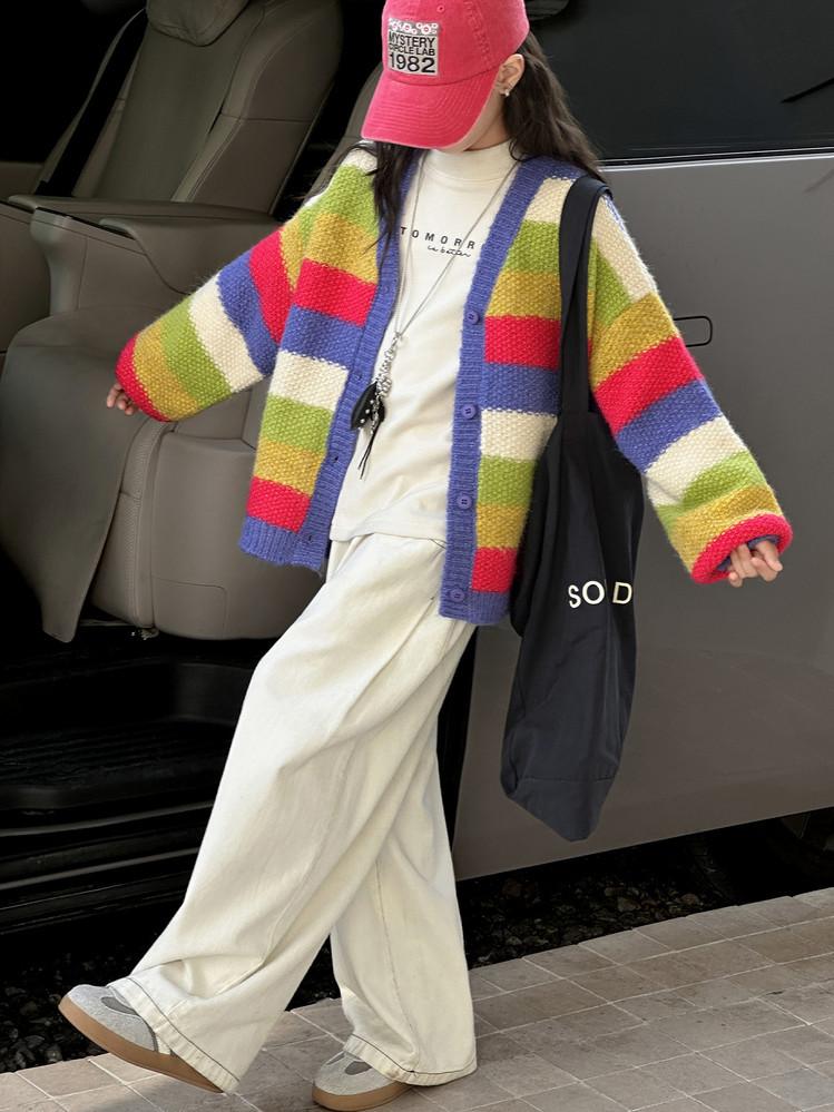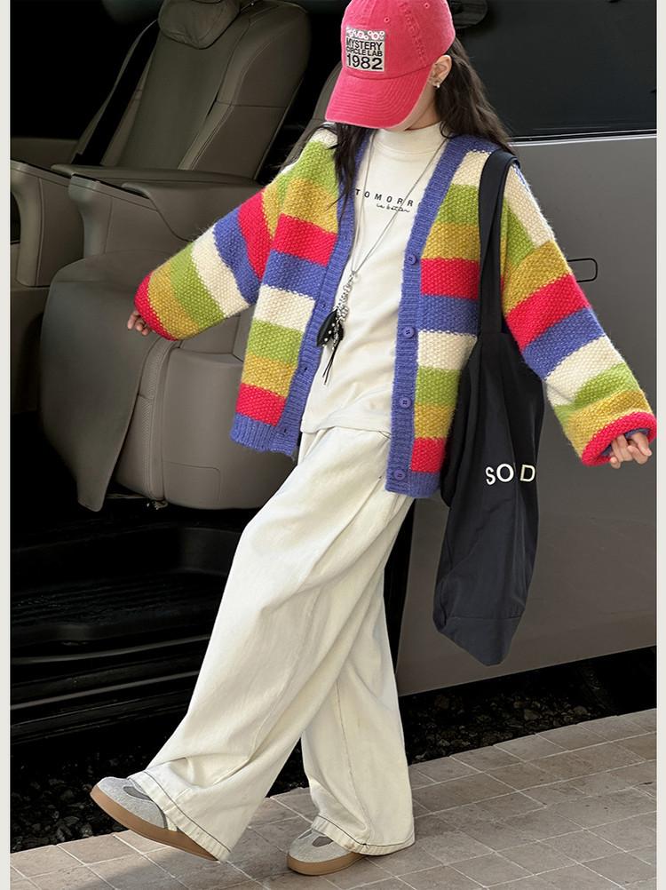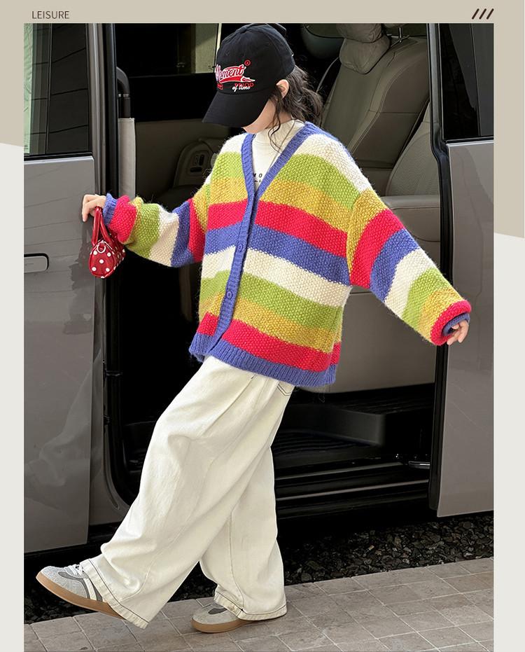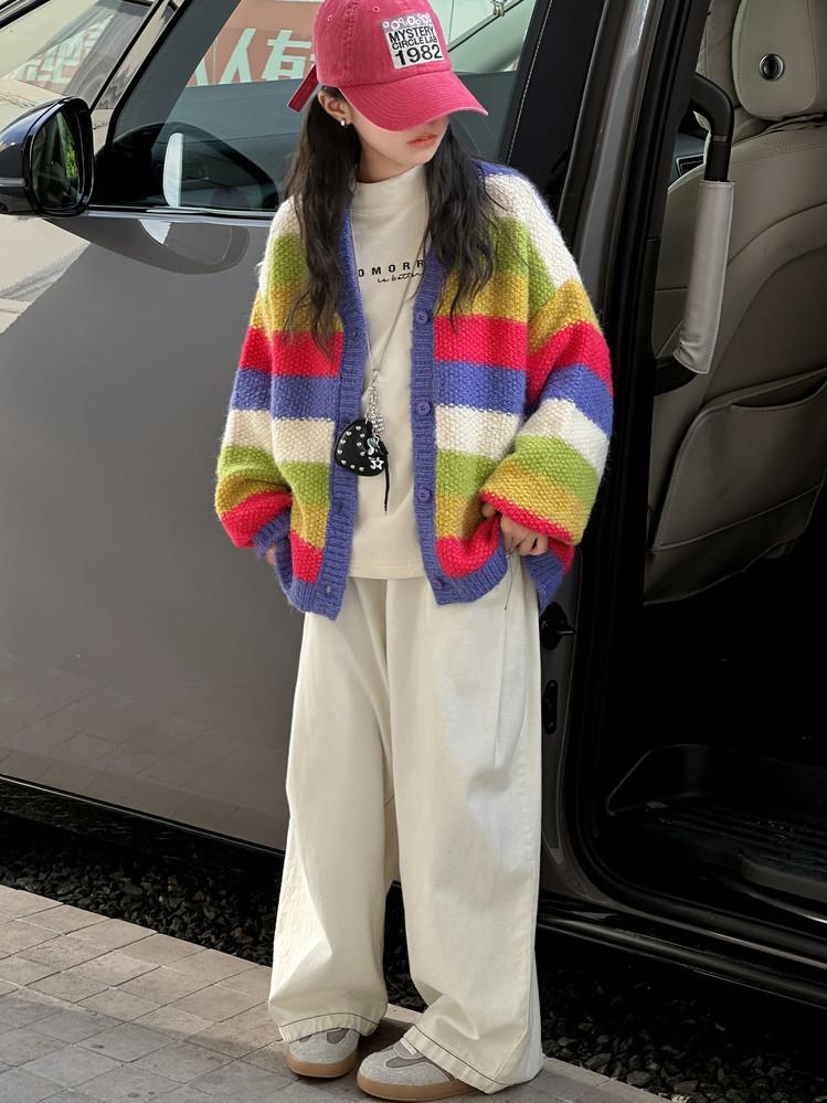 Cárdigan de Otoño e Invierno para Niñas 2025 Nuevo Suéter de Punto Rayado de Color Dulce Estilo Coreano Casual a la Moda Marea