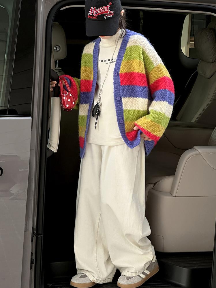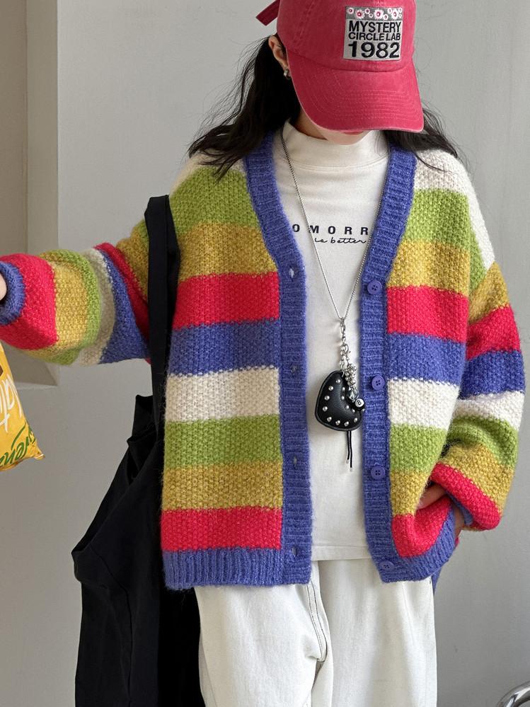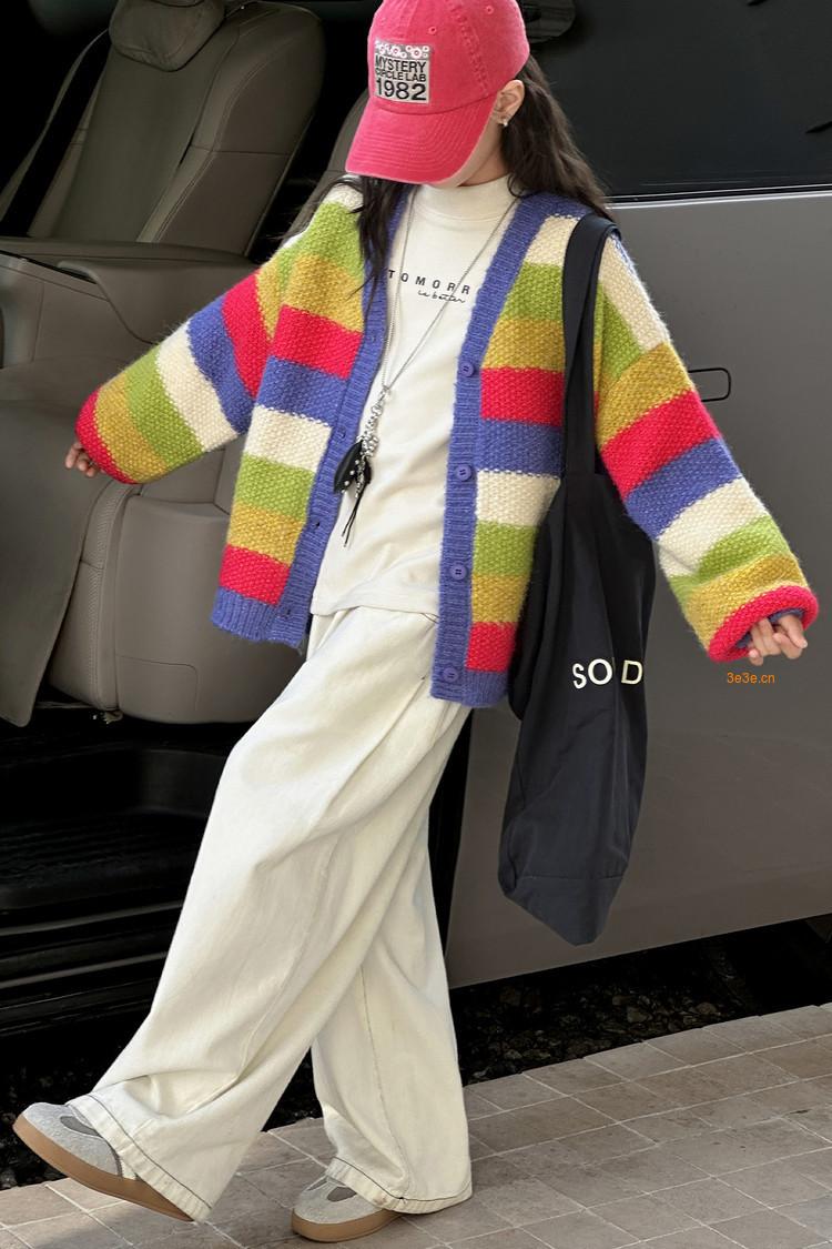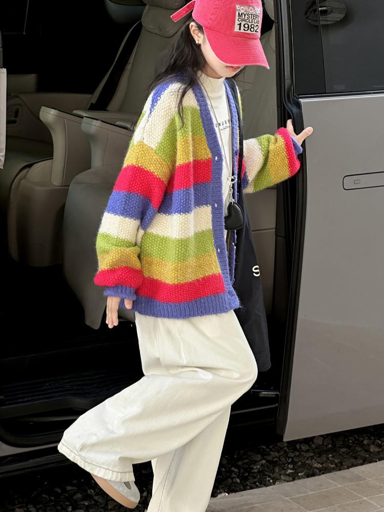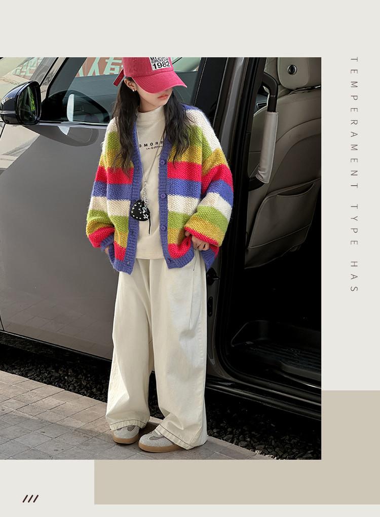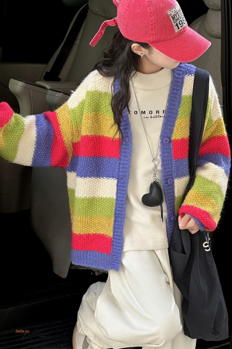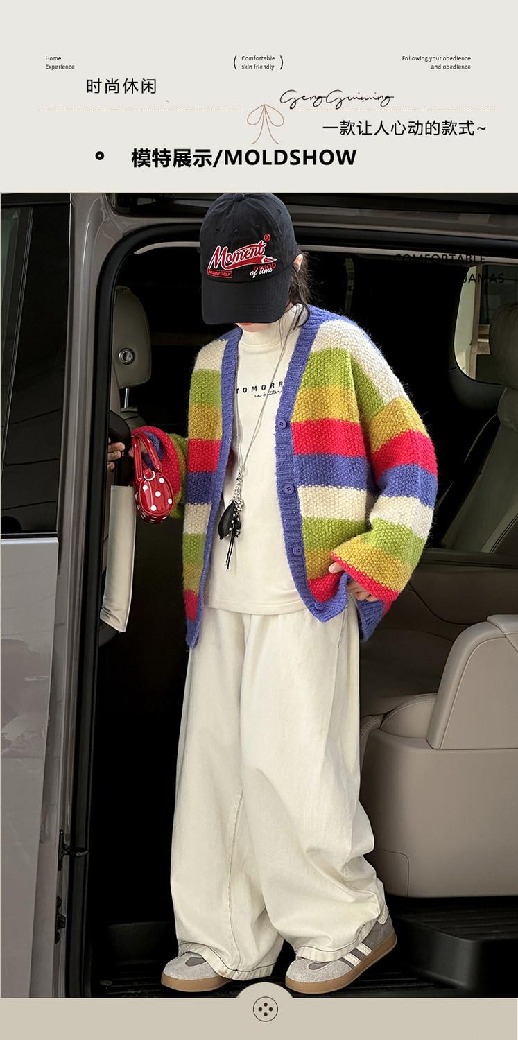 Cárdigan de Otoño e Invierno para Niñas 2025 Nuevo Suéter de Punto Rayado de Color Dulce Estilo Coreano Casual a la Moda Marea