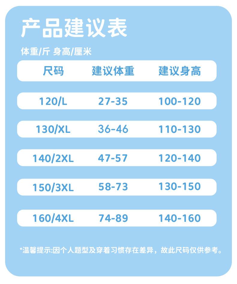 L (suggested 100-120cm/27-35 jin), XL (suggested 110-130cm/34-46 jin), 2XL (suggested 120-140cm/47-57kg), 3XL ...