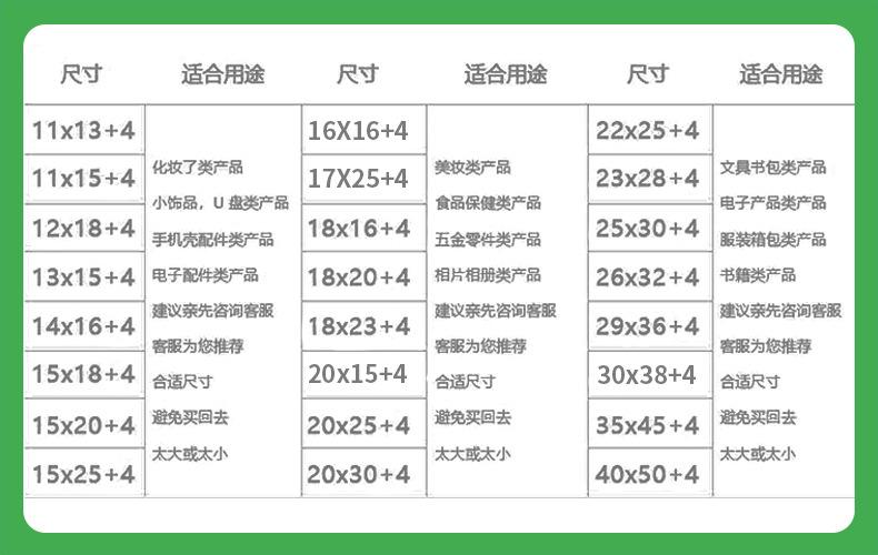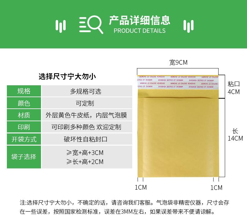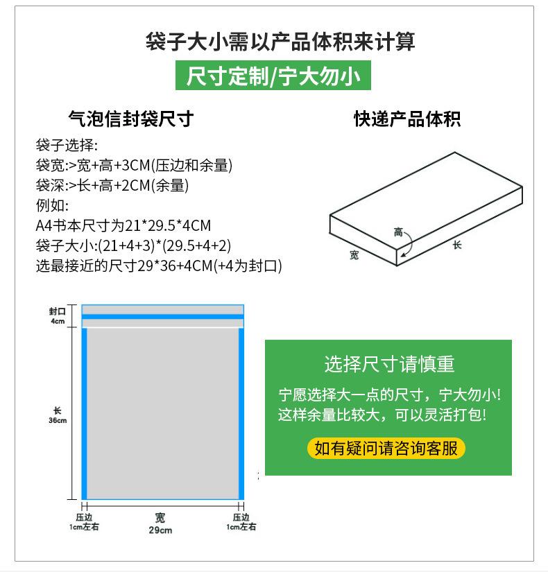 Descripción del tamaño: El tamaño en las opciones se refiere al tamaño externo de la bolsa de burbujas. Los tamaños corresponden aAncho+Largo+Borde de Pegamento+Número de Empaque. Por ejemplo, 9*14+4cm, 1800 piezas por caja, representa que las dimensiones externas de la bolsa de burbujas son 9cm de ancho, 14cm de largo, y la solapa adhesiva es de 4cm. Las dimensiones útiles reales deben reducirse en 2-3cm por el borde sellado y el margen, así queEl tamaño útil real de 9×14+4cm es aproximadamente 6×13cmAl elegir la talla, asegúrese de elegir las especificaciones correspondientes según los requisitos del producto.