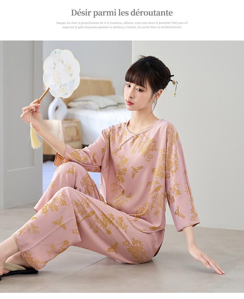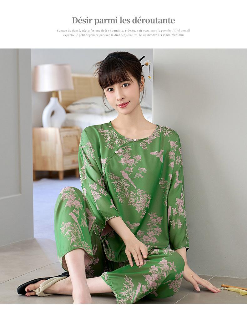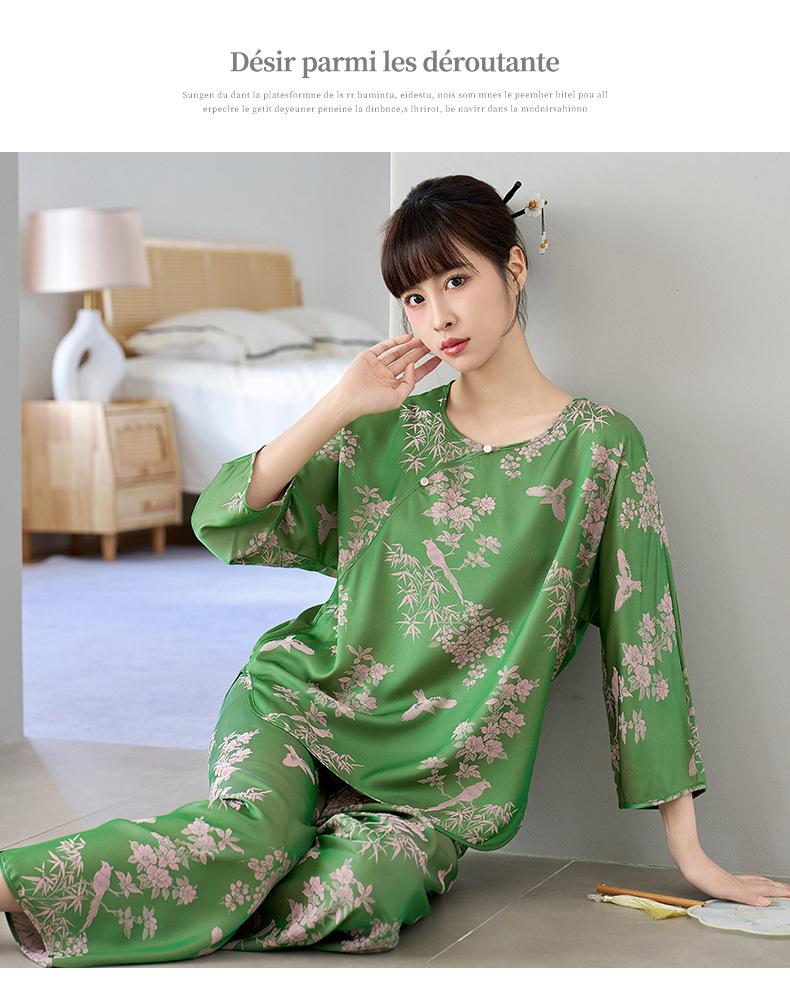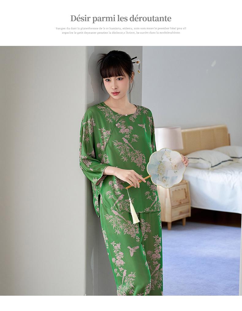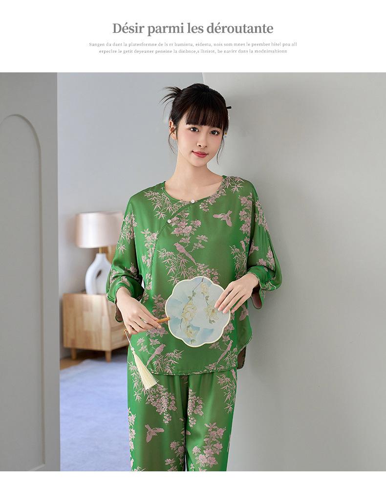 Pijama de Seda de Hielo para Mujer Verano Nuevo Estilo Estilo Chino Cuello Redondo Ropa para el Hogar Se Puede Usar Afuera Jacquard Manga Larga Conjunto de Ropa para el Hogar
