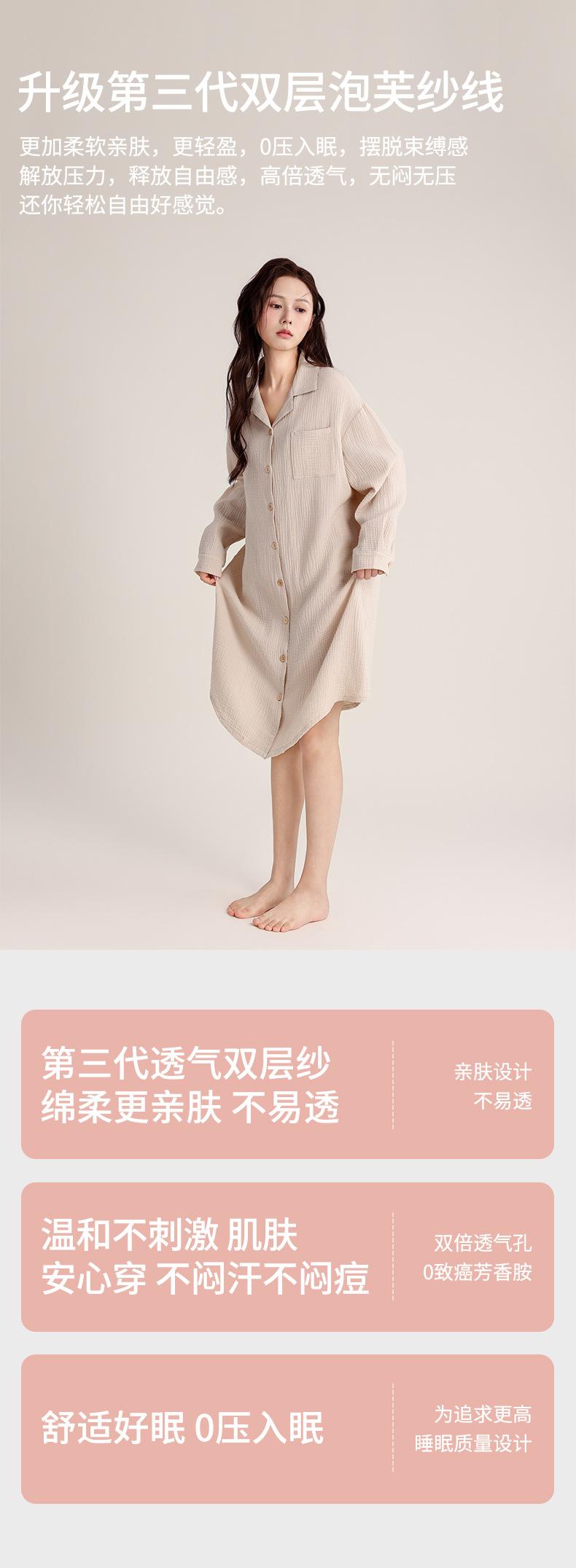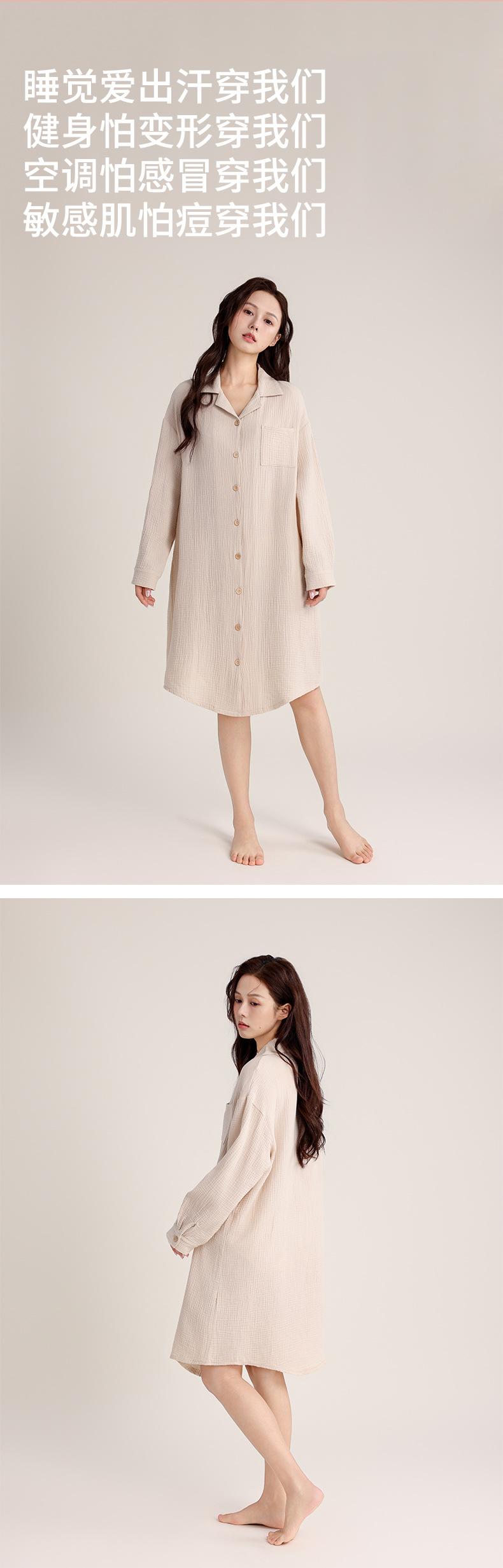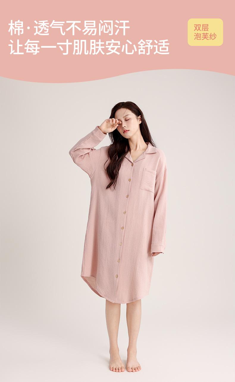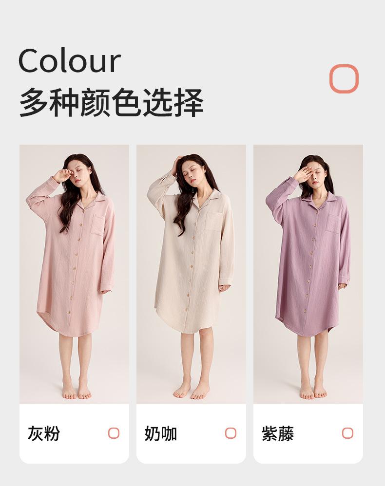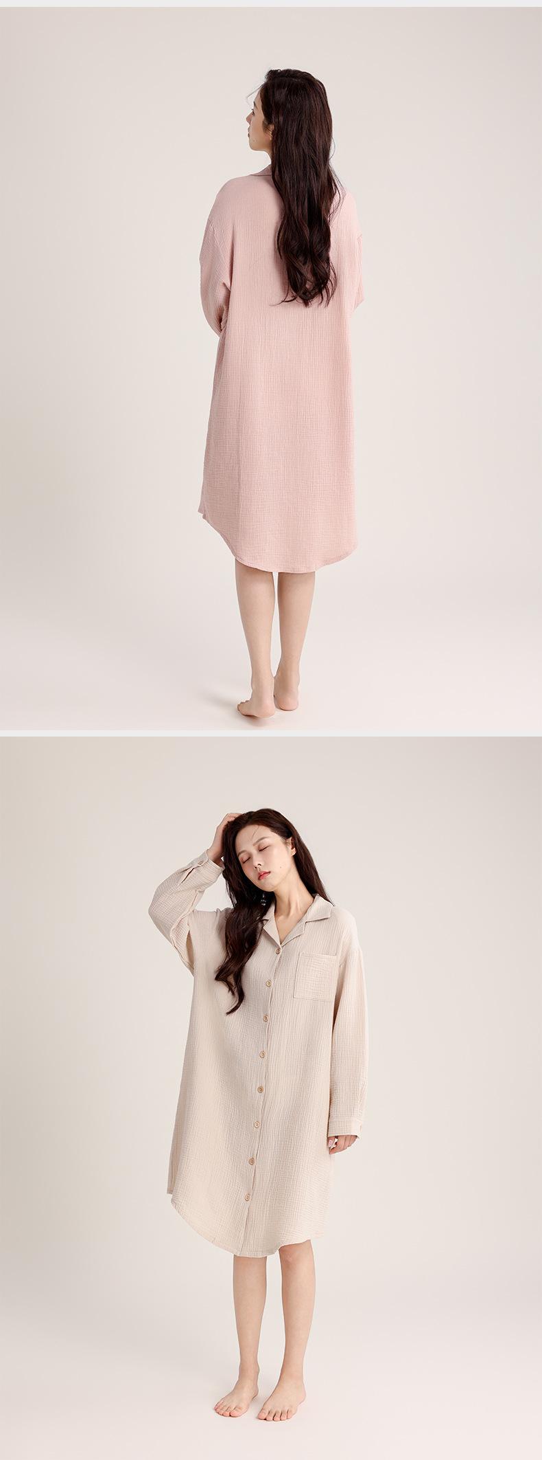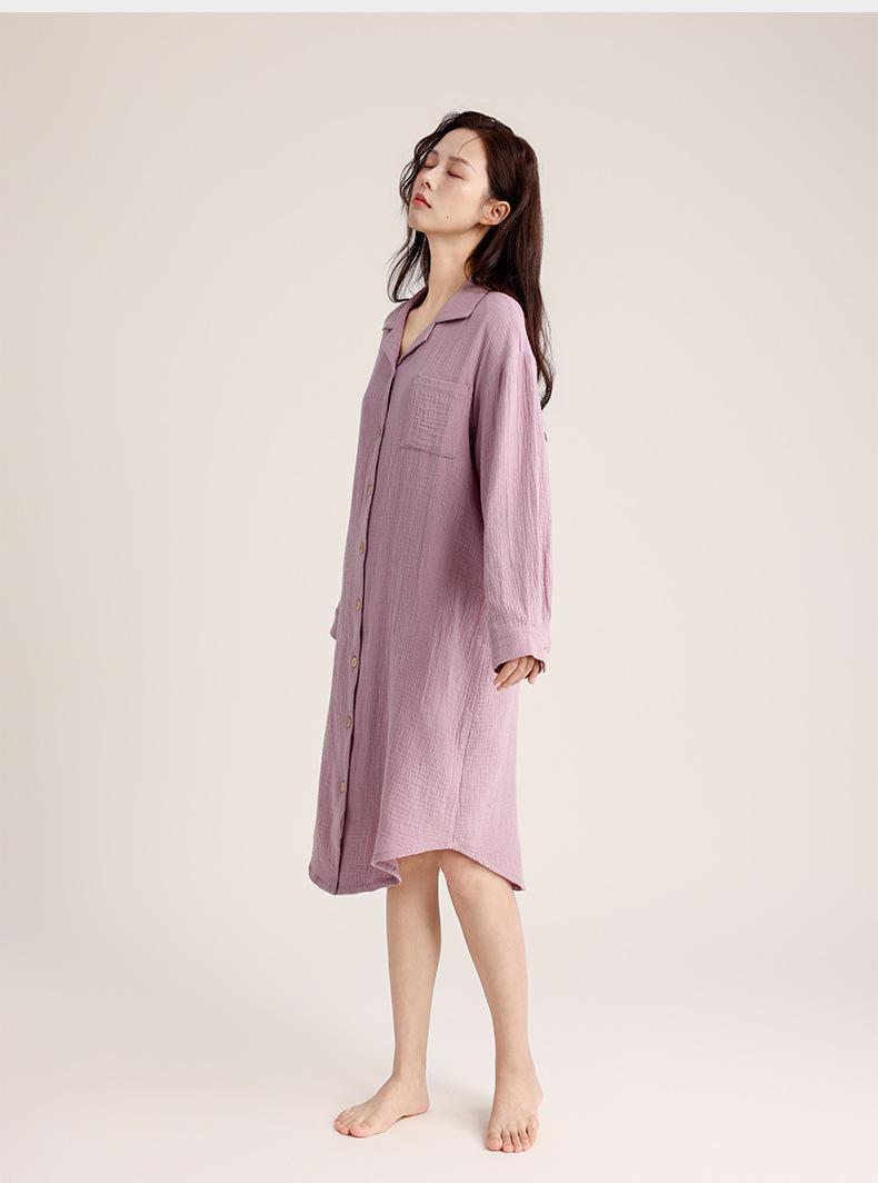 Camisón de Verano Personalizado para Mujer Crepé de Doble Capa Algodón Transpirable Estilo sin Estampado Cárdigan Simple con Solapa Se Puede Usar Afuera