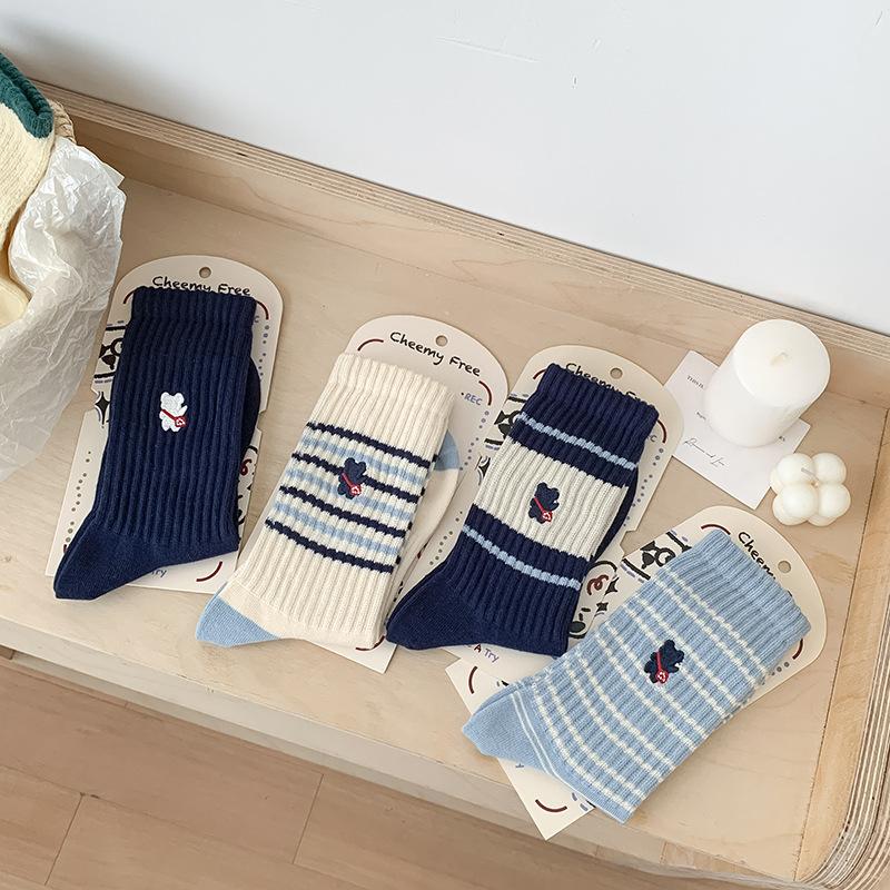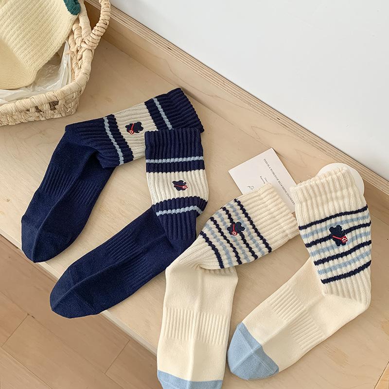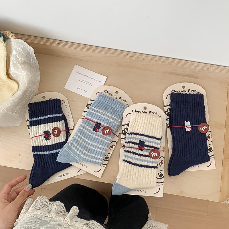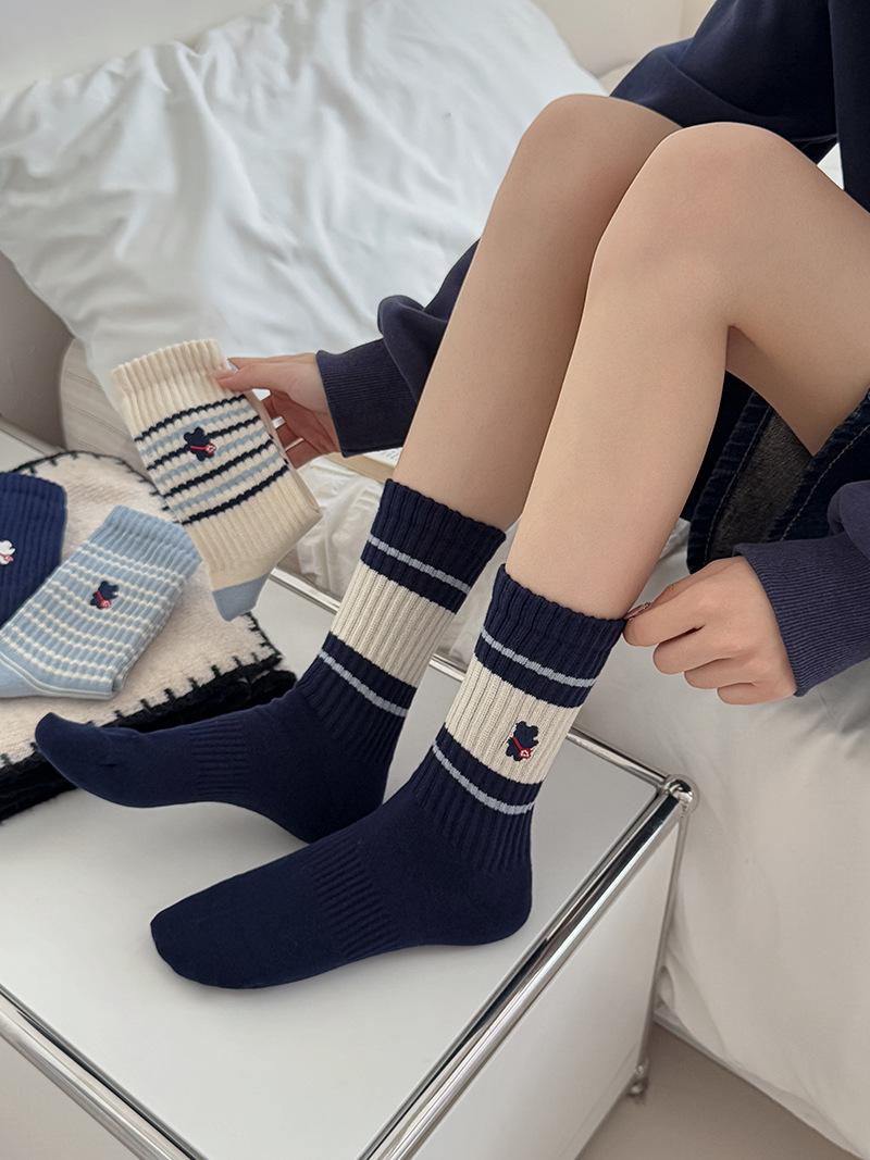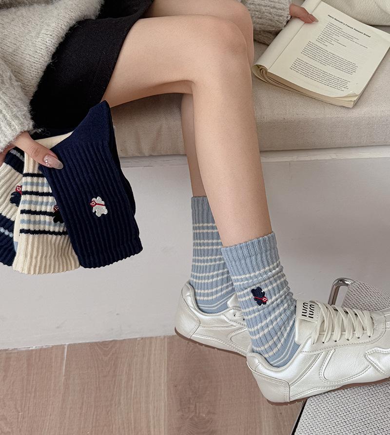 Nuevos Calcetines Holgados a Rayas Gris-Azul Otoño/Invierno Calcetines de Media Caña para Mujer ins Modernos Japoneses Versátiles de Dibujos Animados Osito Calcetines para Mujer por Encima de la Rodilla