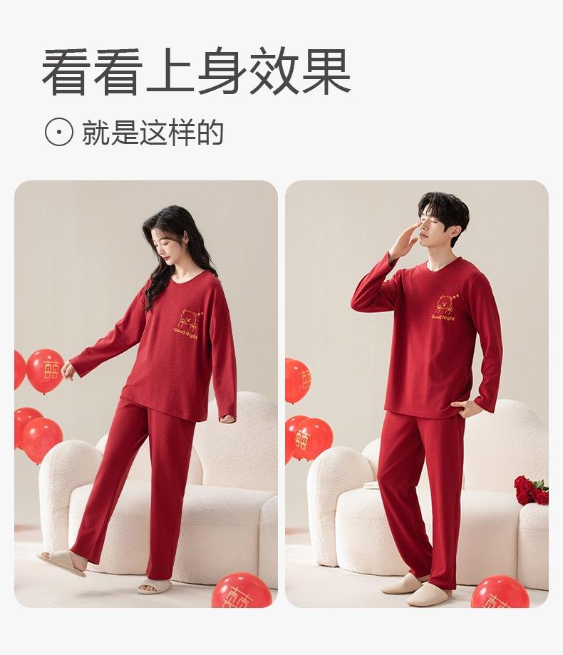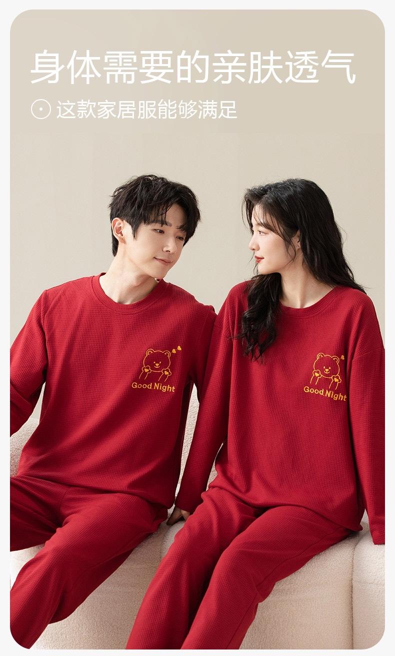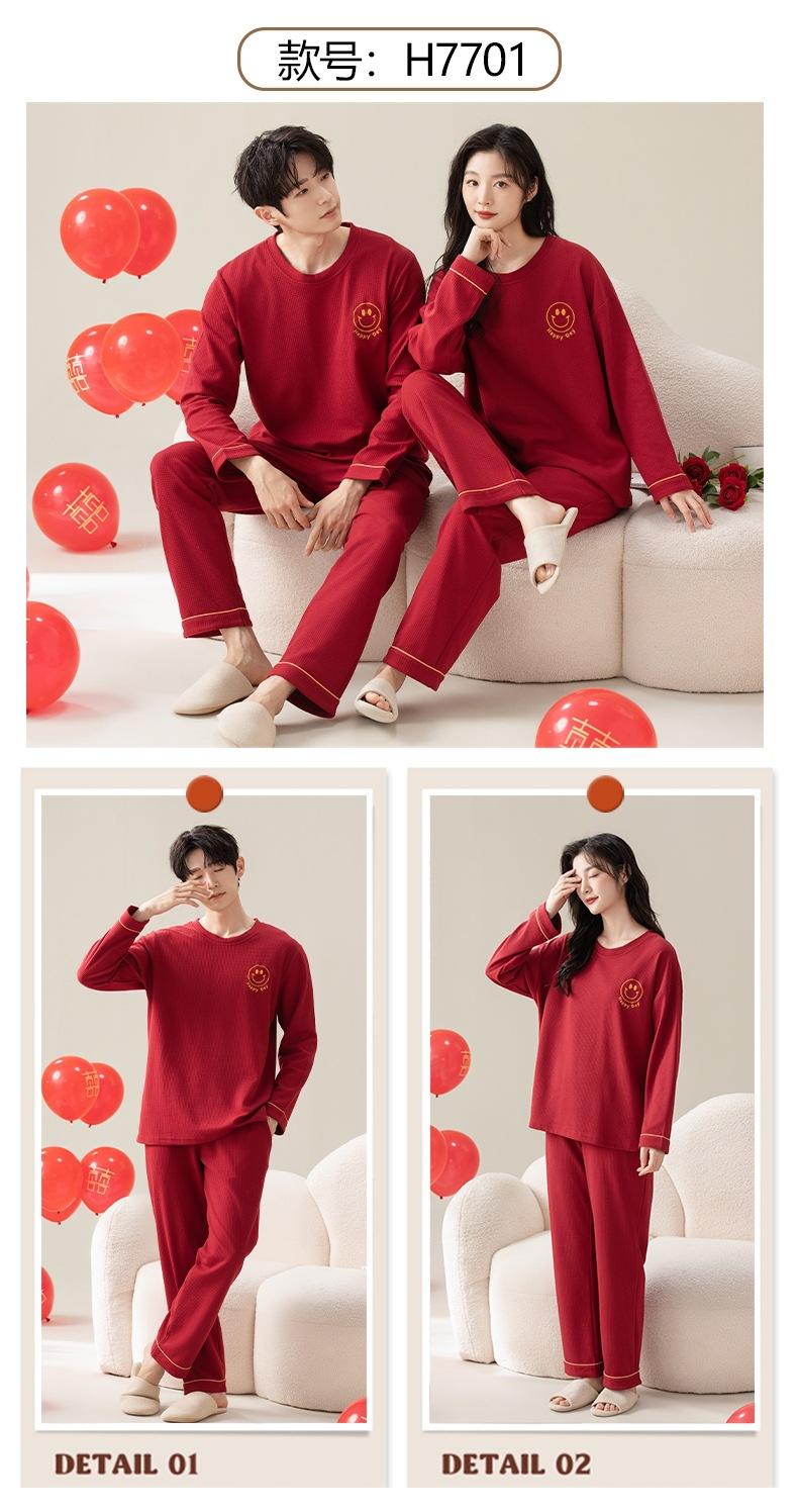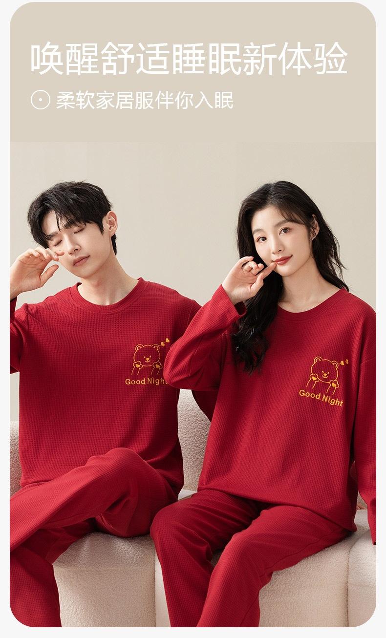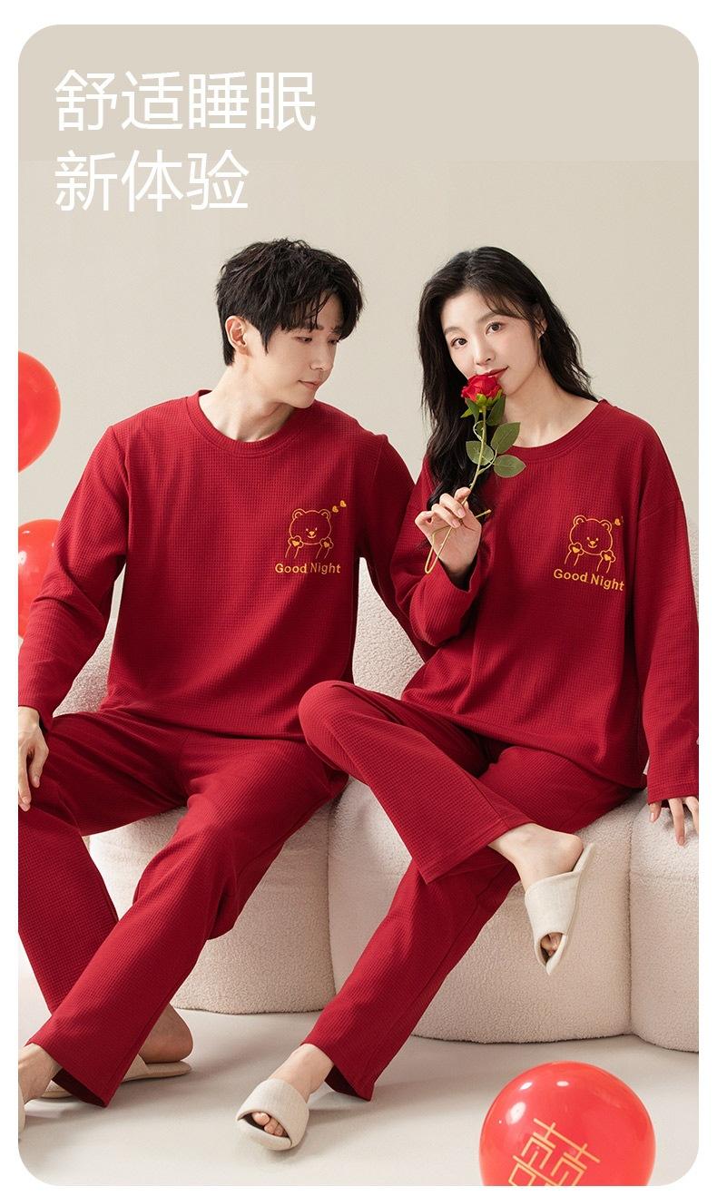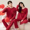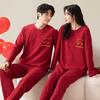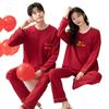 Punto sólido al por mayor Otoño y Primavera Nuevo Pijama de Pareja Mujer 65 Marea Algodón de Punto Manga Larga Rojo Boda Hombre Hogar
