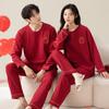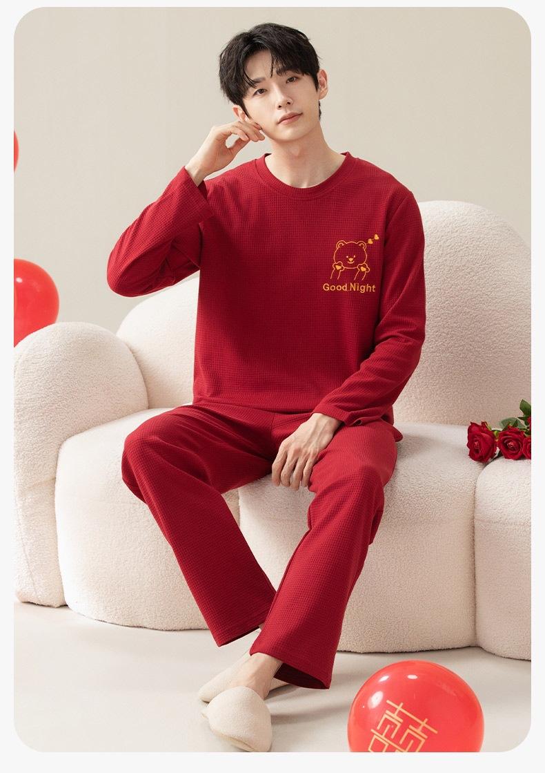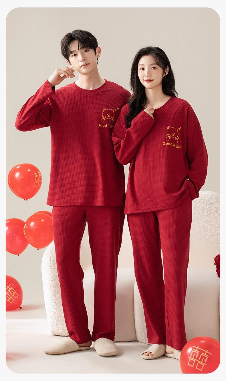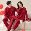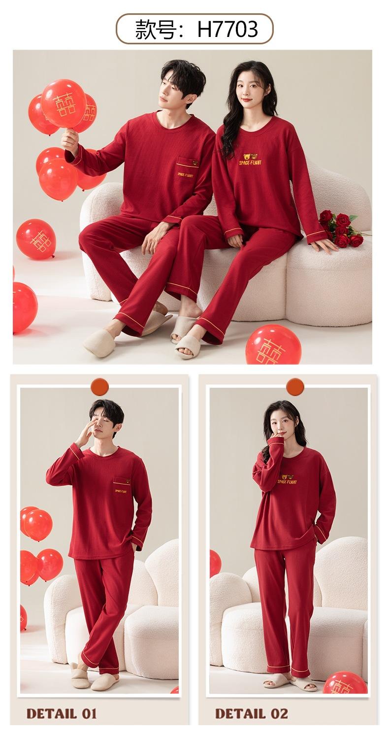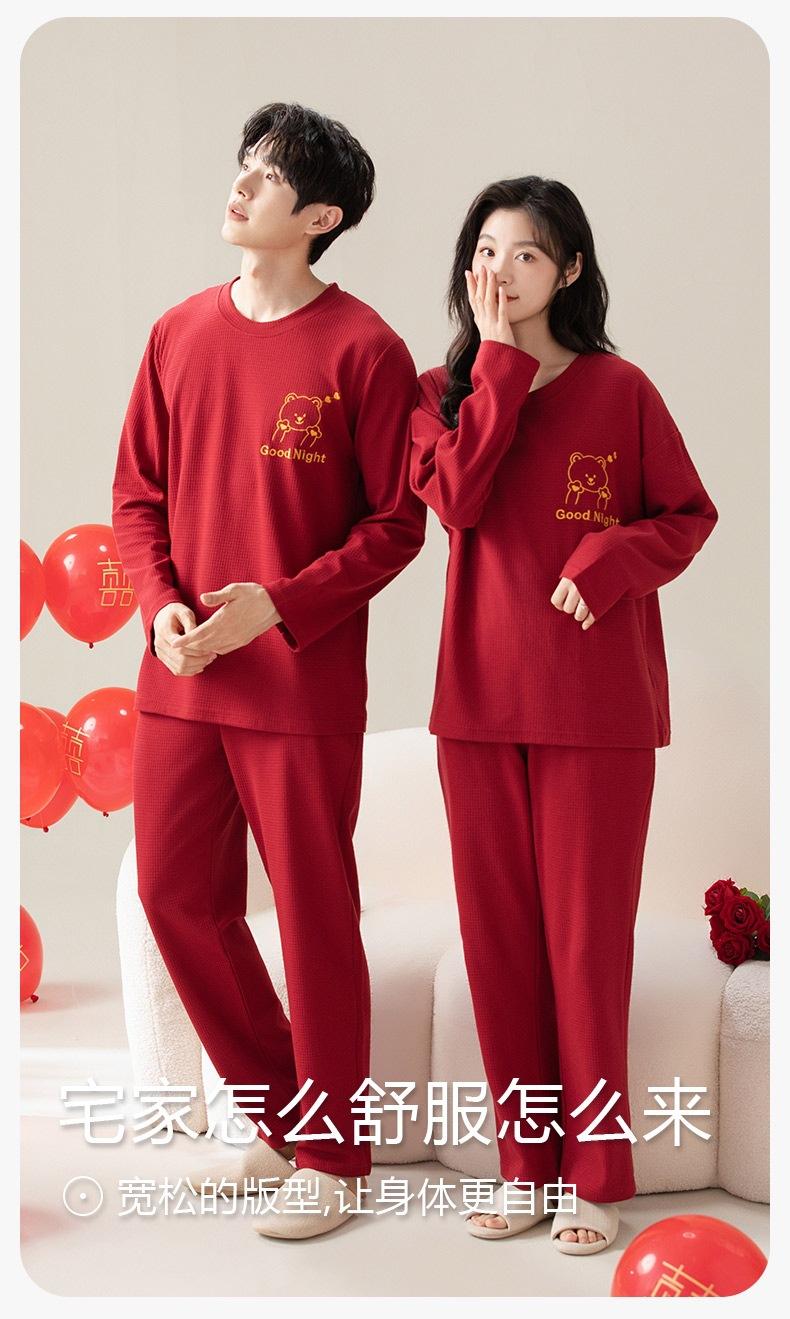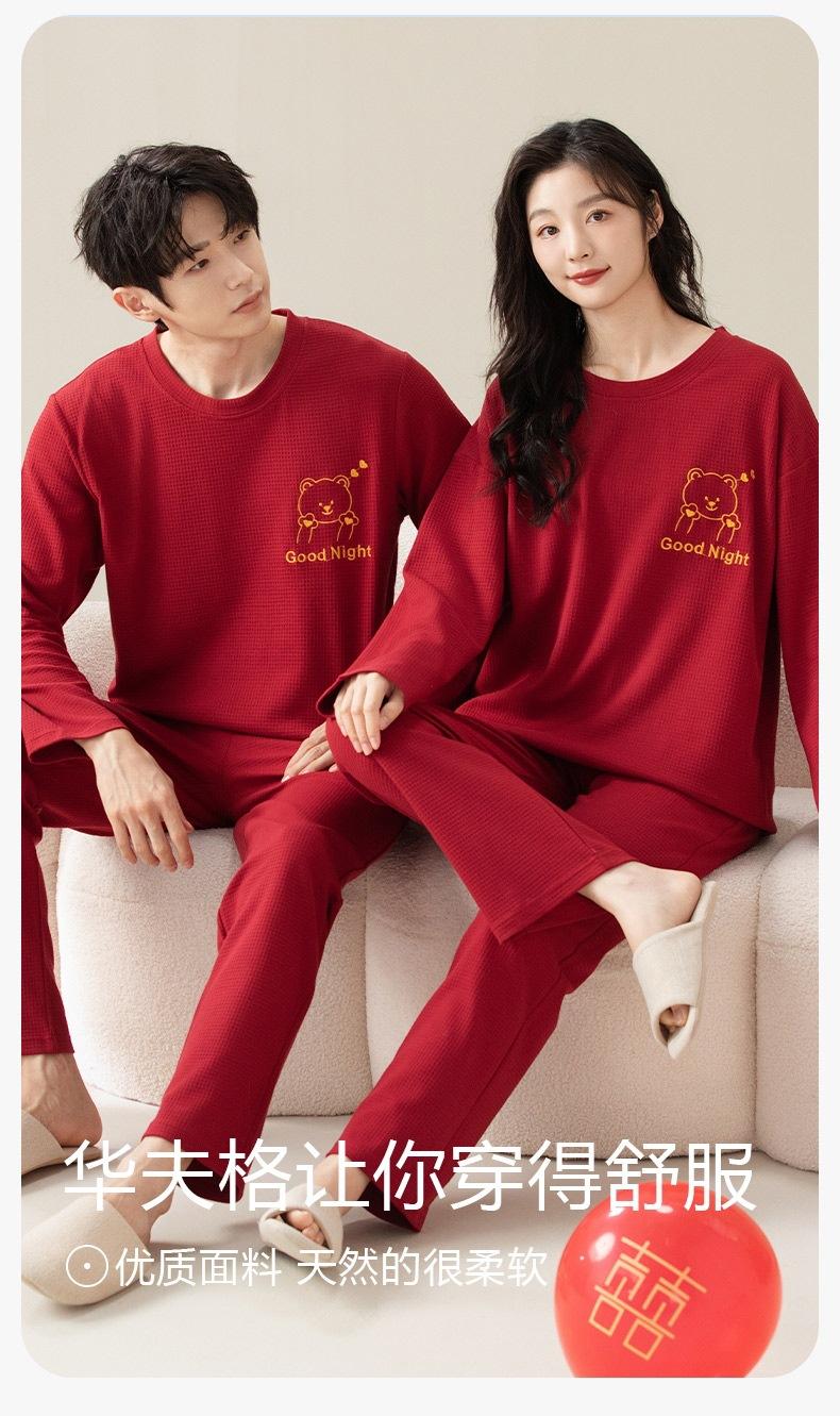 Punto sólido al por mayor Otoño y Primavera Nuevo Pijama de Pareja Mujer 65 Marea Algodón de Punto Manga Larga Rojo Boda Hombre Hogar