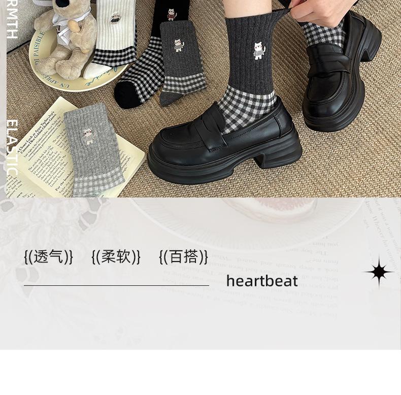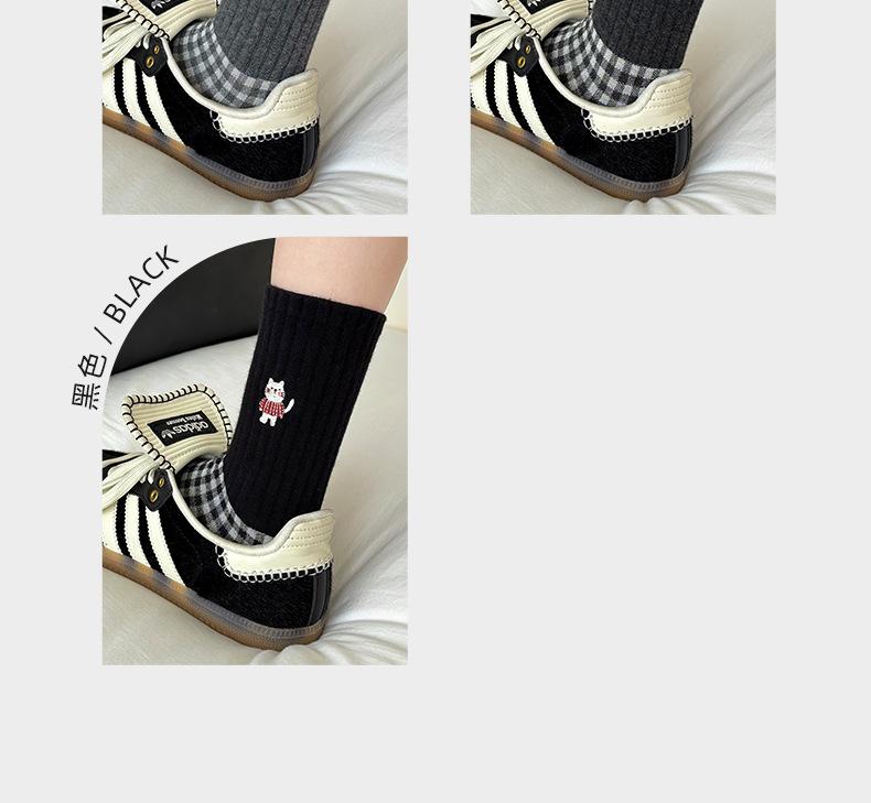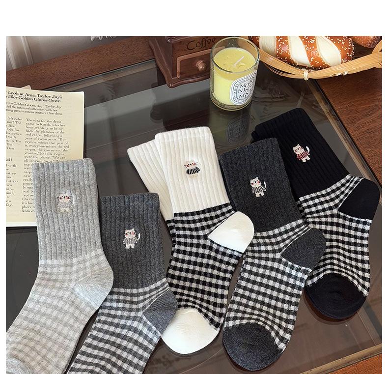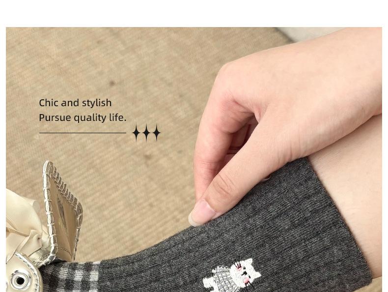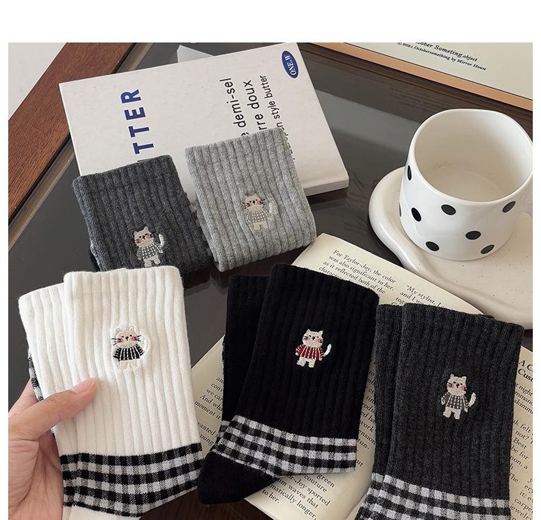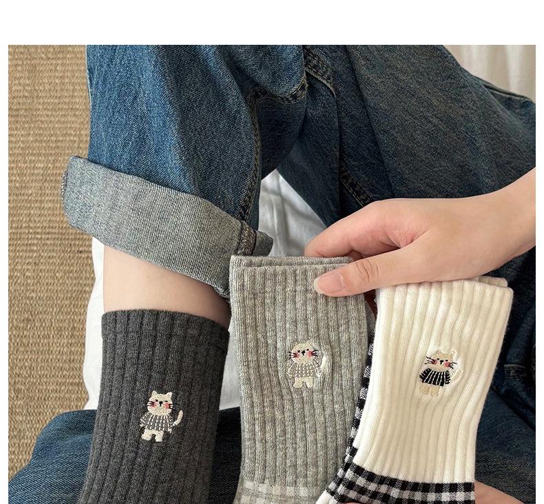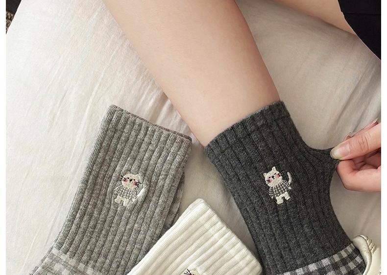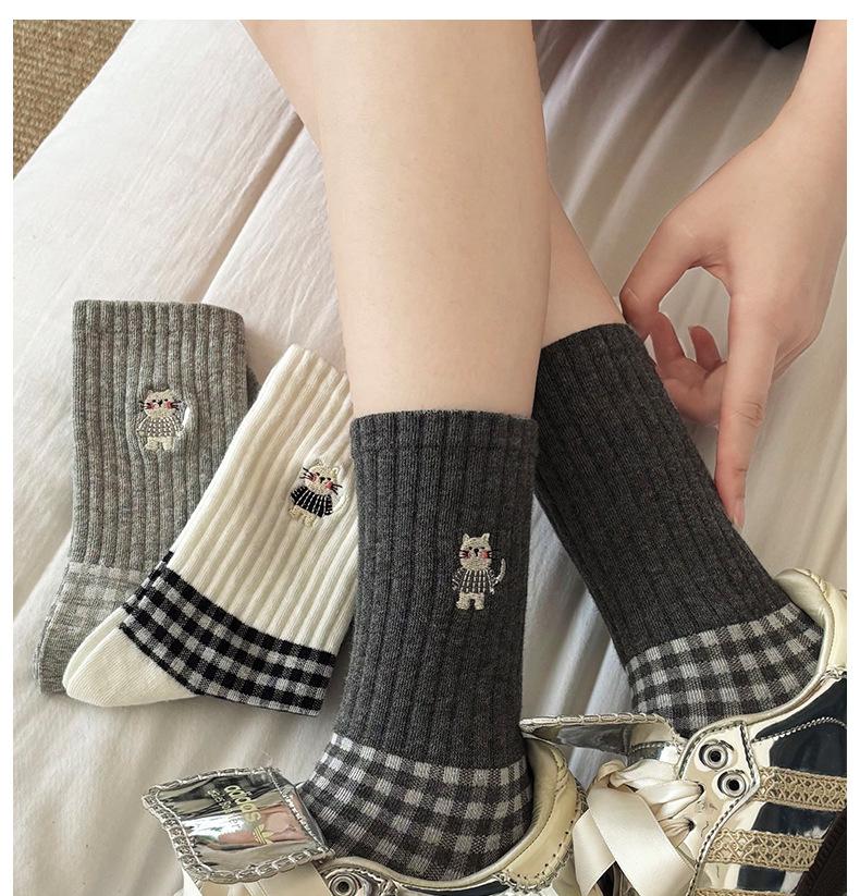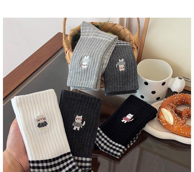 Otoño Nuevos Calcetines Calcetines de Algodón Estilo Universitario a Cuadros Japoneses Lindo Bordado de Gato de Dibujos Animados Calcetines Medianos para Mujer