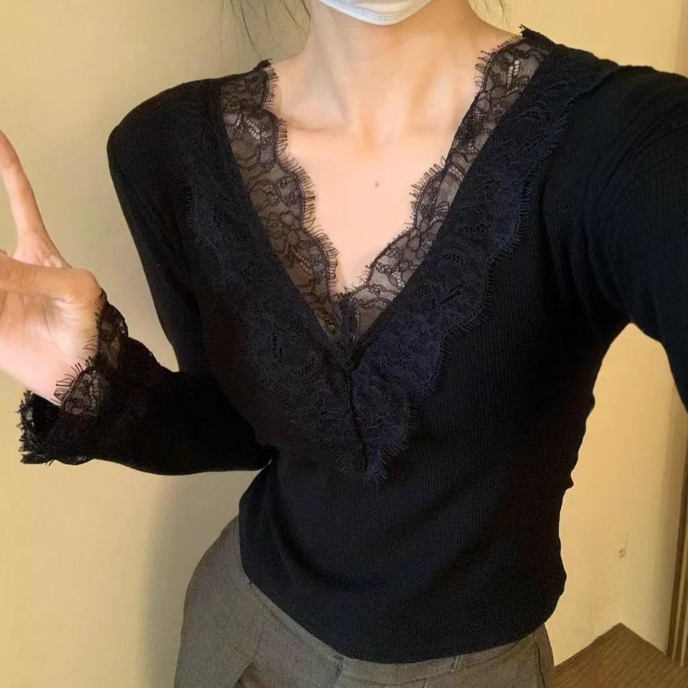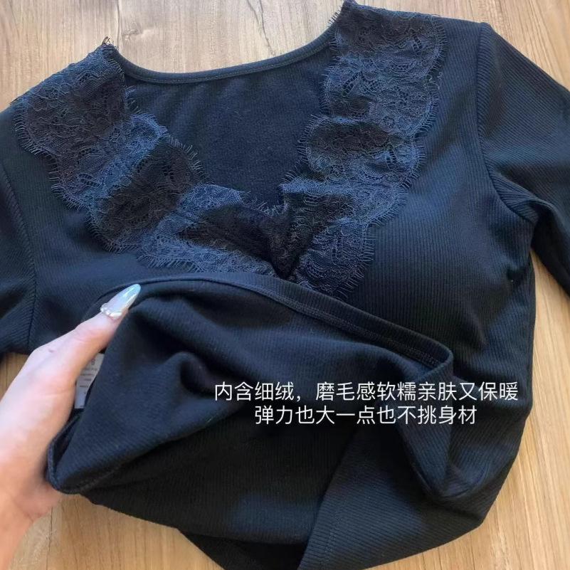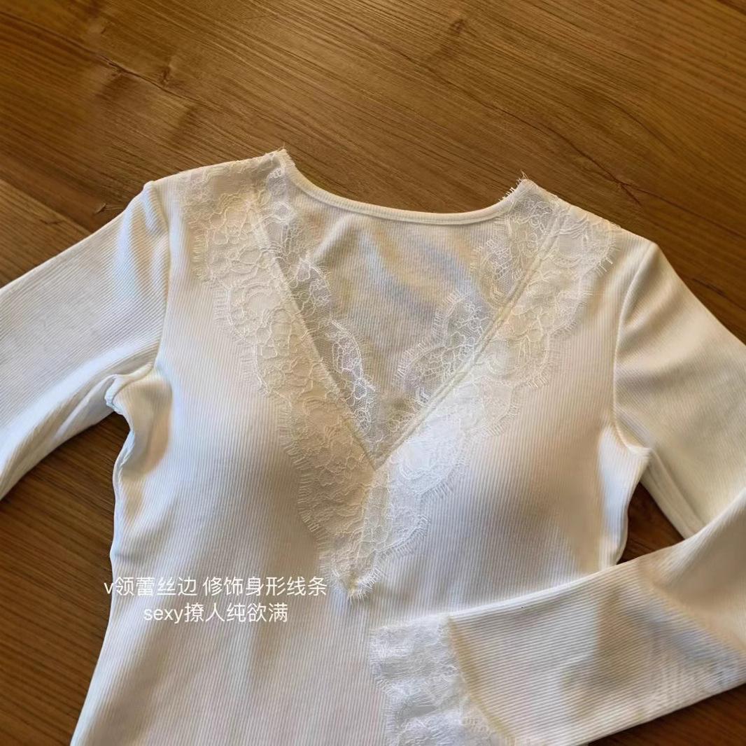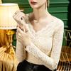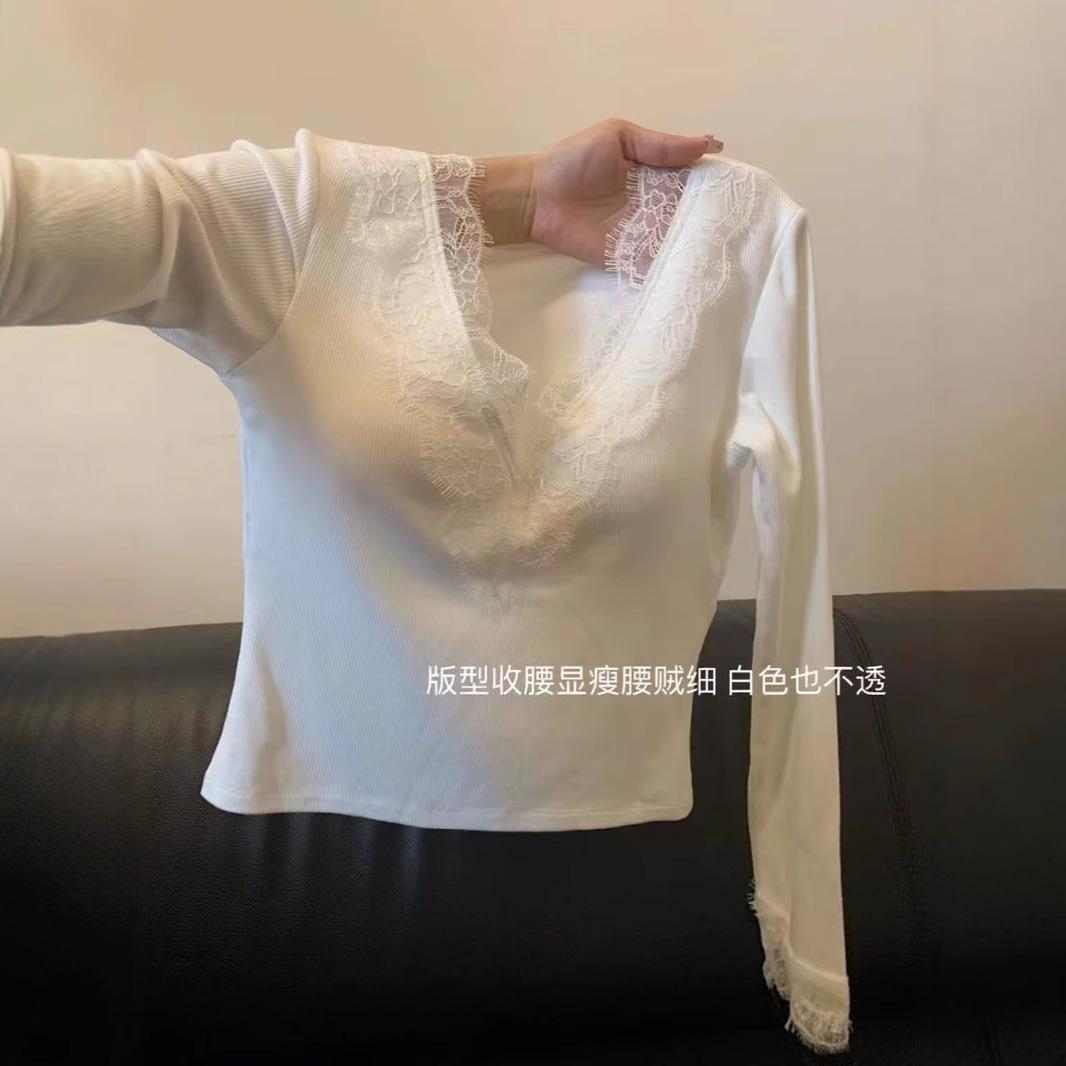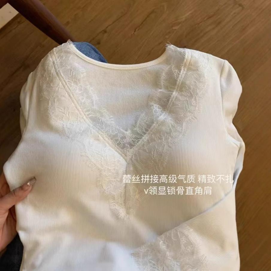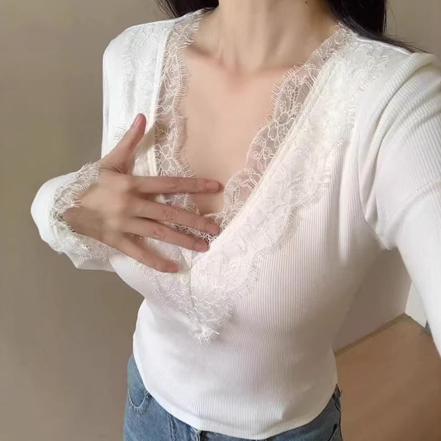 Playera sexy de encaje con cuello en V y manga larga, camisa básica para mujer, estilo nuevo de otoño, de alta gama, ajustada, cálida, cepillada