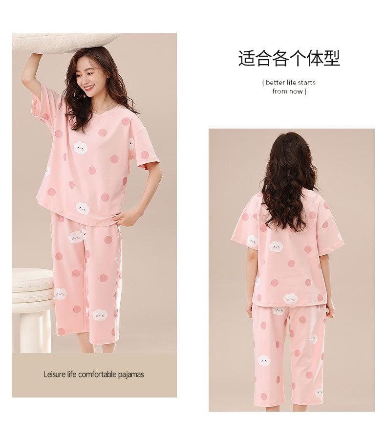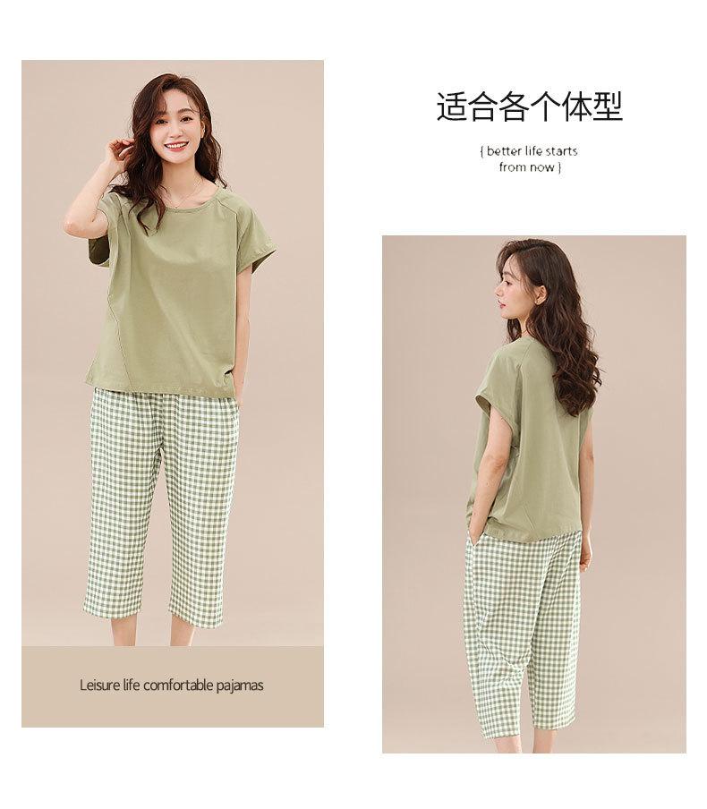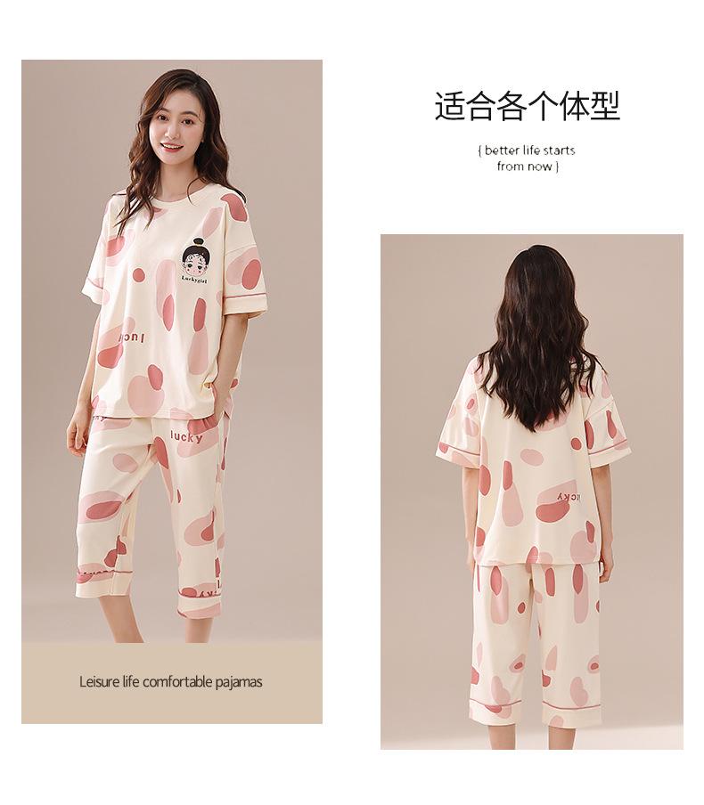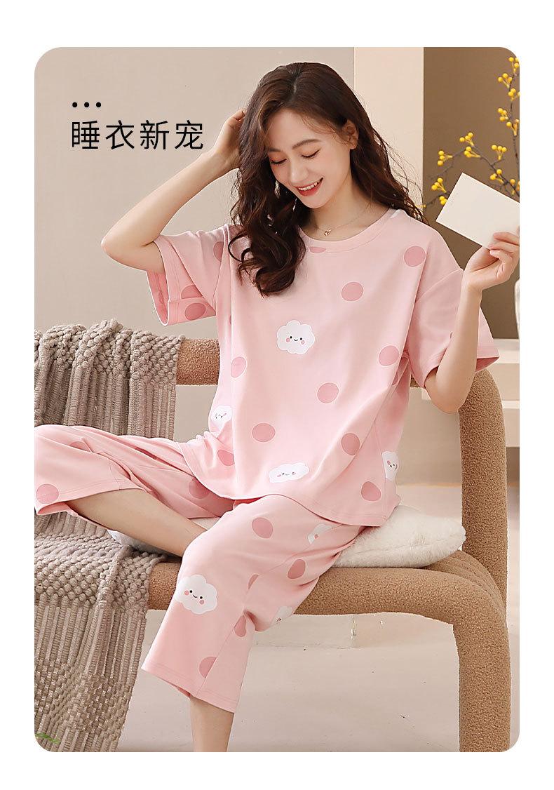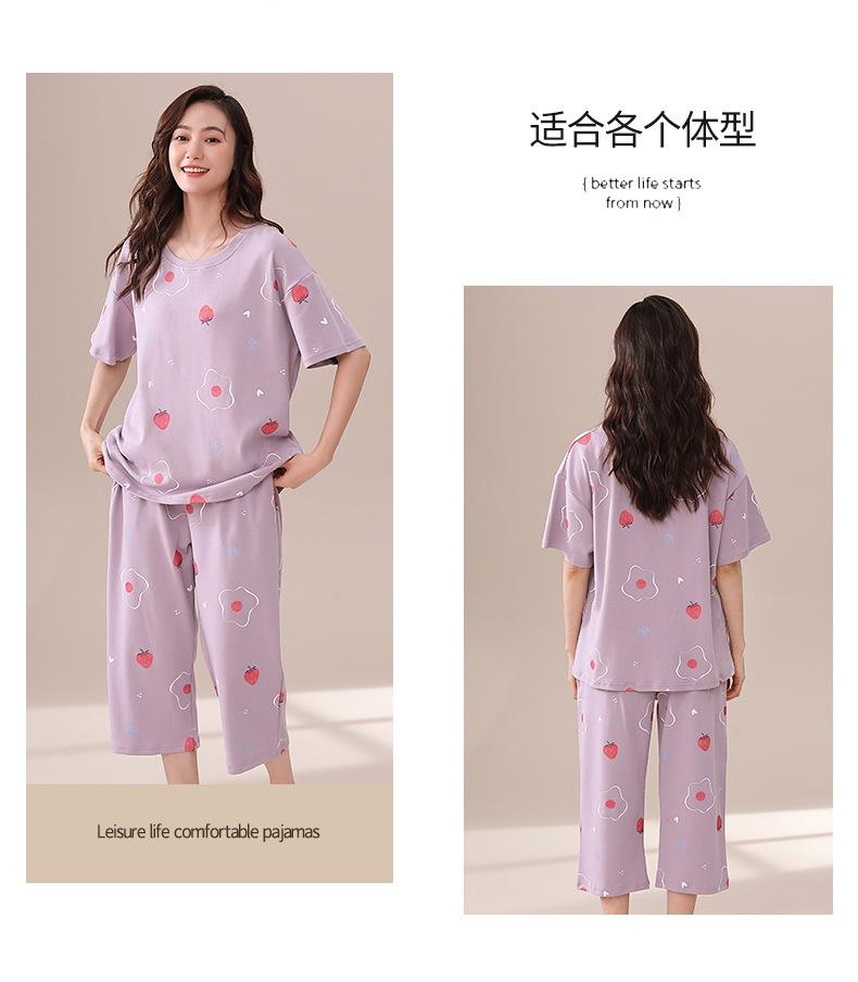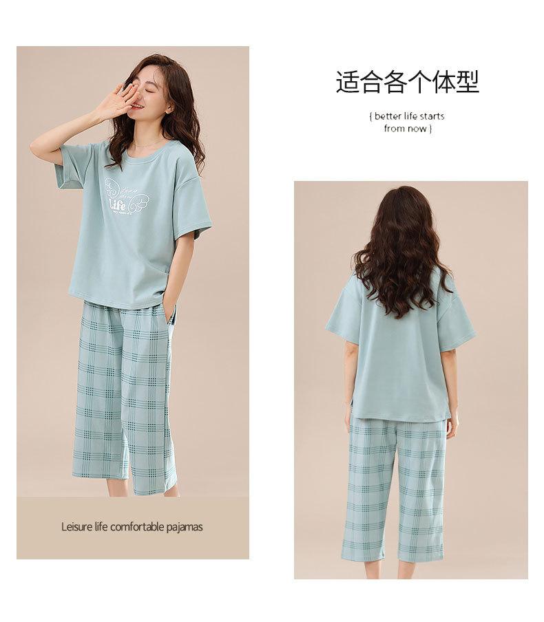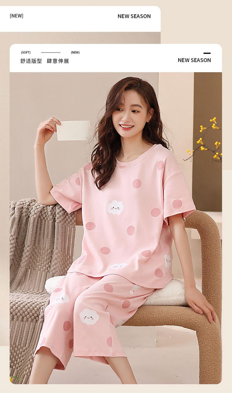 Pijama de Verano para Mujer Algodón Manga Corta Pantalón Capri Cuello Redondo Jersey Ropa para el Hogar Algodón Ropa Exterior Traje Dulce Lindo