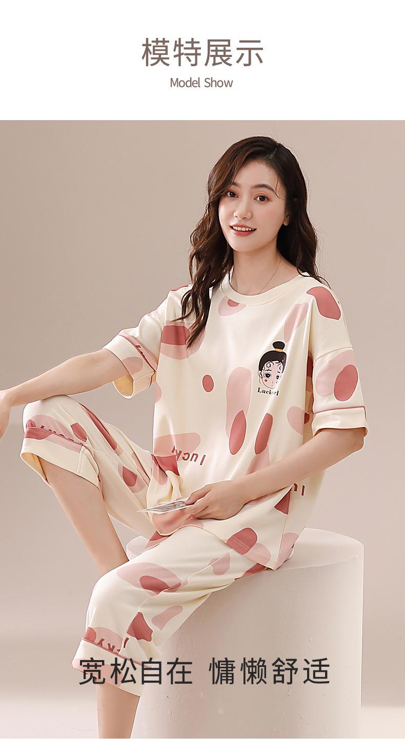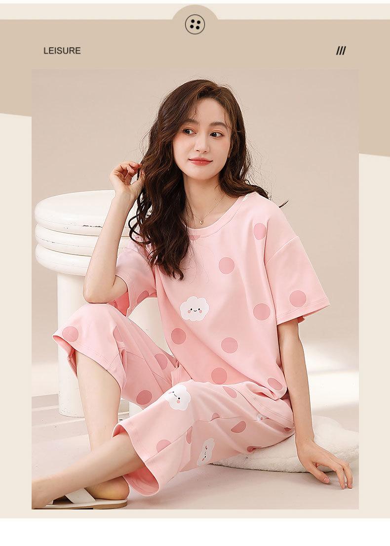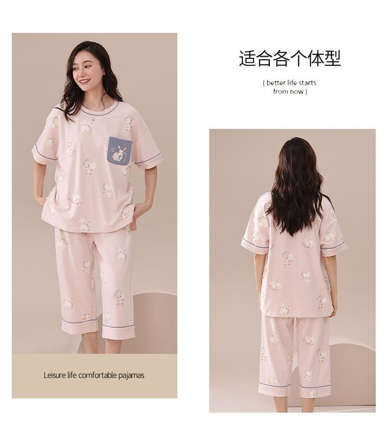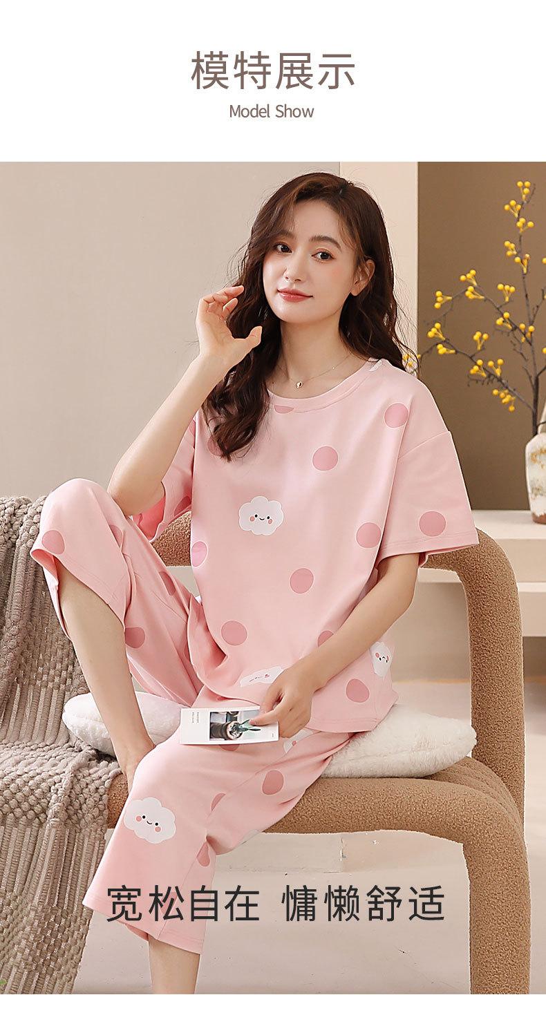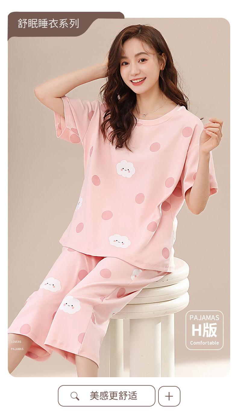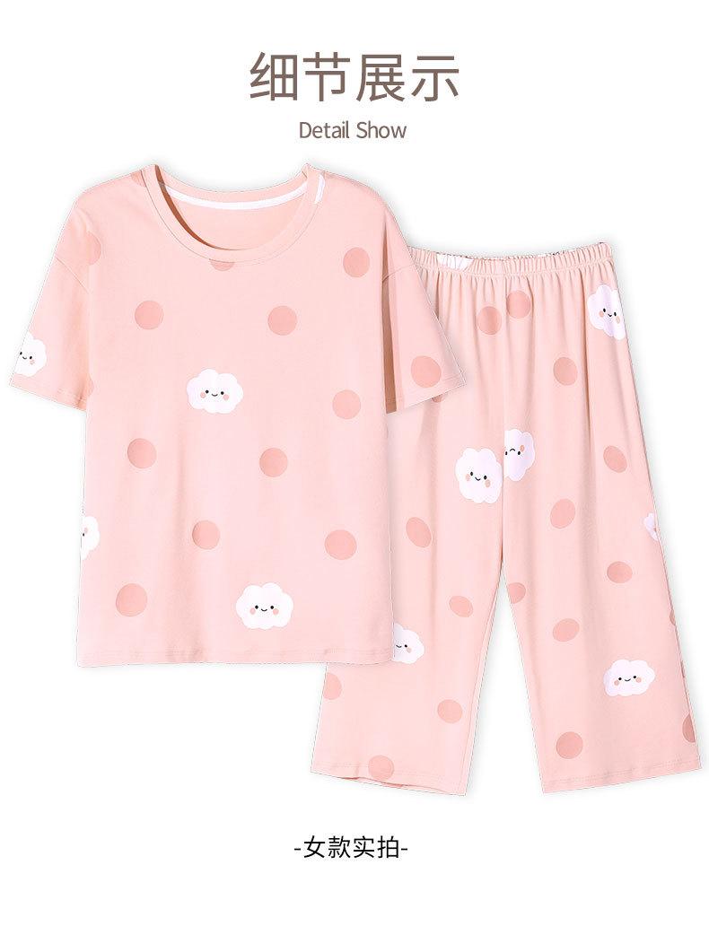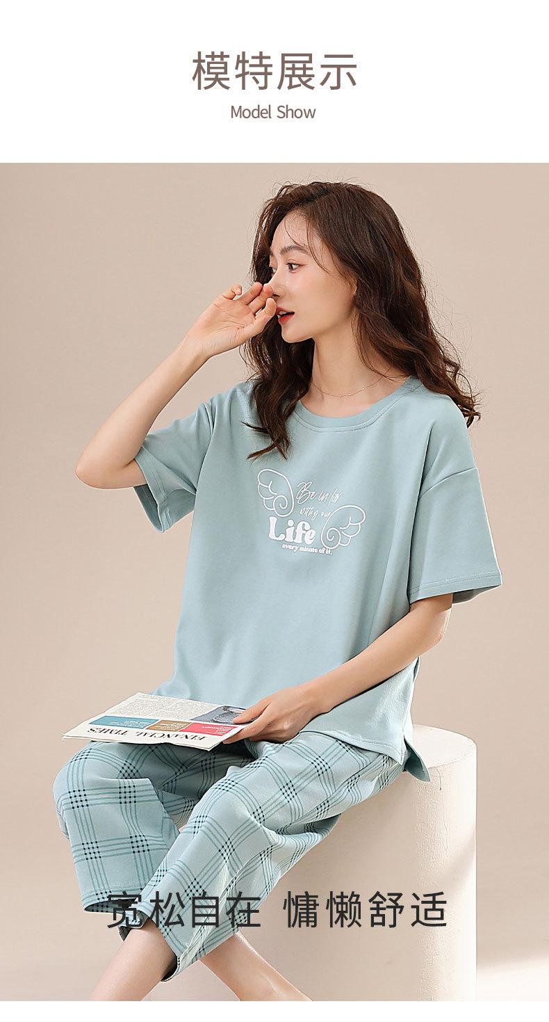 Pijama de Verano para Mujer Algodón Manga Corta Pantalón Capri Cuello Redondo Jersey Ropa para el Hogar Algodón Ropa Exterior Traje Dulce Lindo