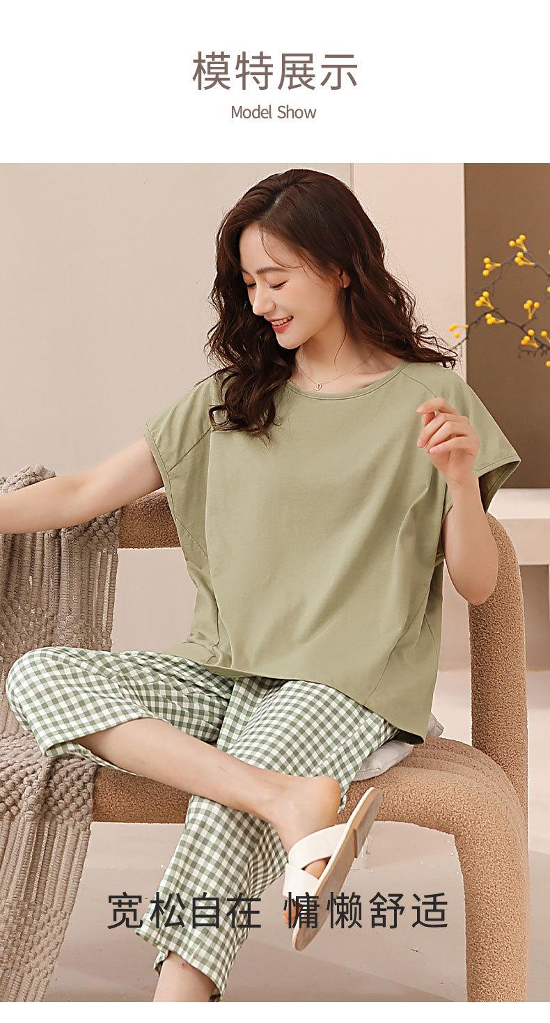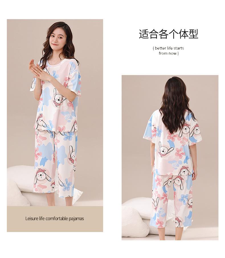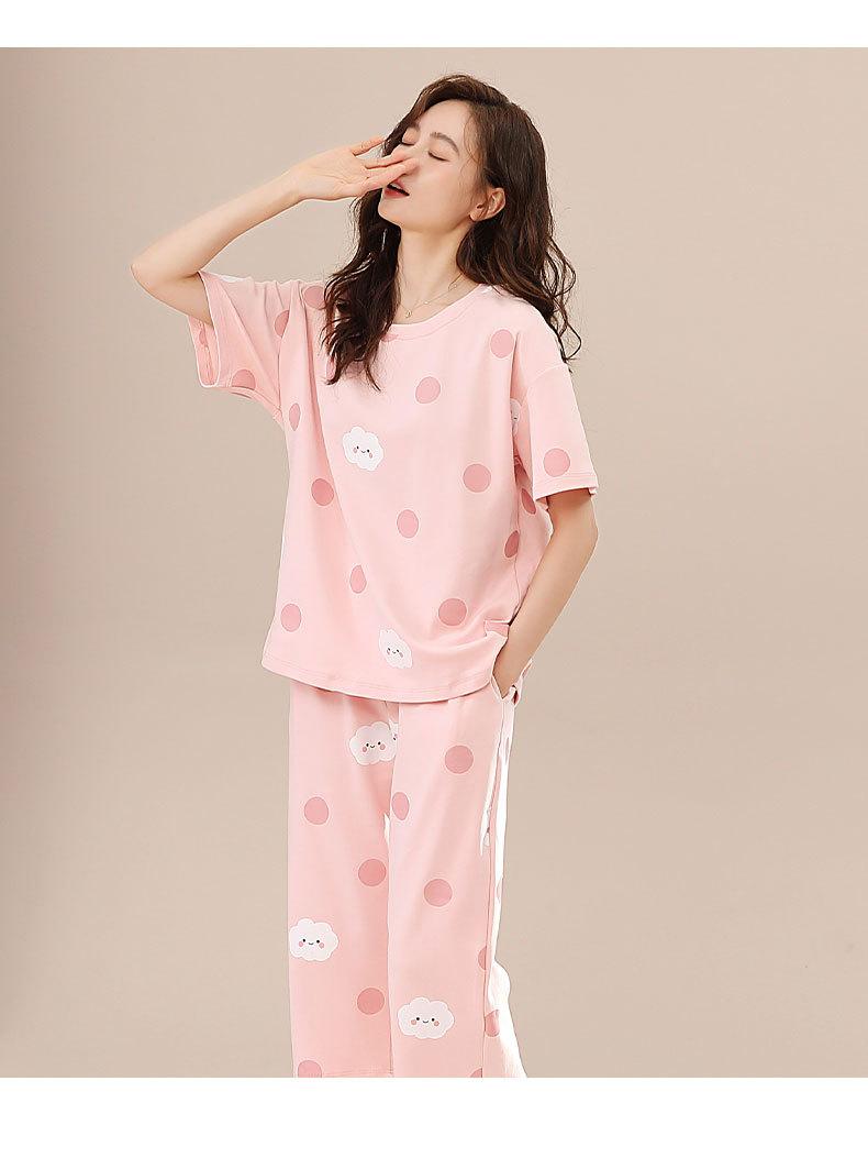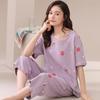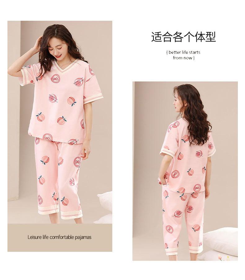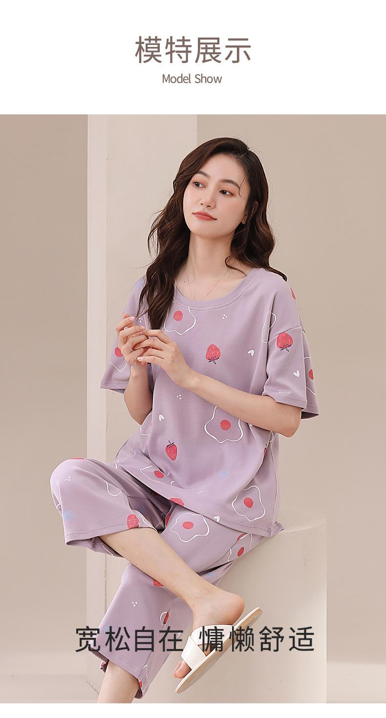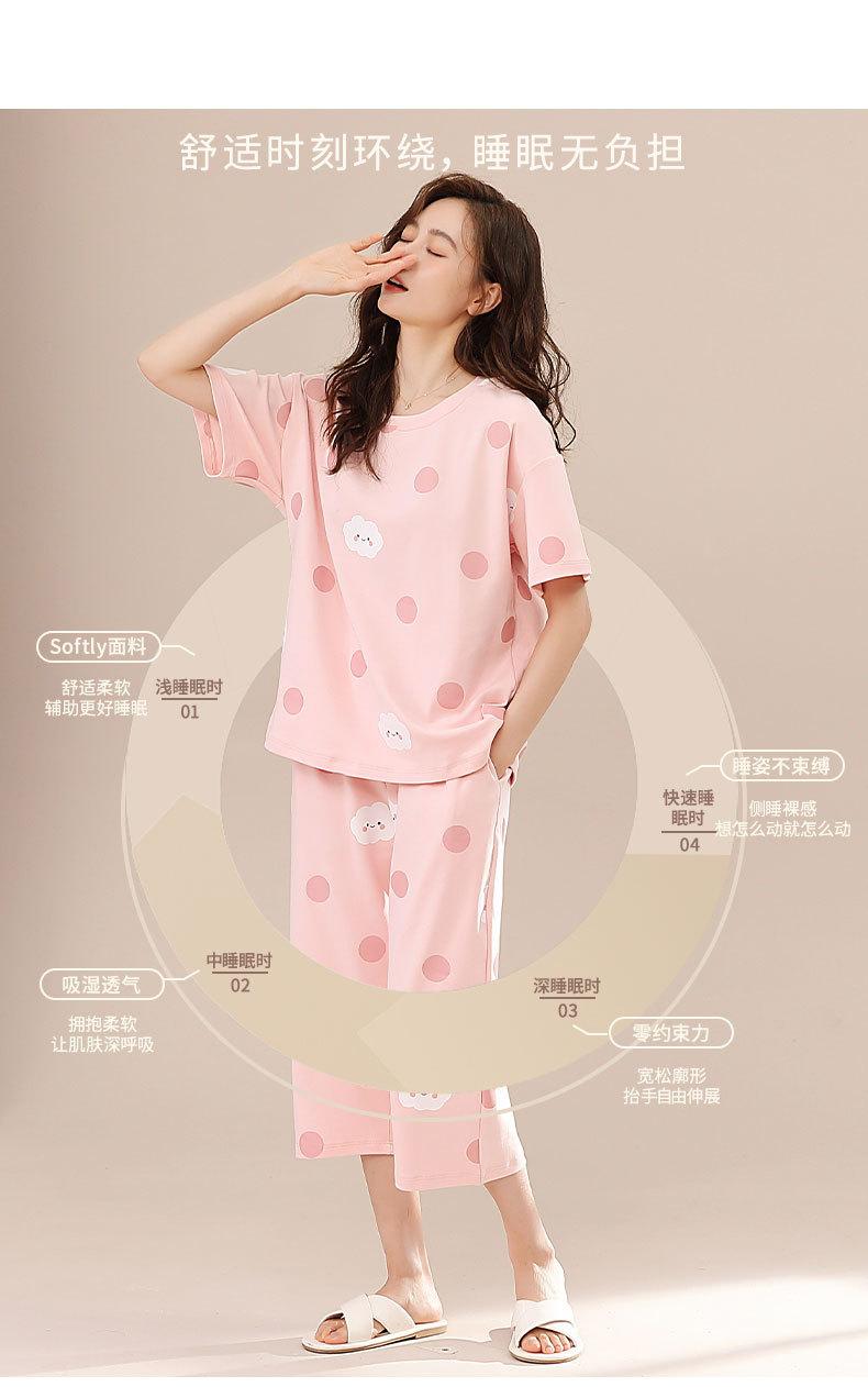 Pijama de Verano para Mujer Algodón Manga Corta Pantalón Capri Cuello Redondo Jersey Ropa para el Hogar Algodón Ropa Exterior Traje Dulce Lindo