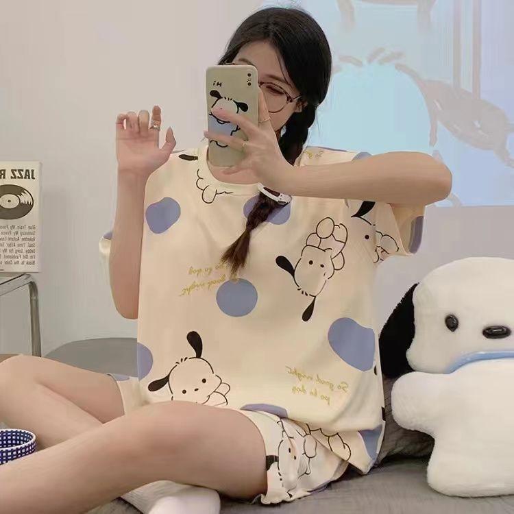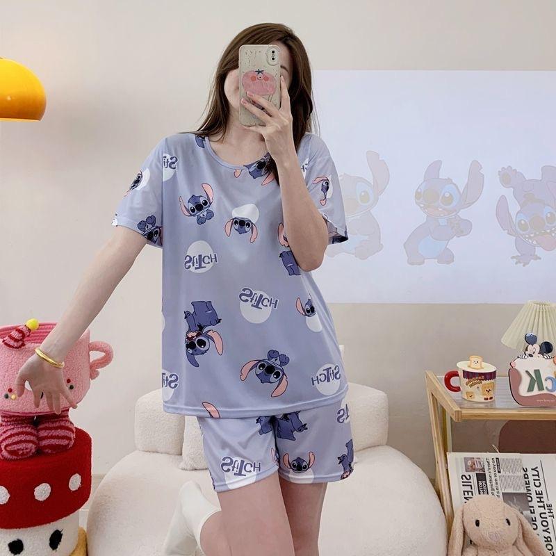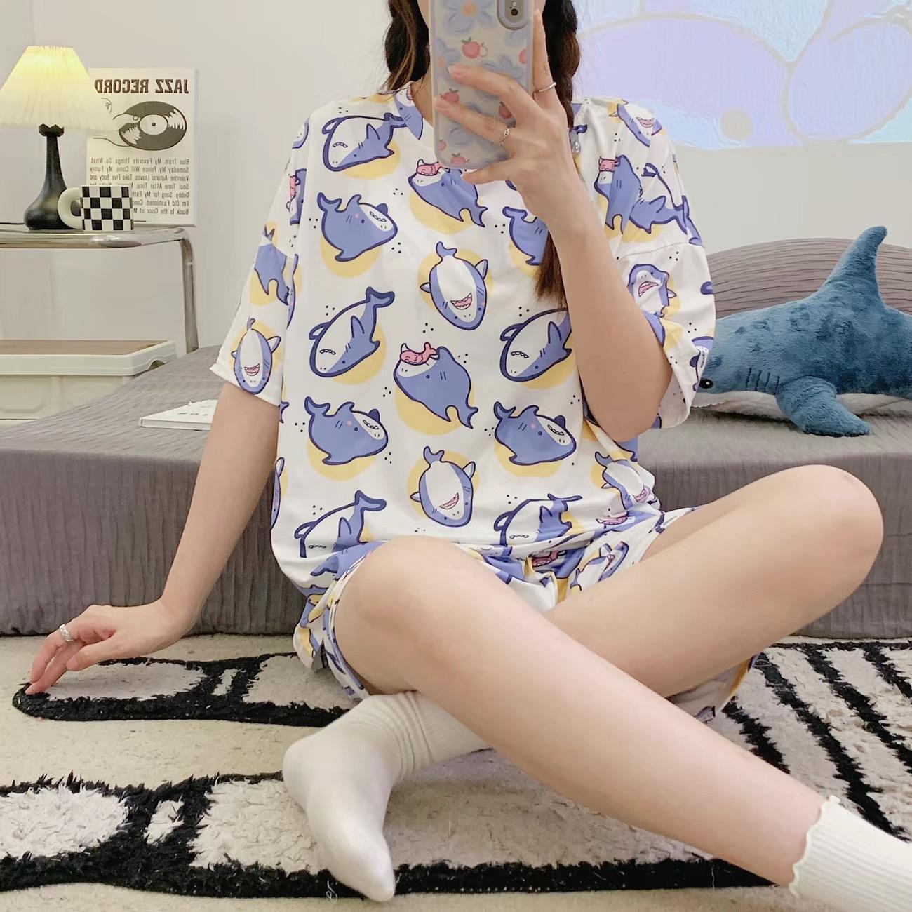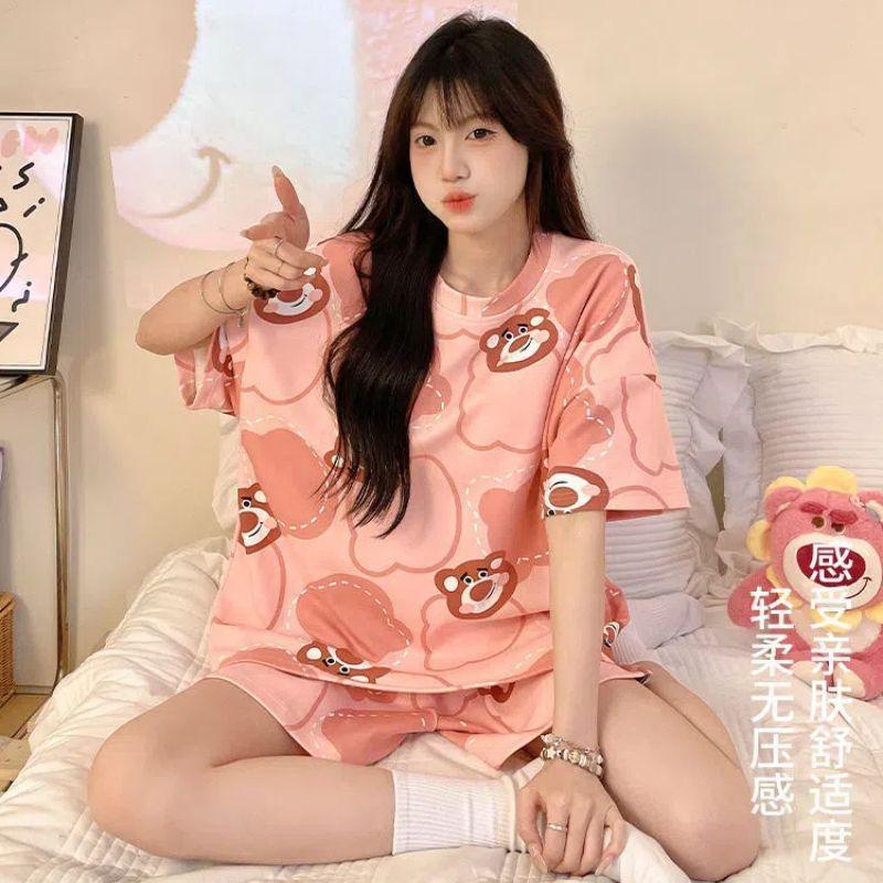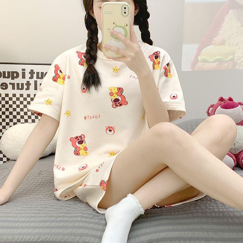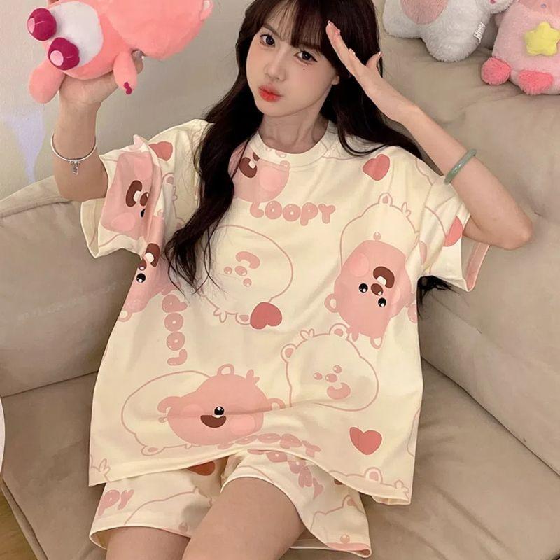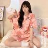 Pijama de Cuello Redondo para Mujer Verano Casual Manga Corta Shorts Sueltos Dibujos Animados Estudiante Ropa de Casa Traje de Dos Piezas Seda de Leche Tendencia