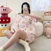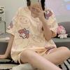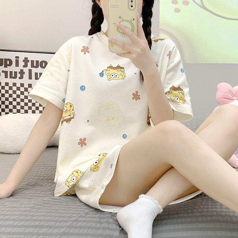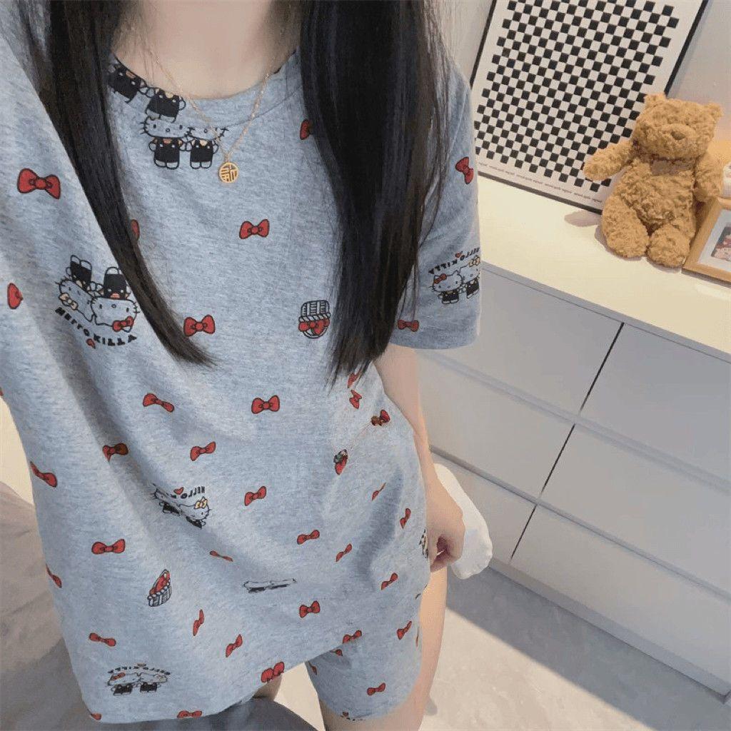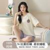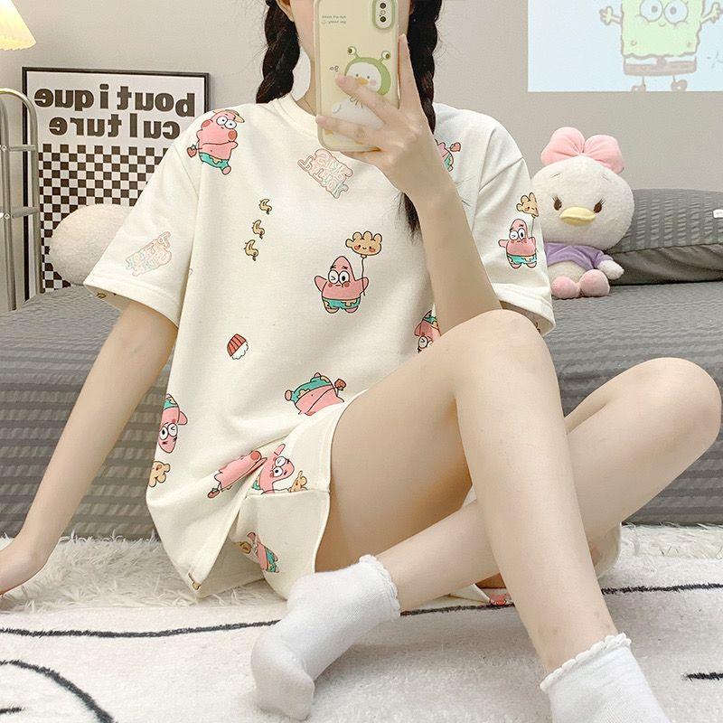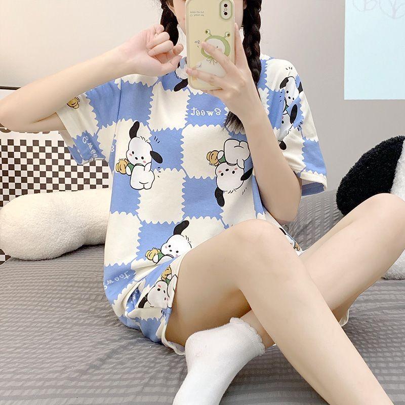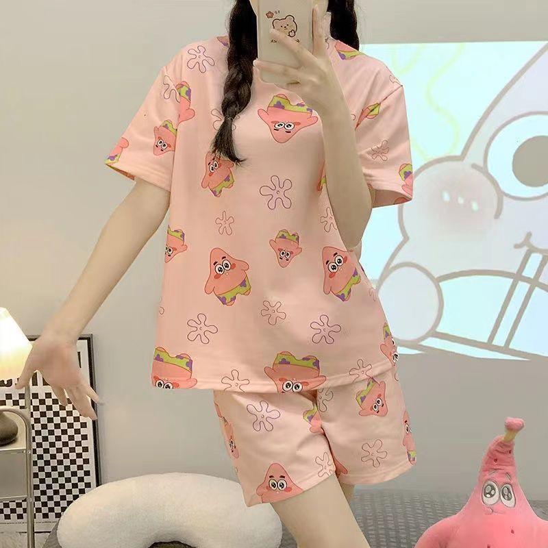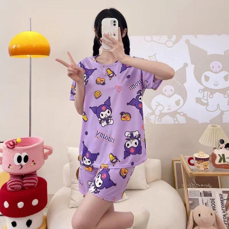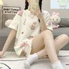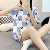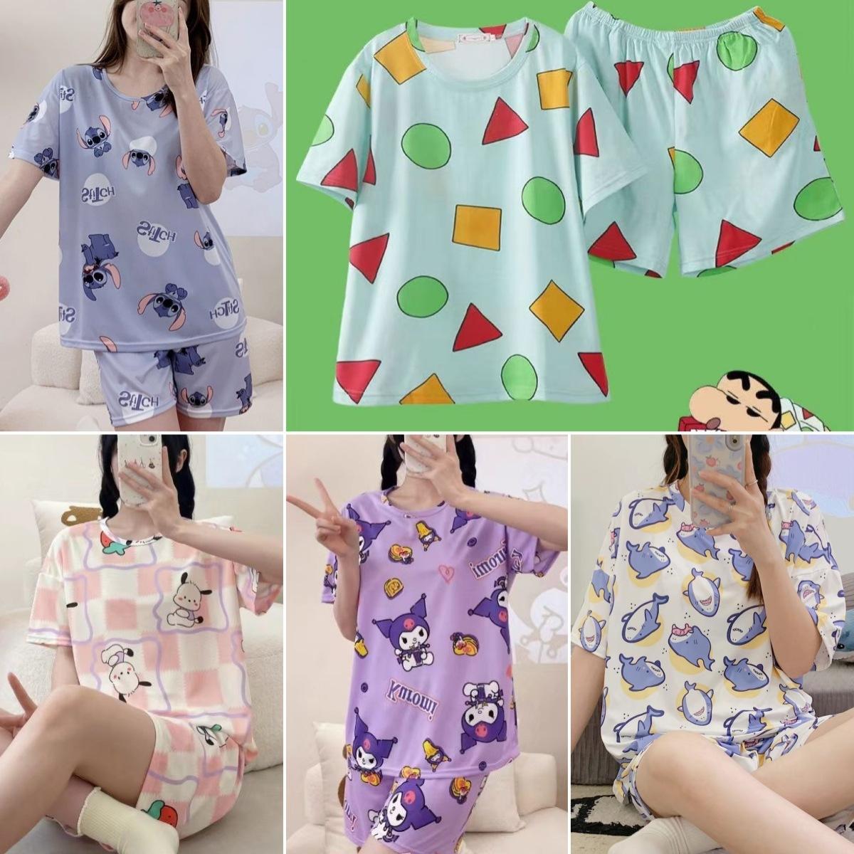 Pijama de Cuello Redondo para Mujer Verano Casual Manga Corta Shorts Sueltos Dibujos Animados Estudiante Ropa de Casa Traje de Dos Piezas Seda de Leche Tendencia