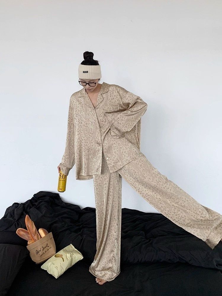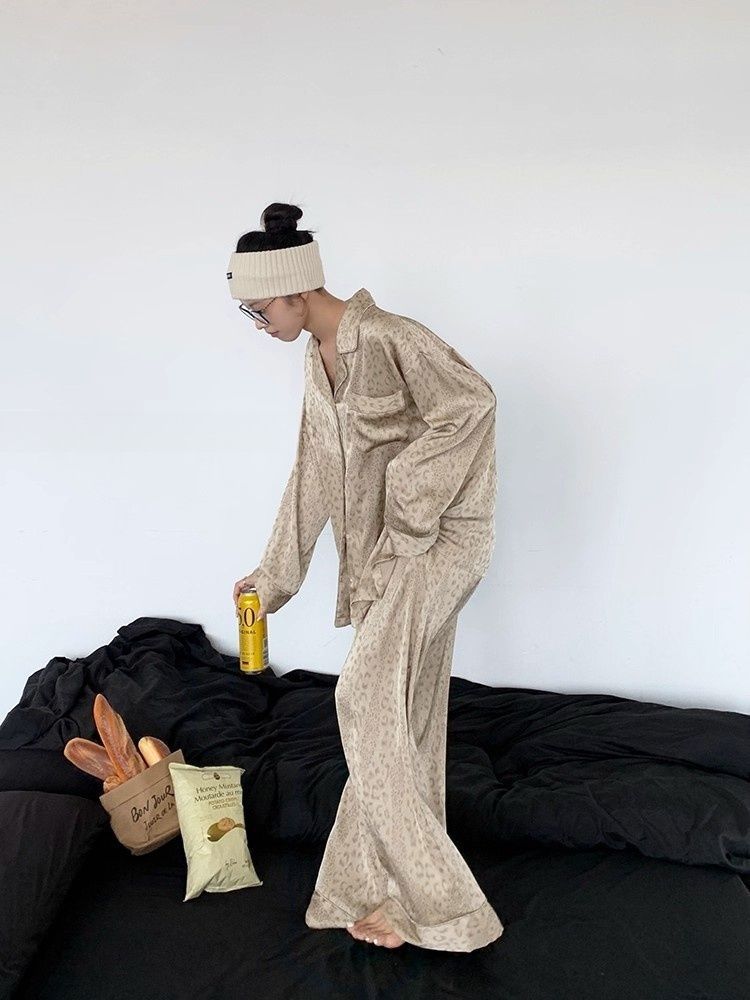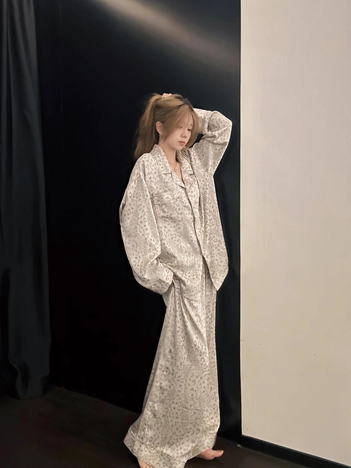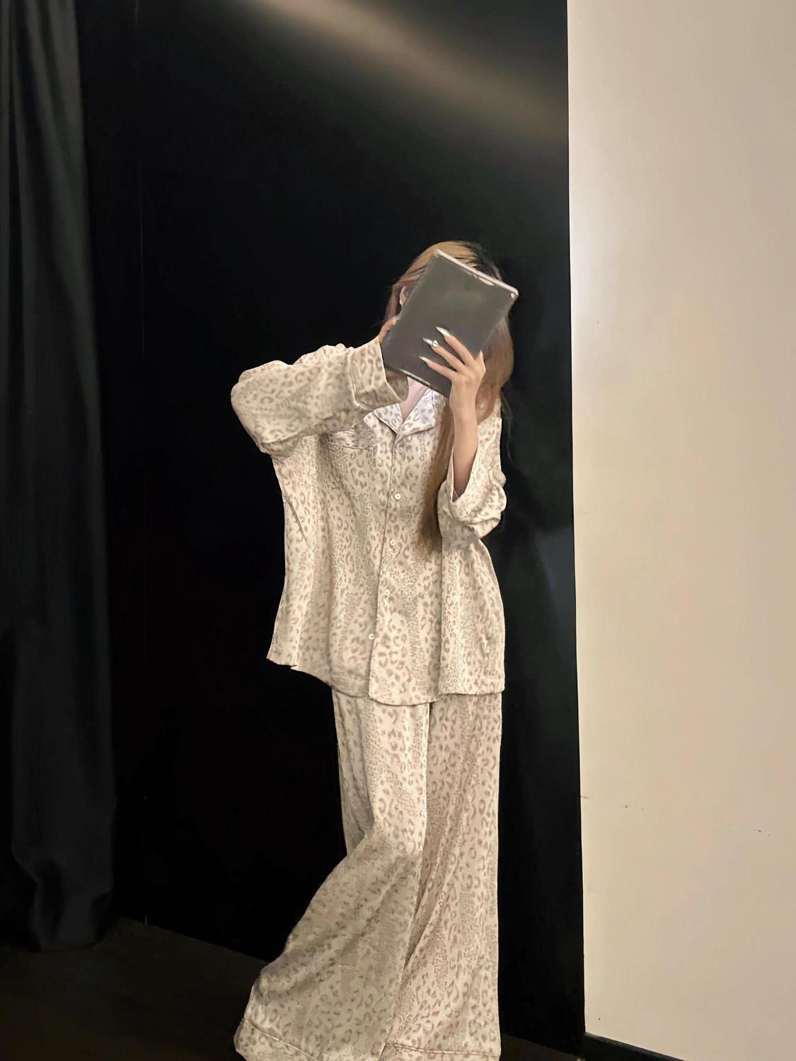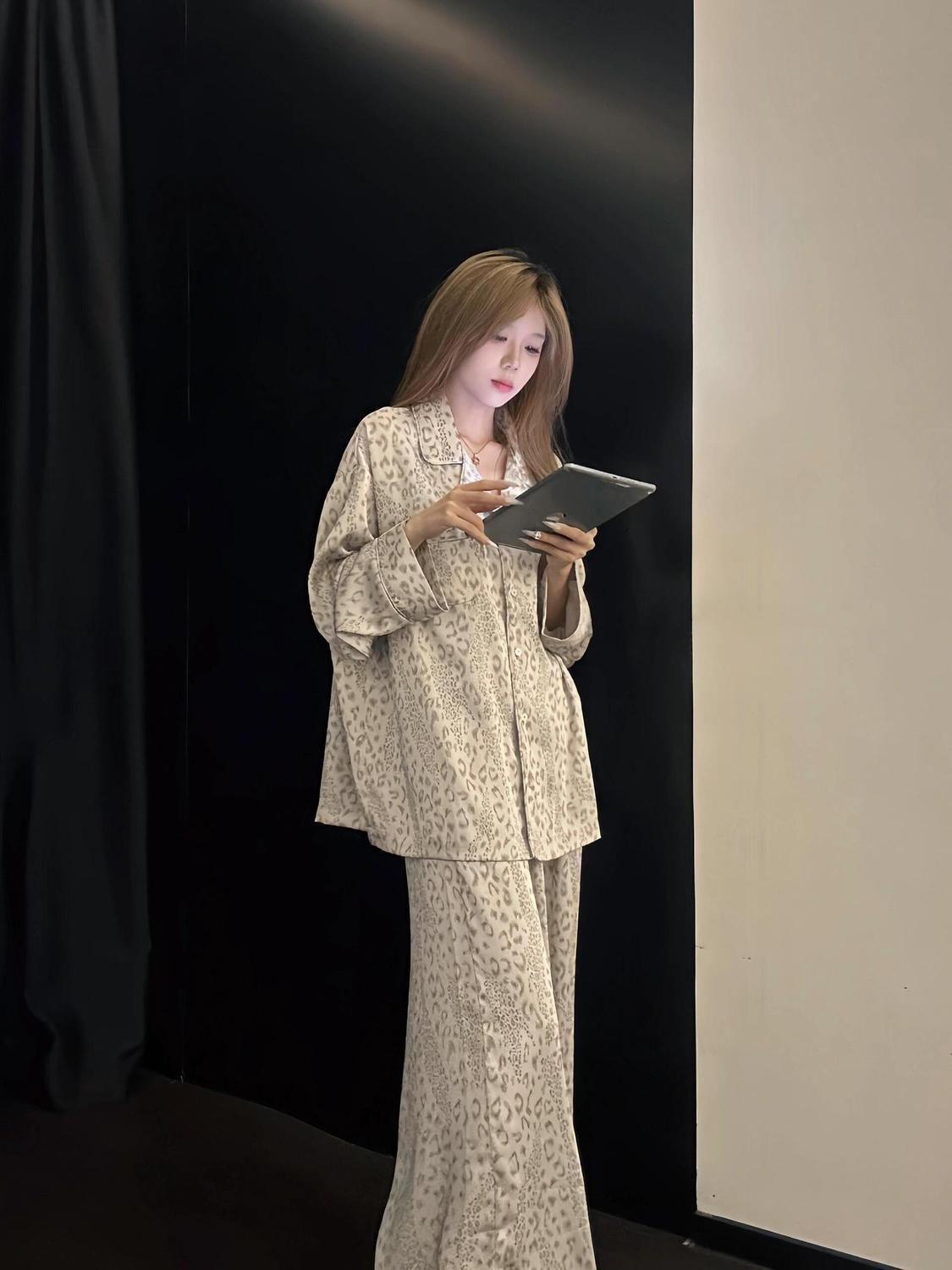 Pijama de Seda de Hielo de Alta Densidad para Otoño e Invierno con Estampado de Leopardo y Dulce Temperamento para Mujer, Conjunto que se Puede Usar Fuera de Casa