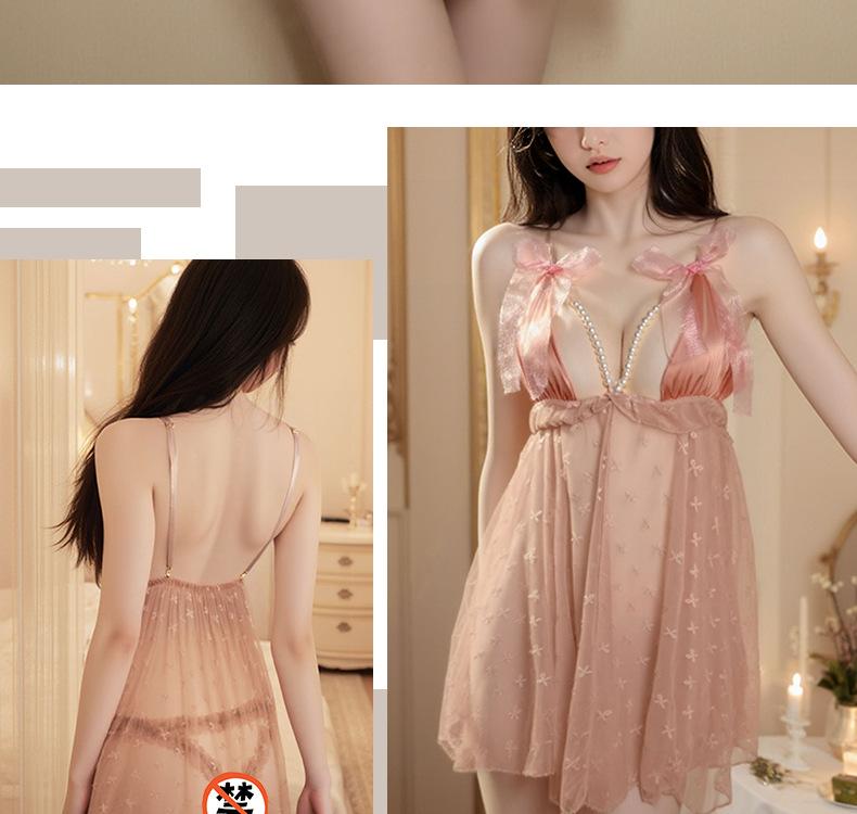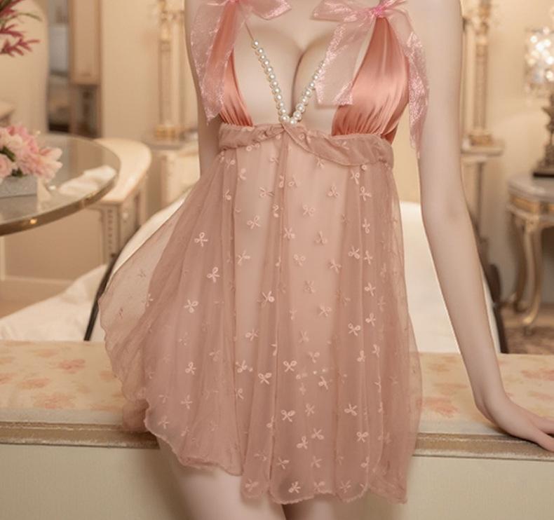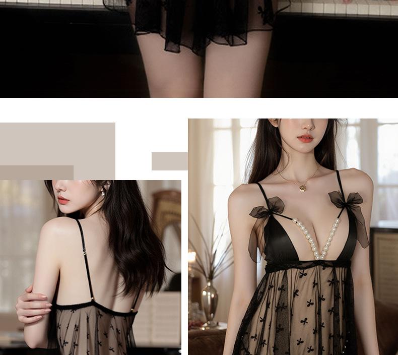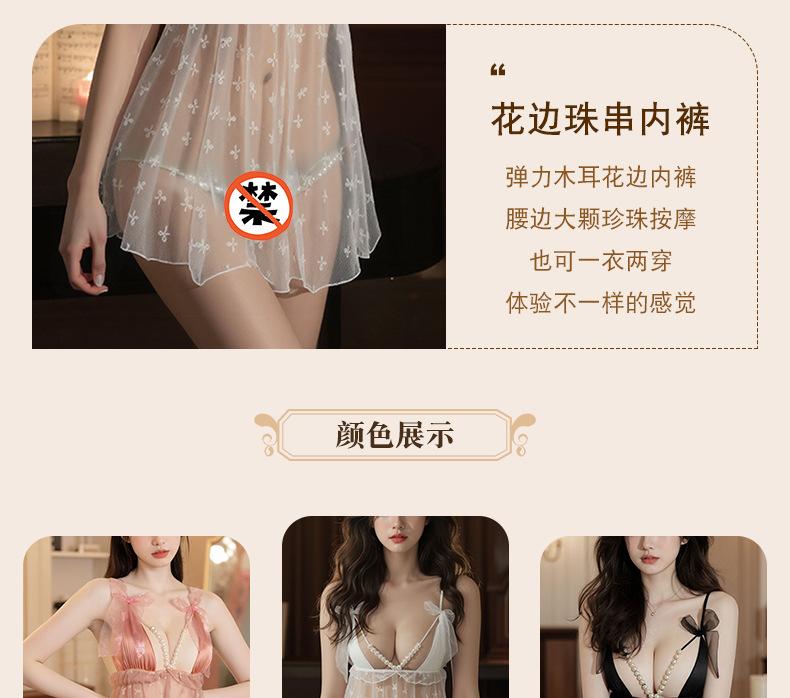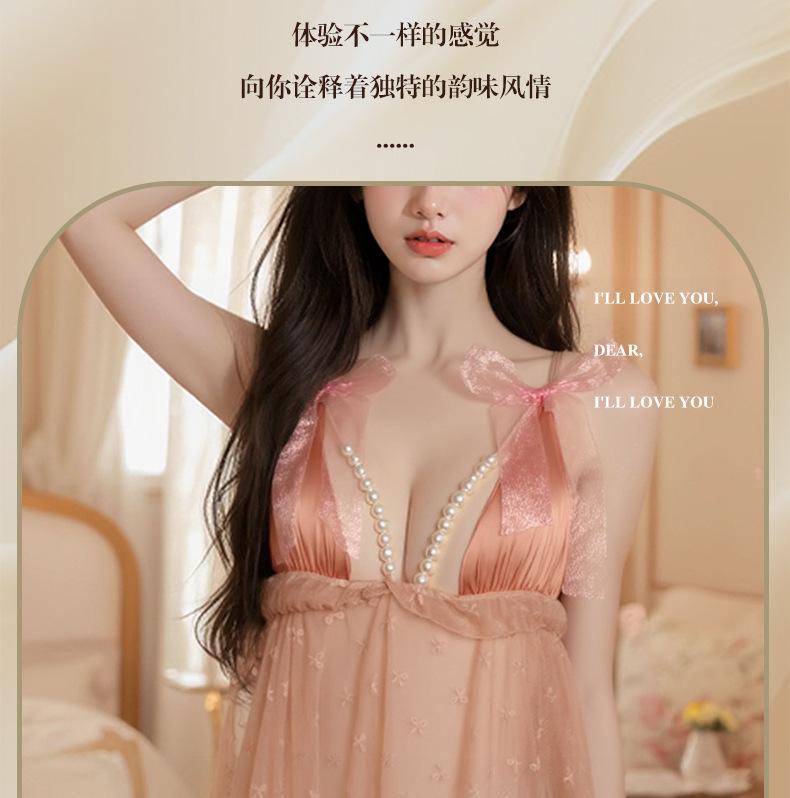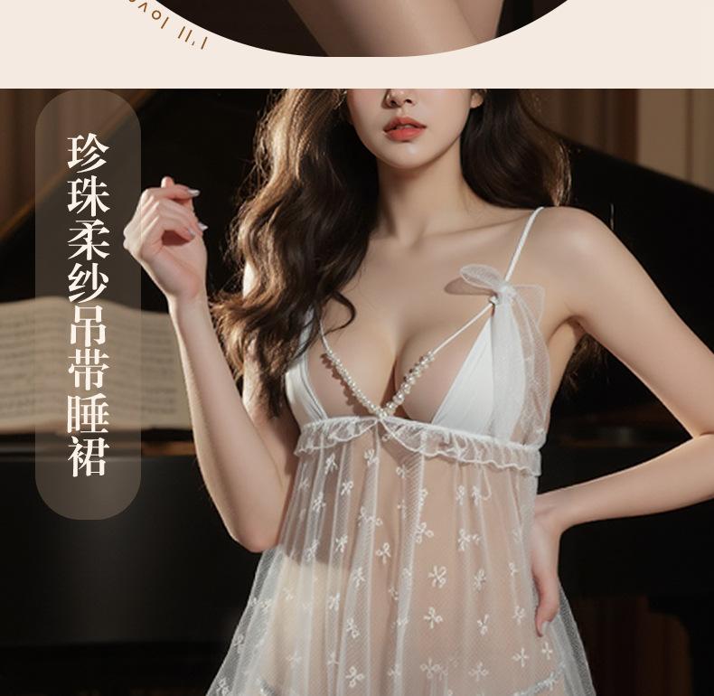Pijama Camisola Sexy Nueva para Mujer Encaje Lazo Volante Vestido Puro Deseo con Perla Lencería Transparente