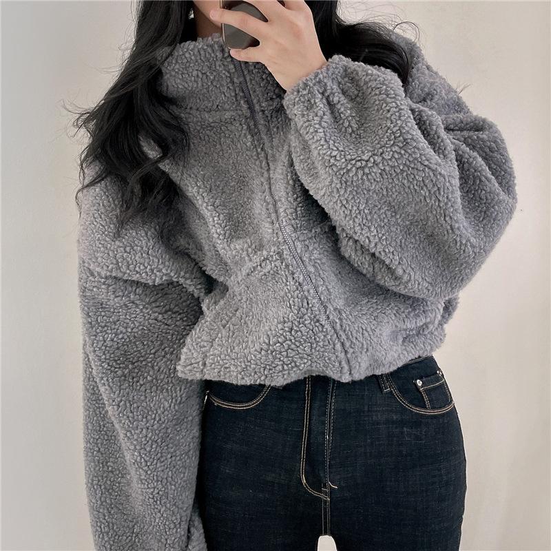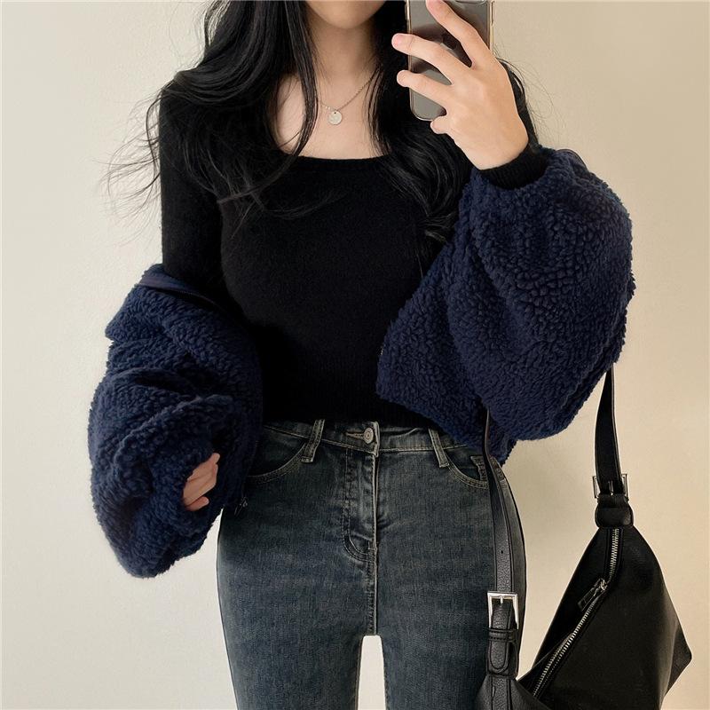 Cárdigan básico corto versátil estilo perezoso grueso de lana de cordero estilo coreano