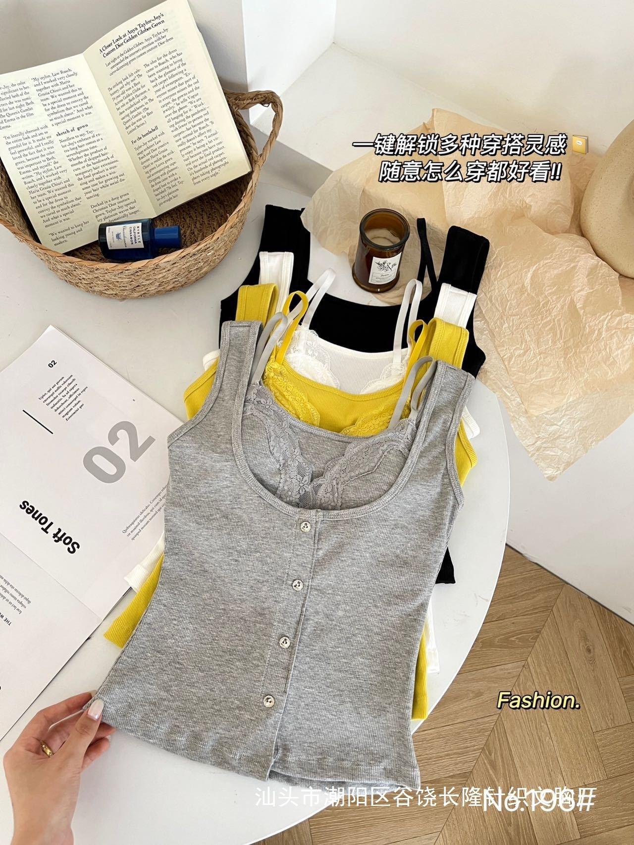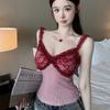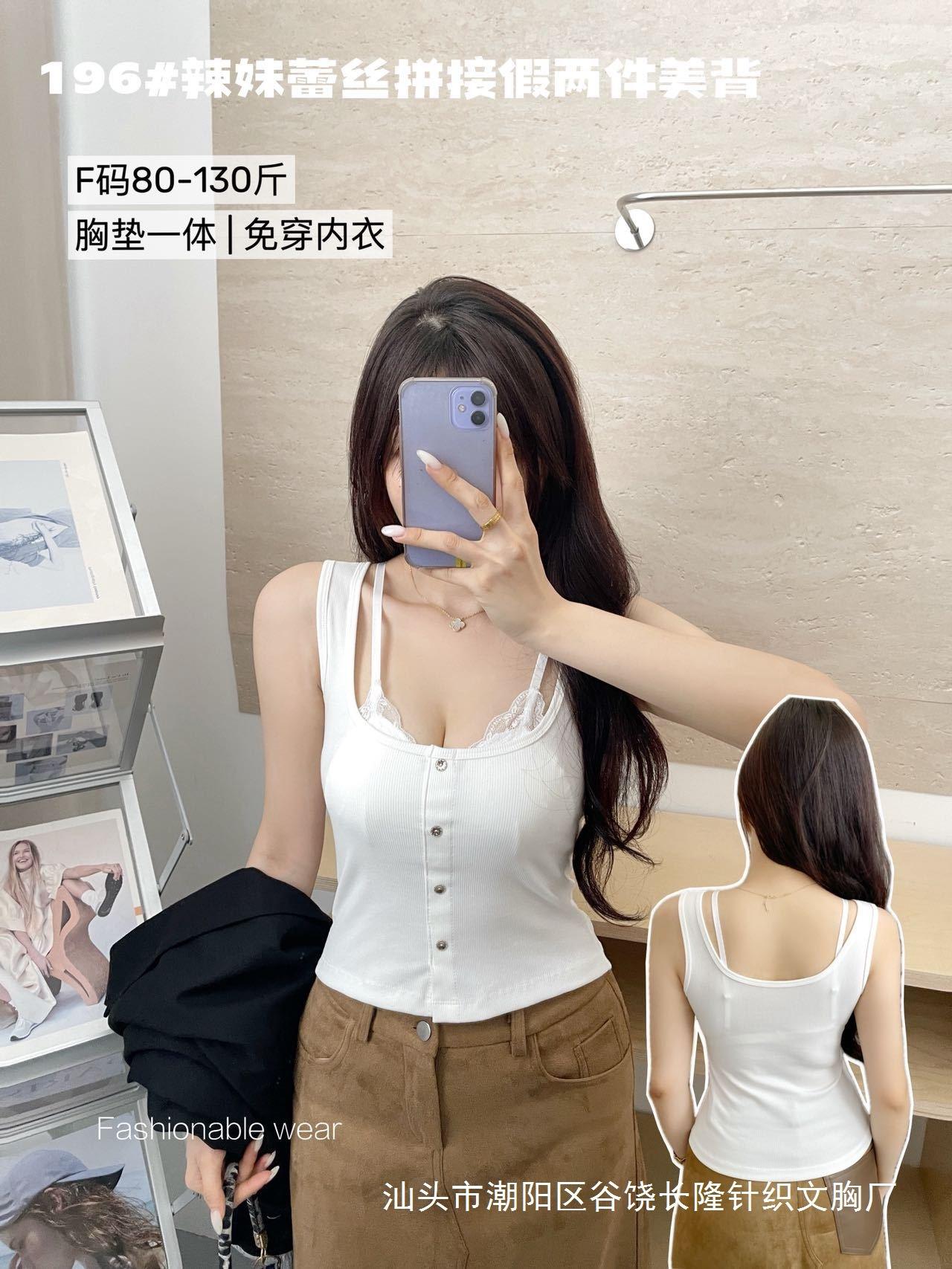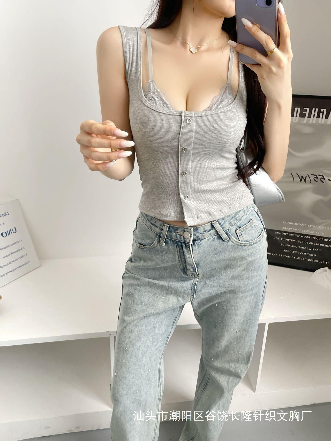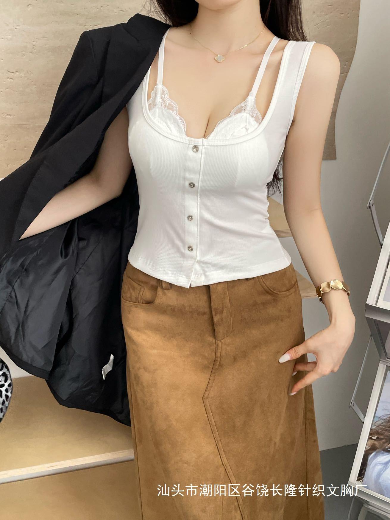 Chica Picante Encaje Patchwork Falso Dos Piezas Hermoso Espalda Ropa Interior Chaleco de Hombro Ancho para Mujer con Diseño de Almohadilla para el Pecho Top Adelgazante Sexy