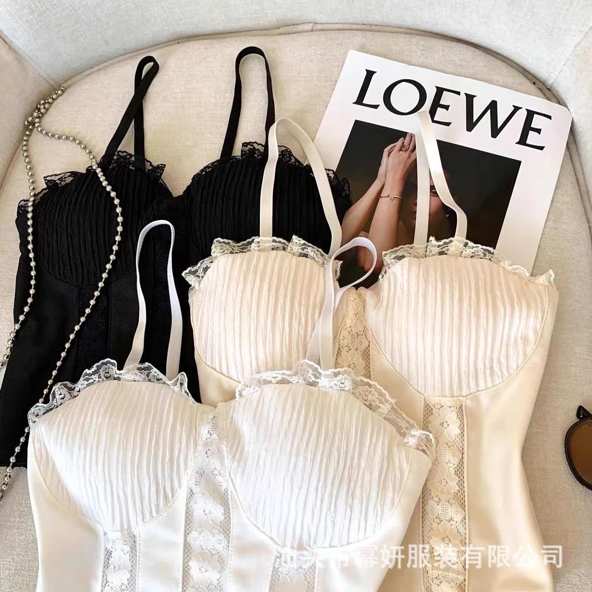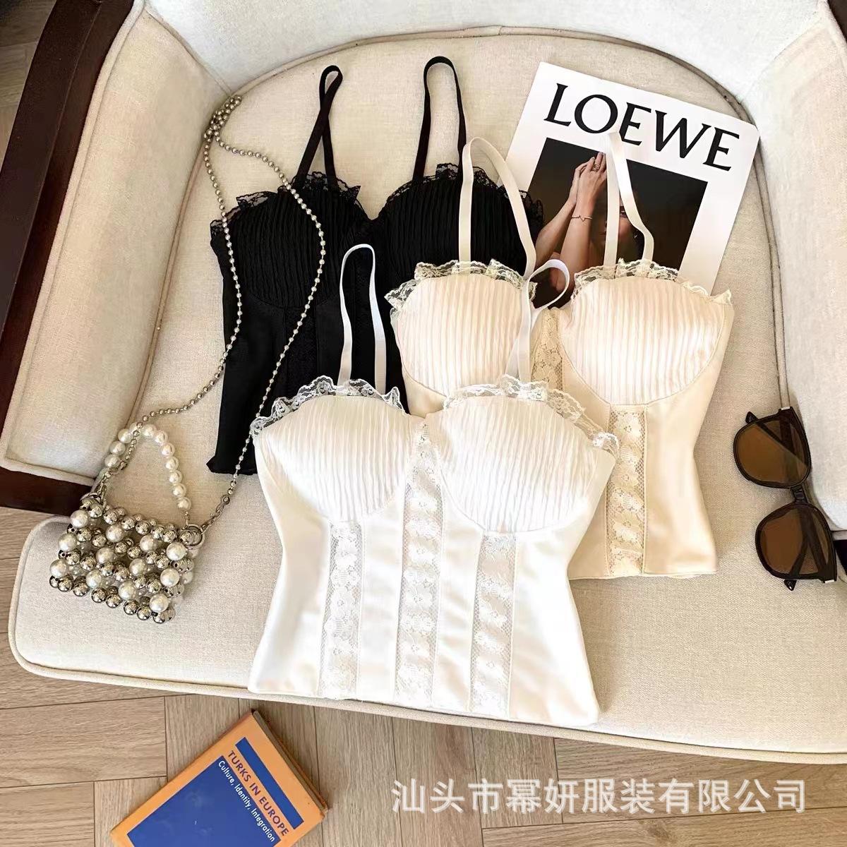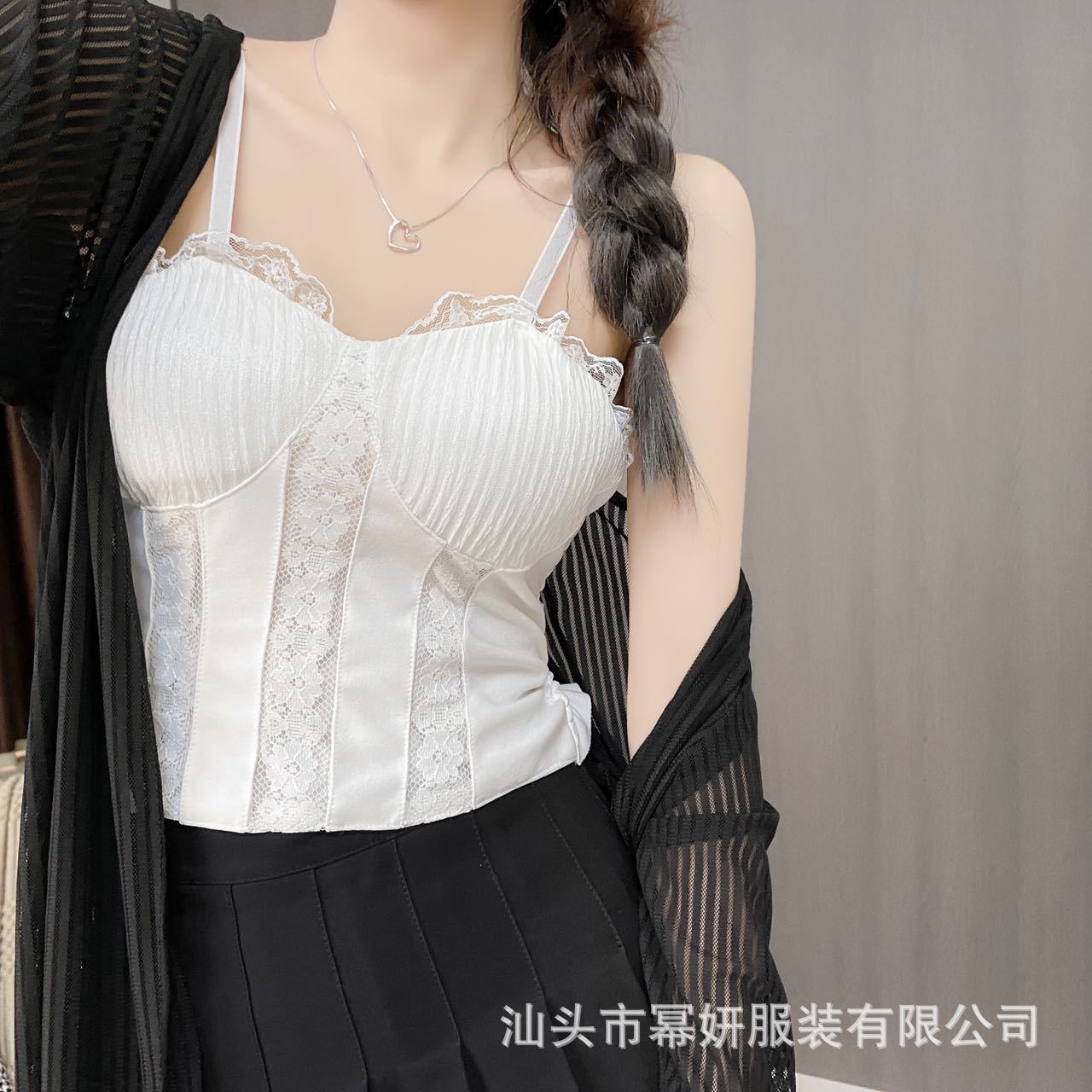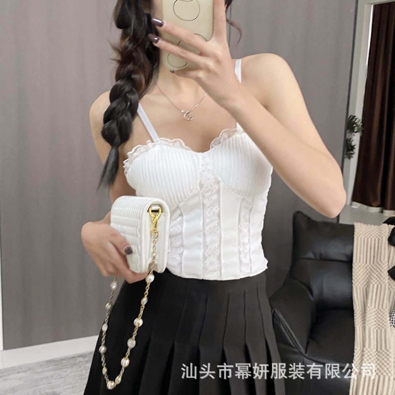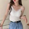 Camisola de Estilo Dulce Puro con Tirantes de Encaje de Color Contrastante para Mujer, Interior Sexy Delgado con Almohadilla en el Pecho