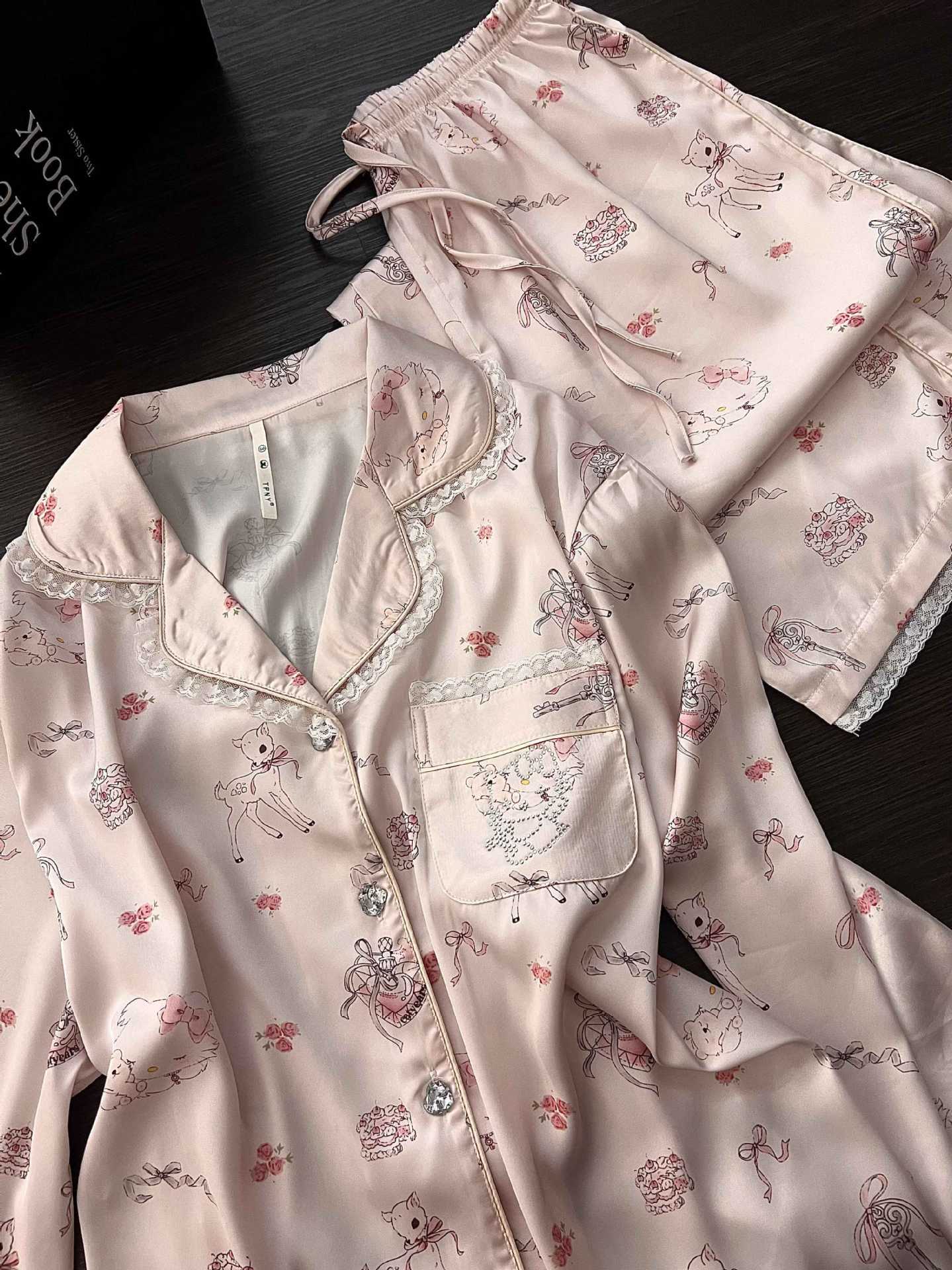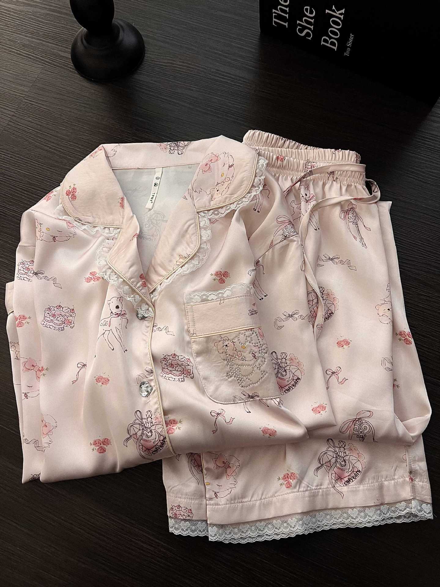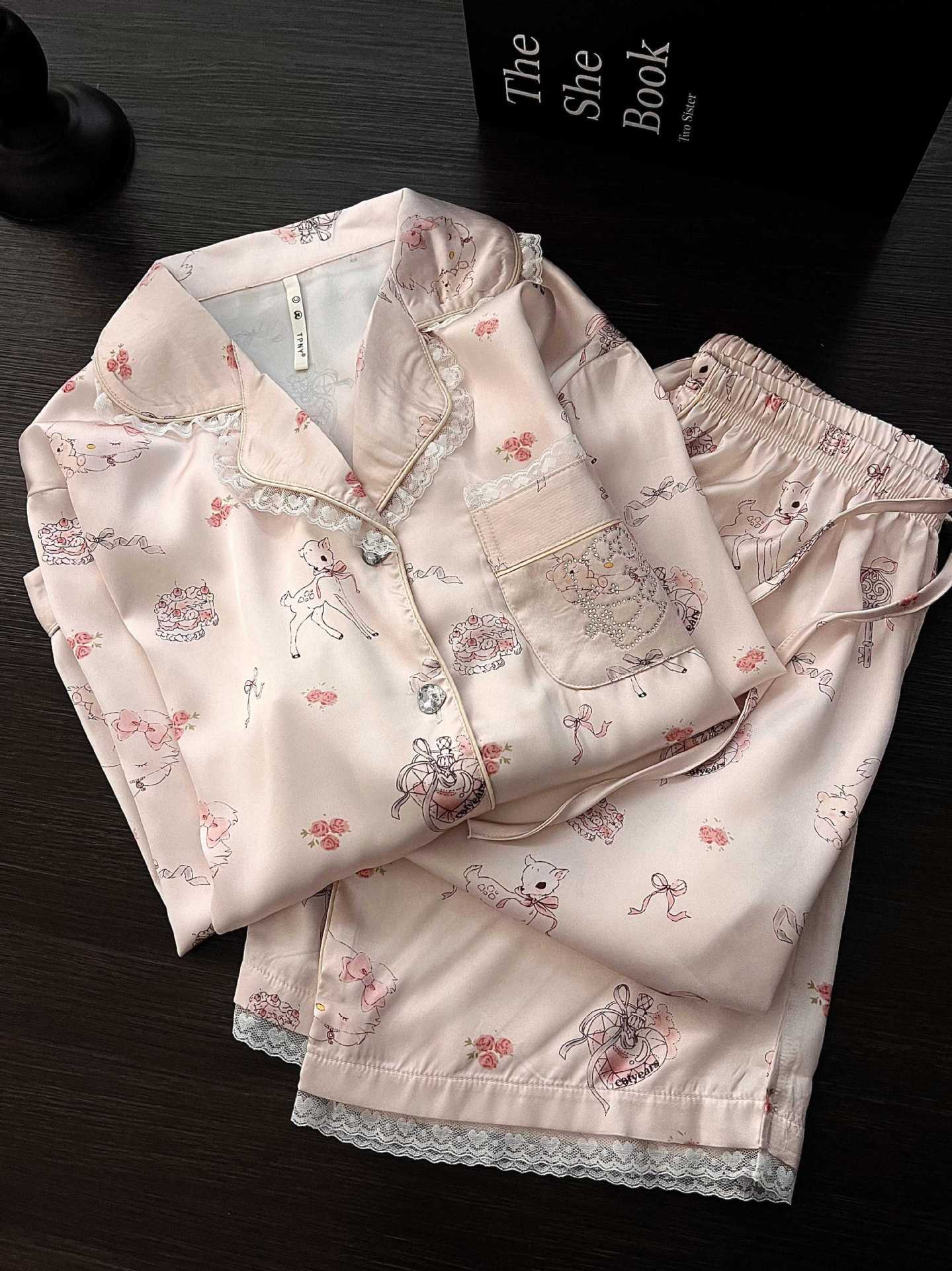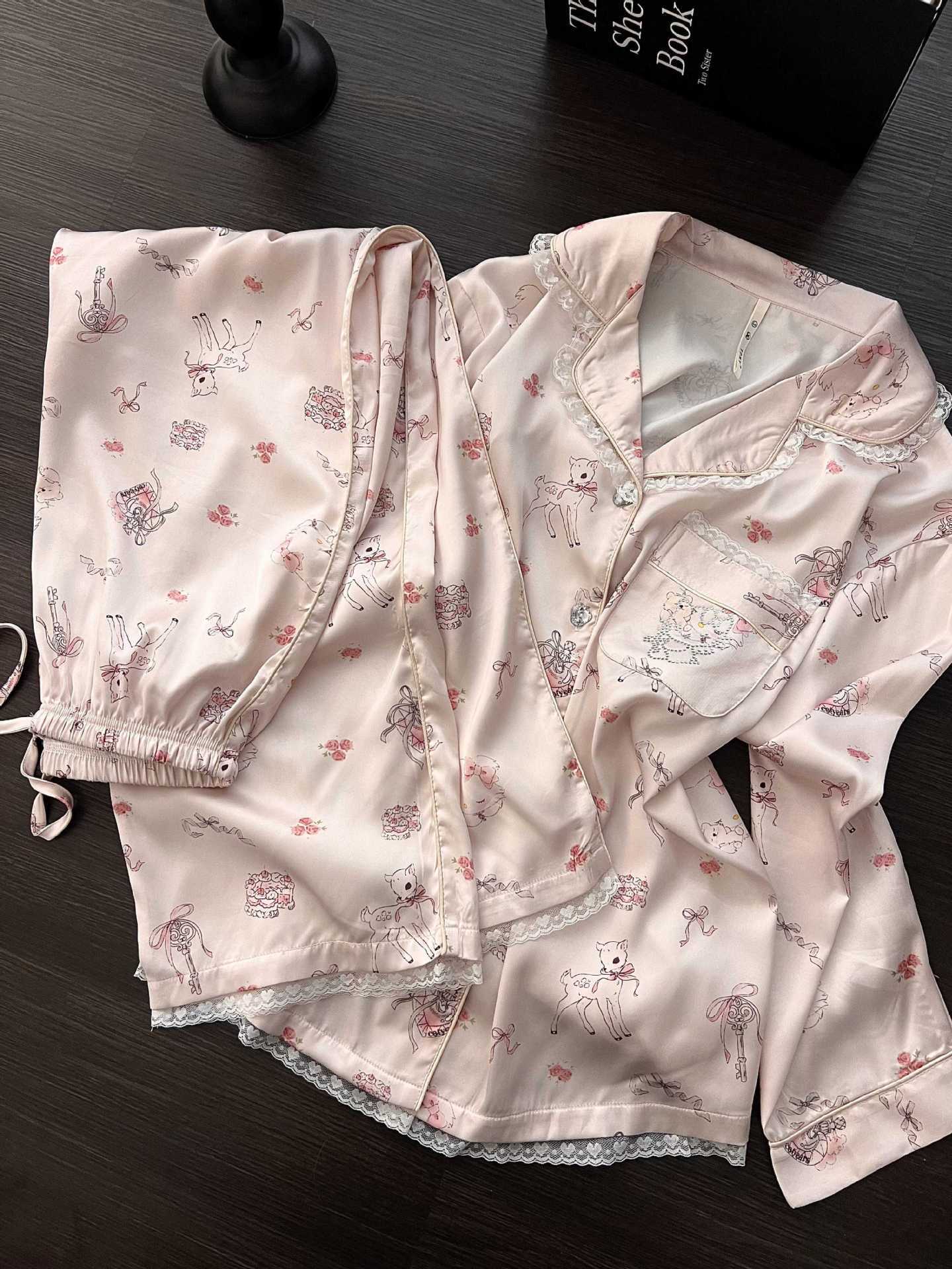 Pijama Rosa Femenino Lindo Estampado de Dibujos Animados para Mujer Verano Nuevo Estilo Talla Grande Seda de Hielo Manga Larga Pantalón Largo Conjunto de Ropa de Dormir