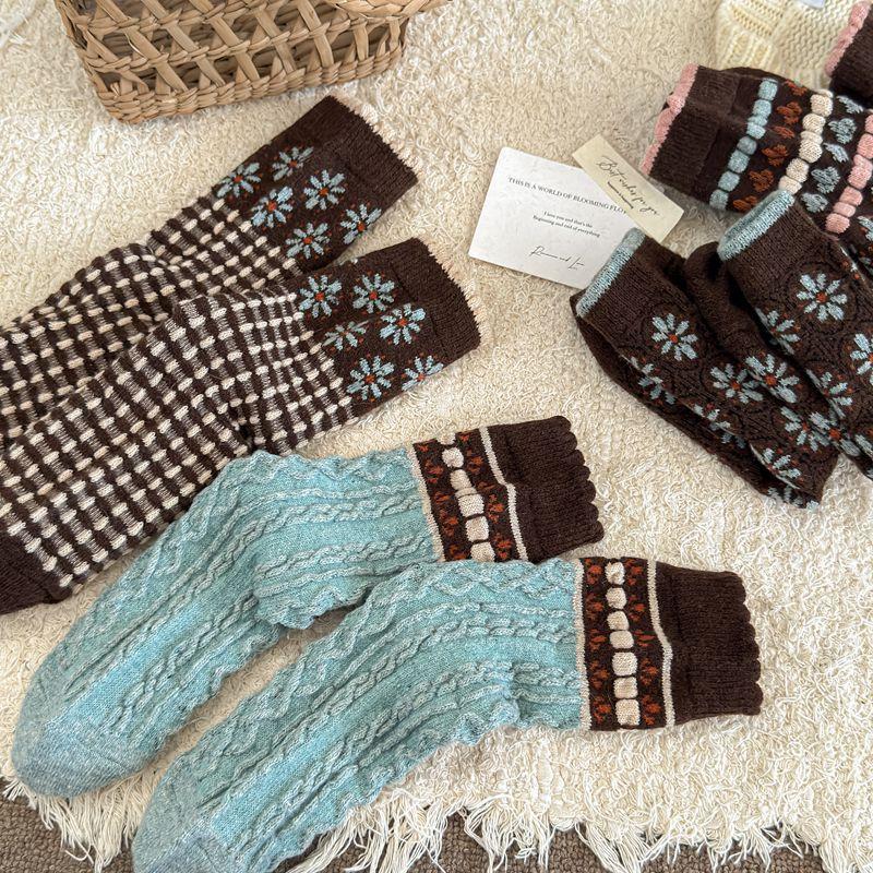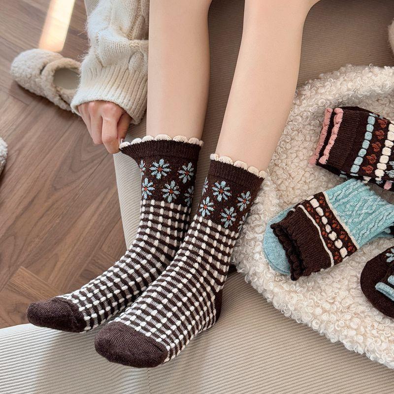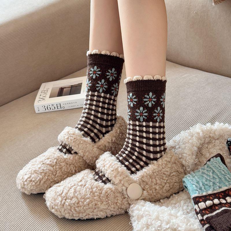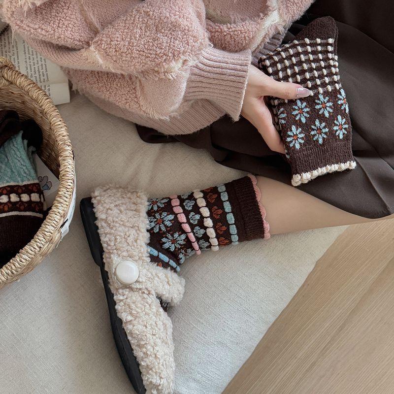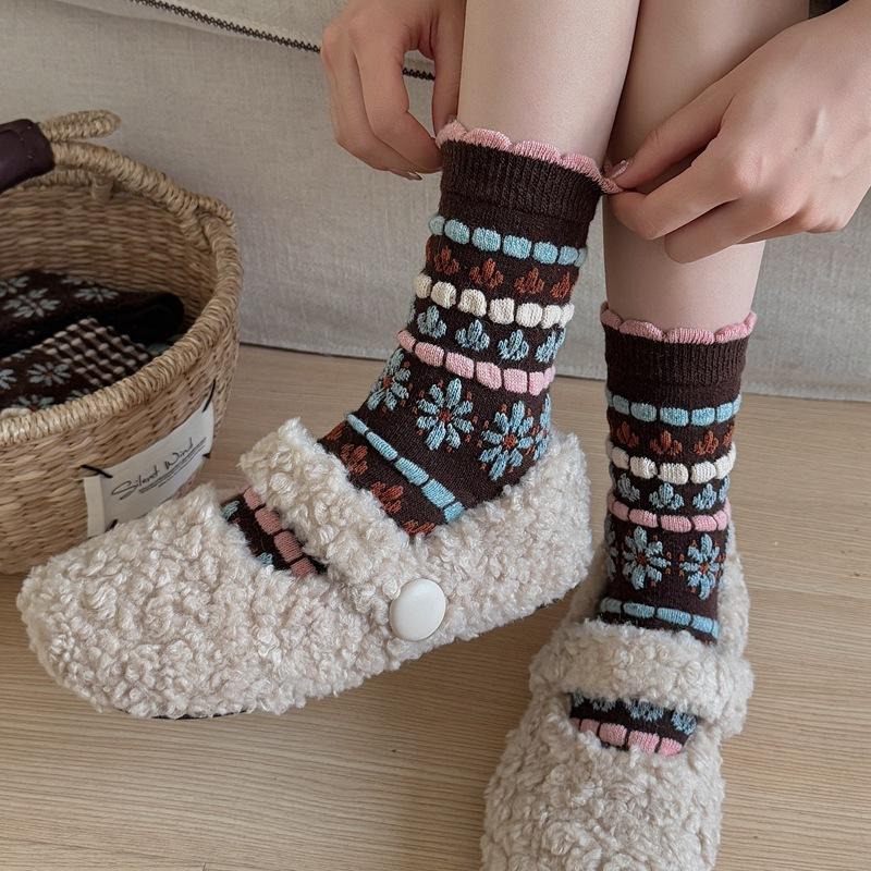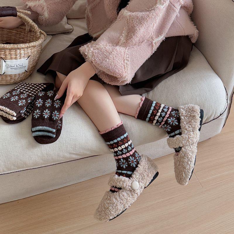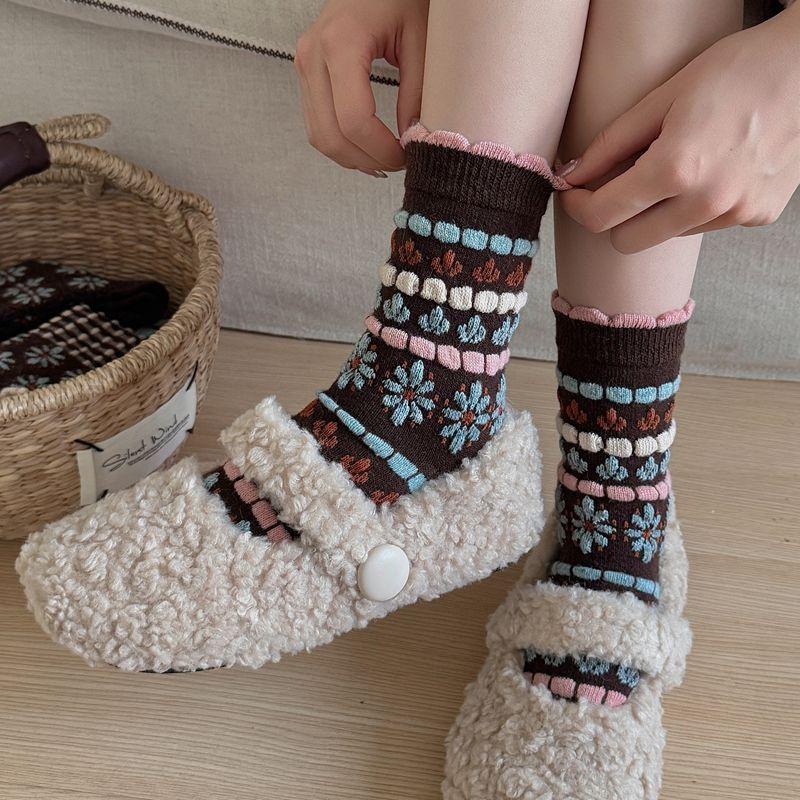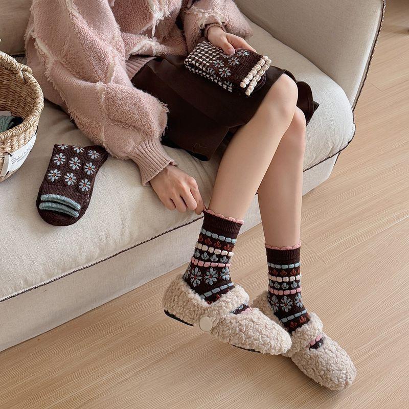 Calcetines cálidos de felpa otoño e invierno retro flor pequeña nuevos calcetines de rizo calcetines de encaje hasta media pantorrilla para mujer colegial japonés ins calcetines cálidos
