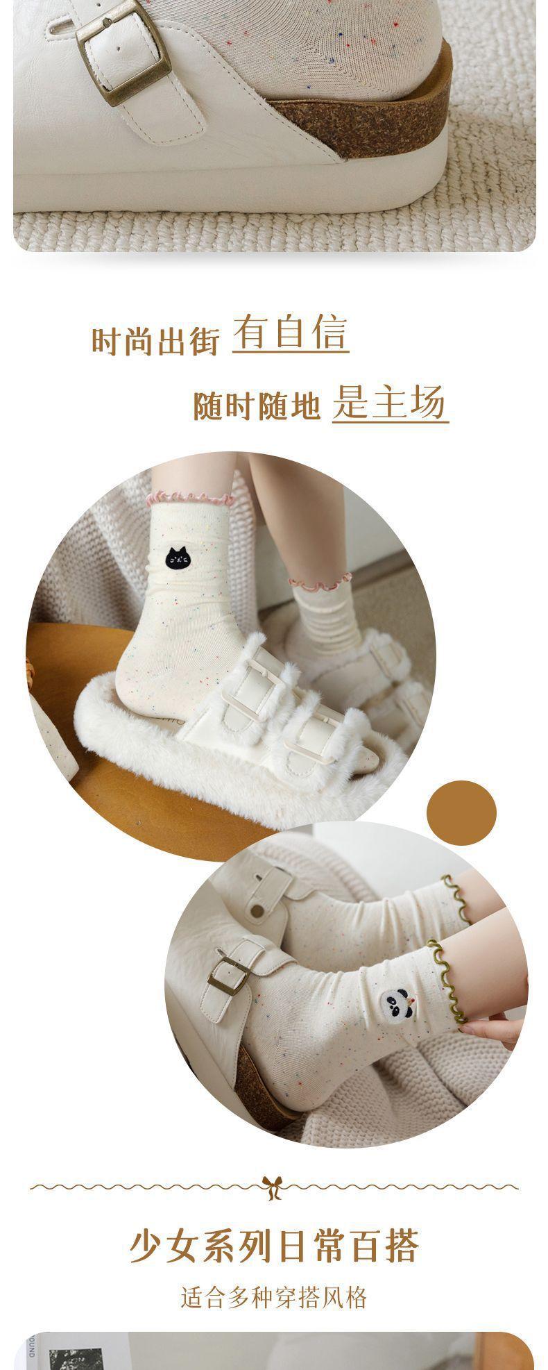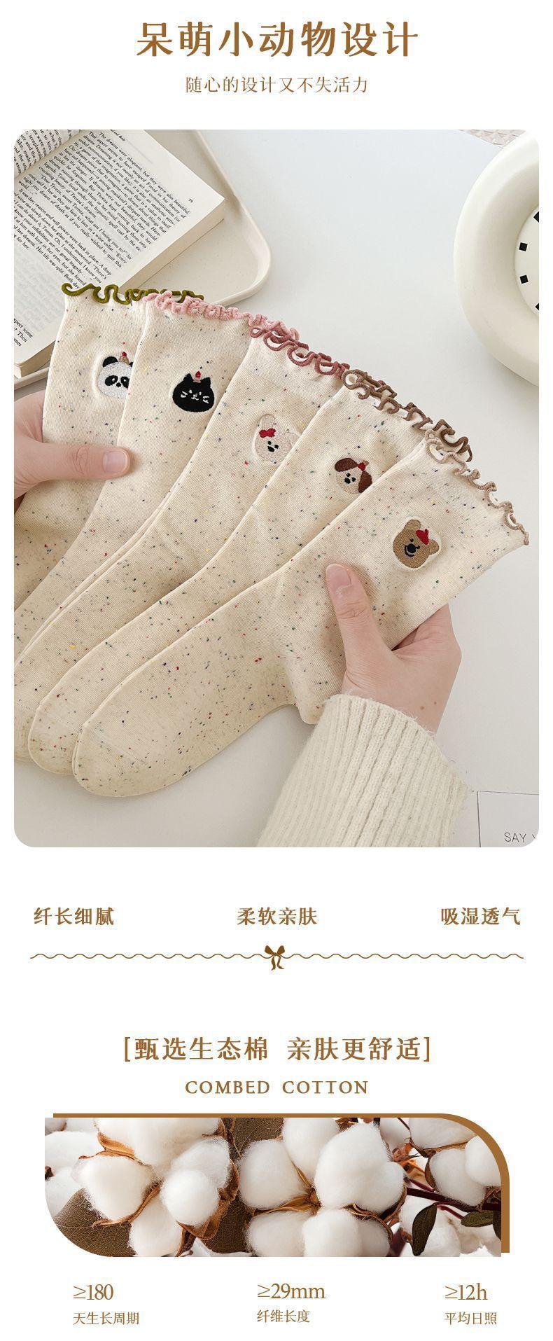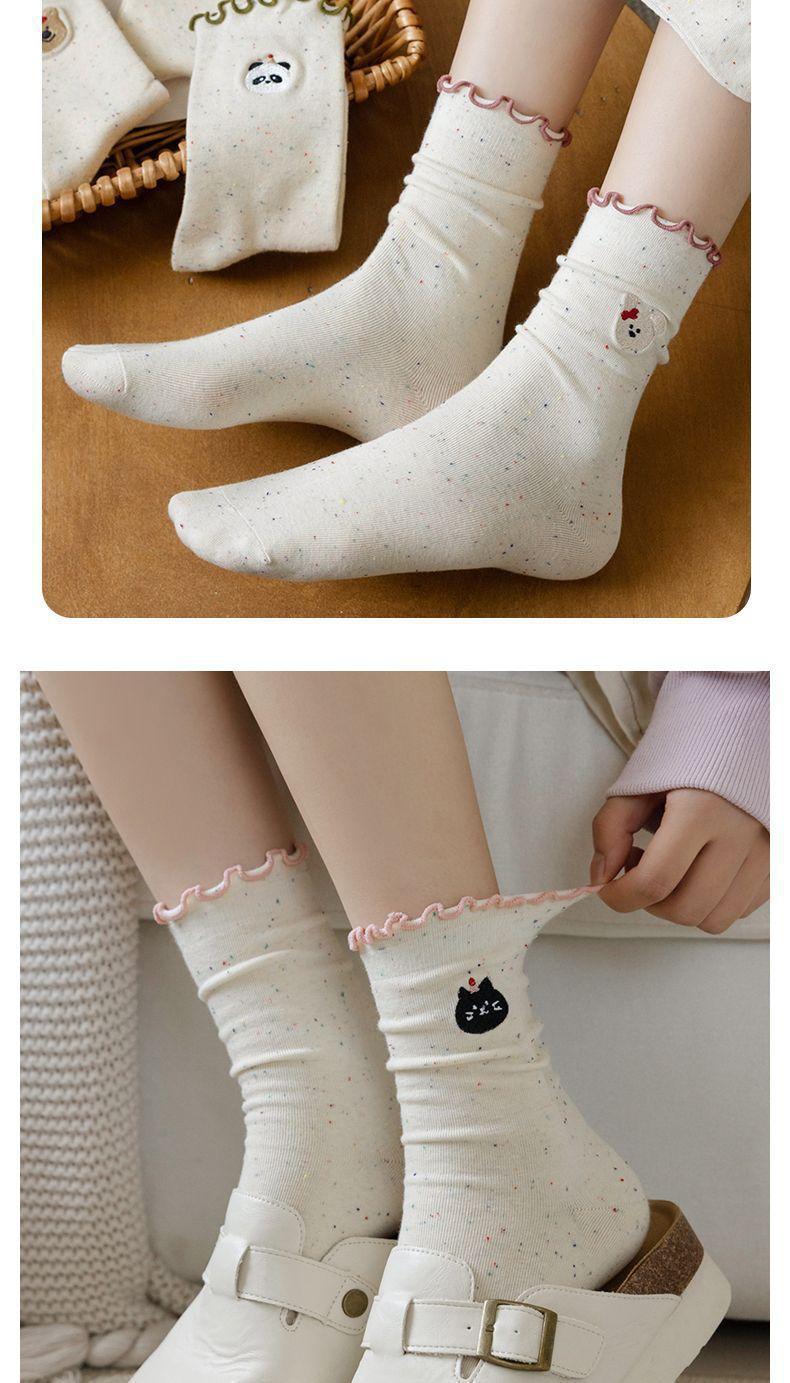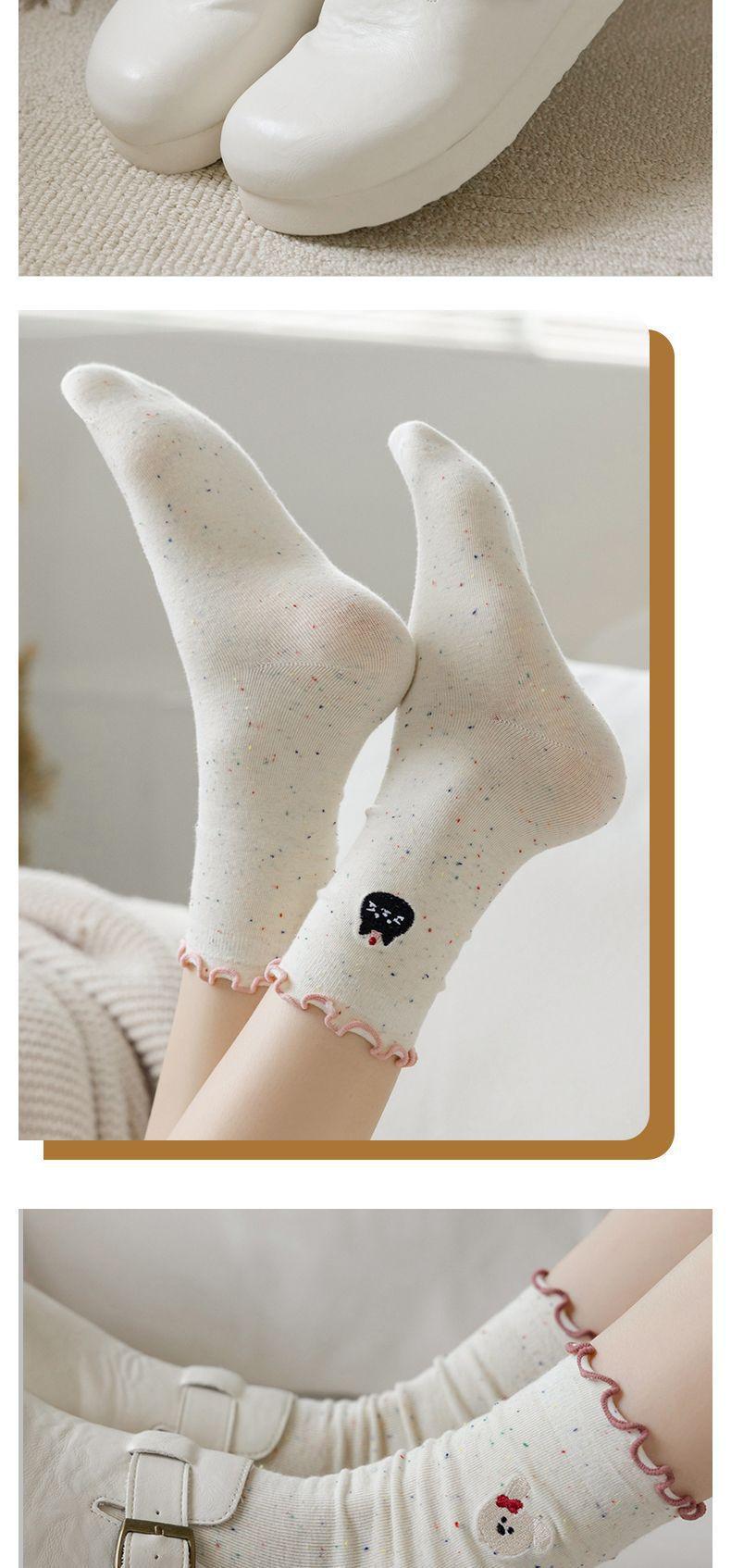 Calcetines de Mujer Algodón Puro Calcetines Arrugados Otoño e Invierno Hilo Jaspeado Japonés Lindo Bordado Dibujos Animados Borde con Volantes Todo Algodón Calcetines Media Caña