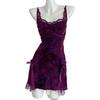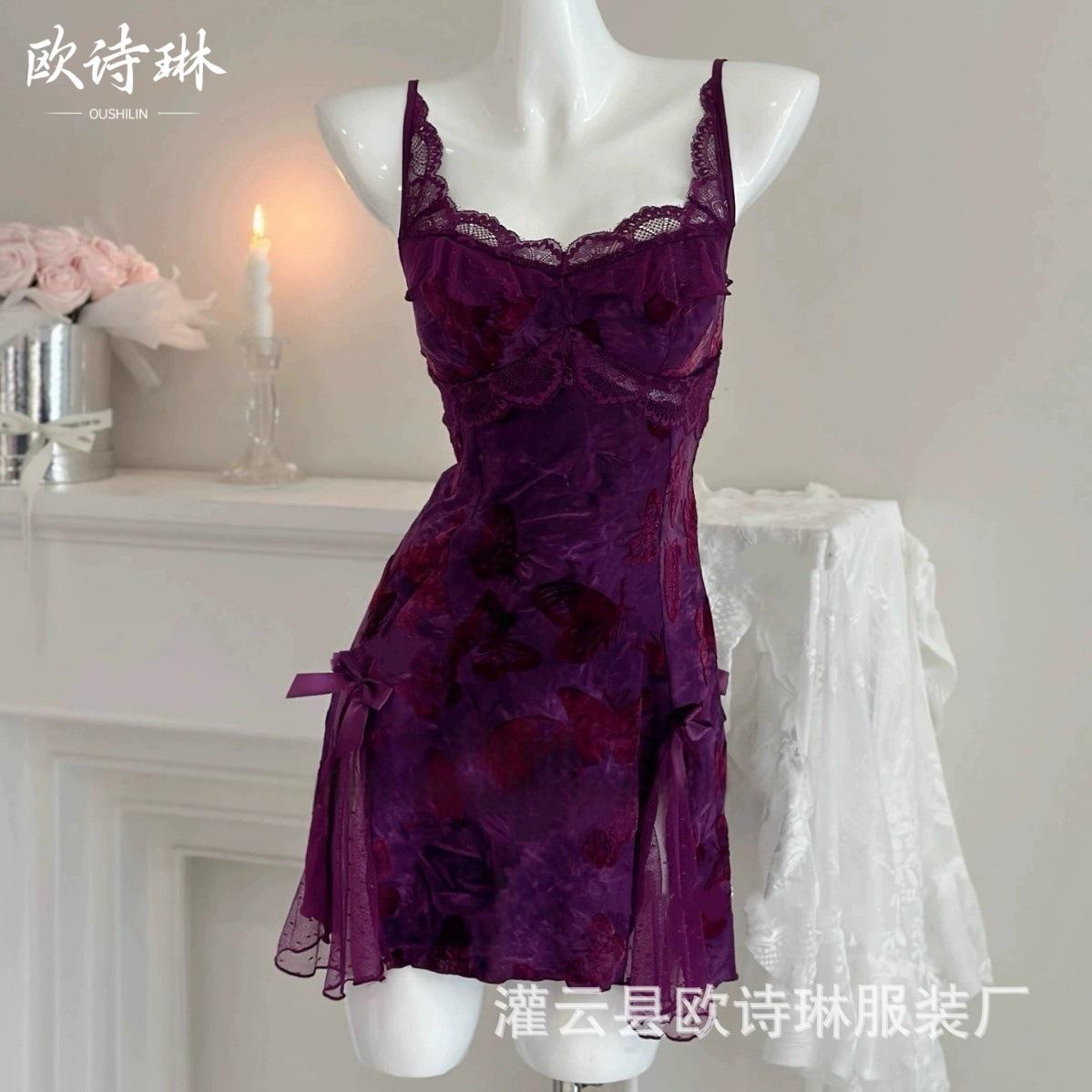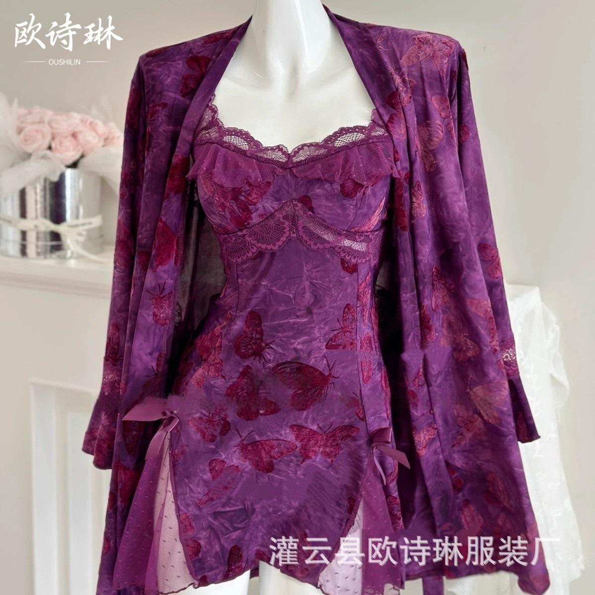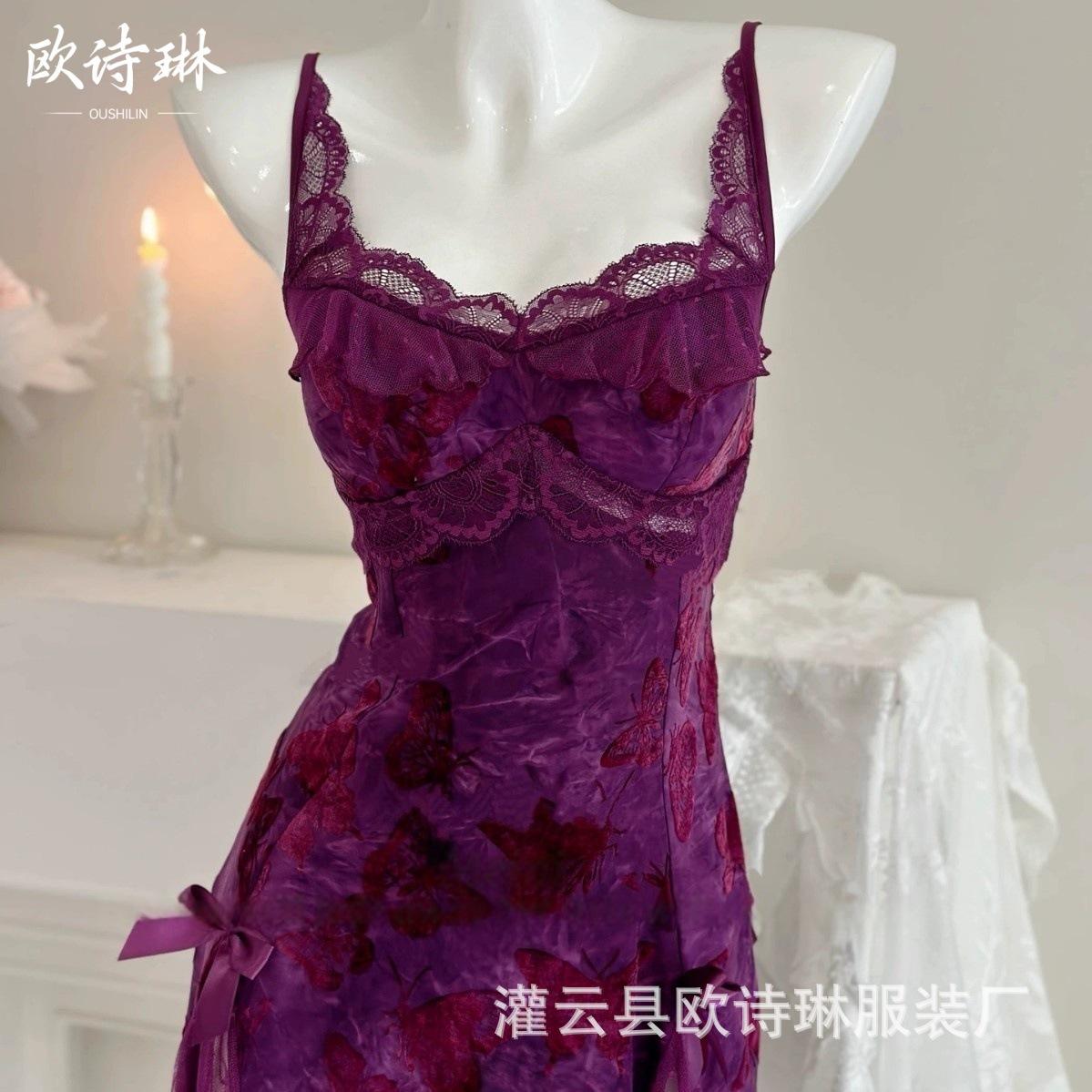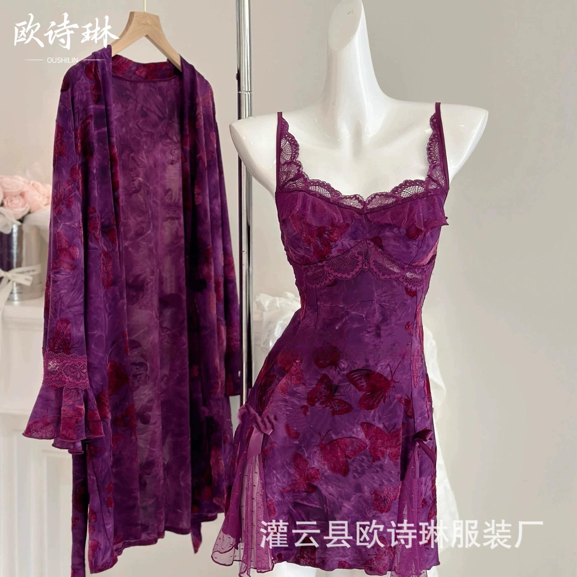 Sexy púrpura para mujer estampado de verano mariposa con almohadilla de sujetador hermana madura de alta gama deseo puro camisón con tirantes ropa de casa