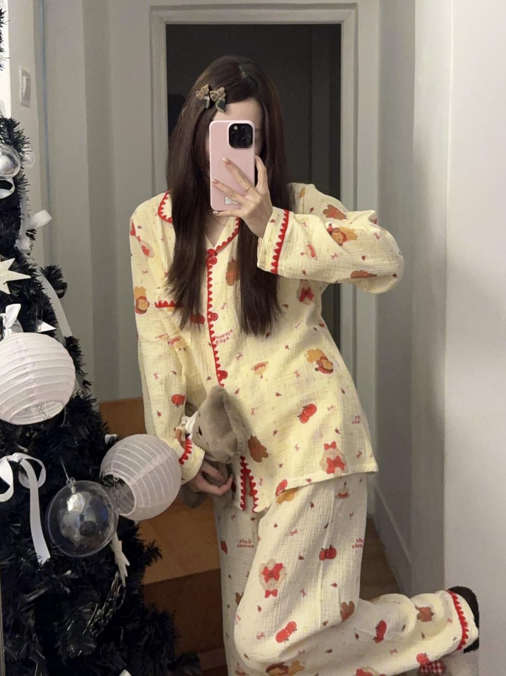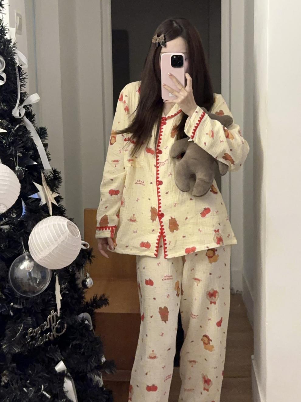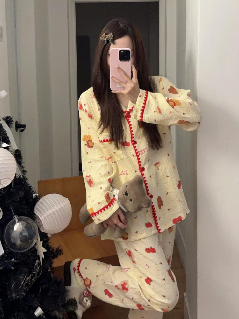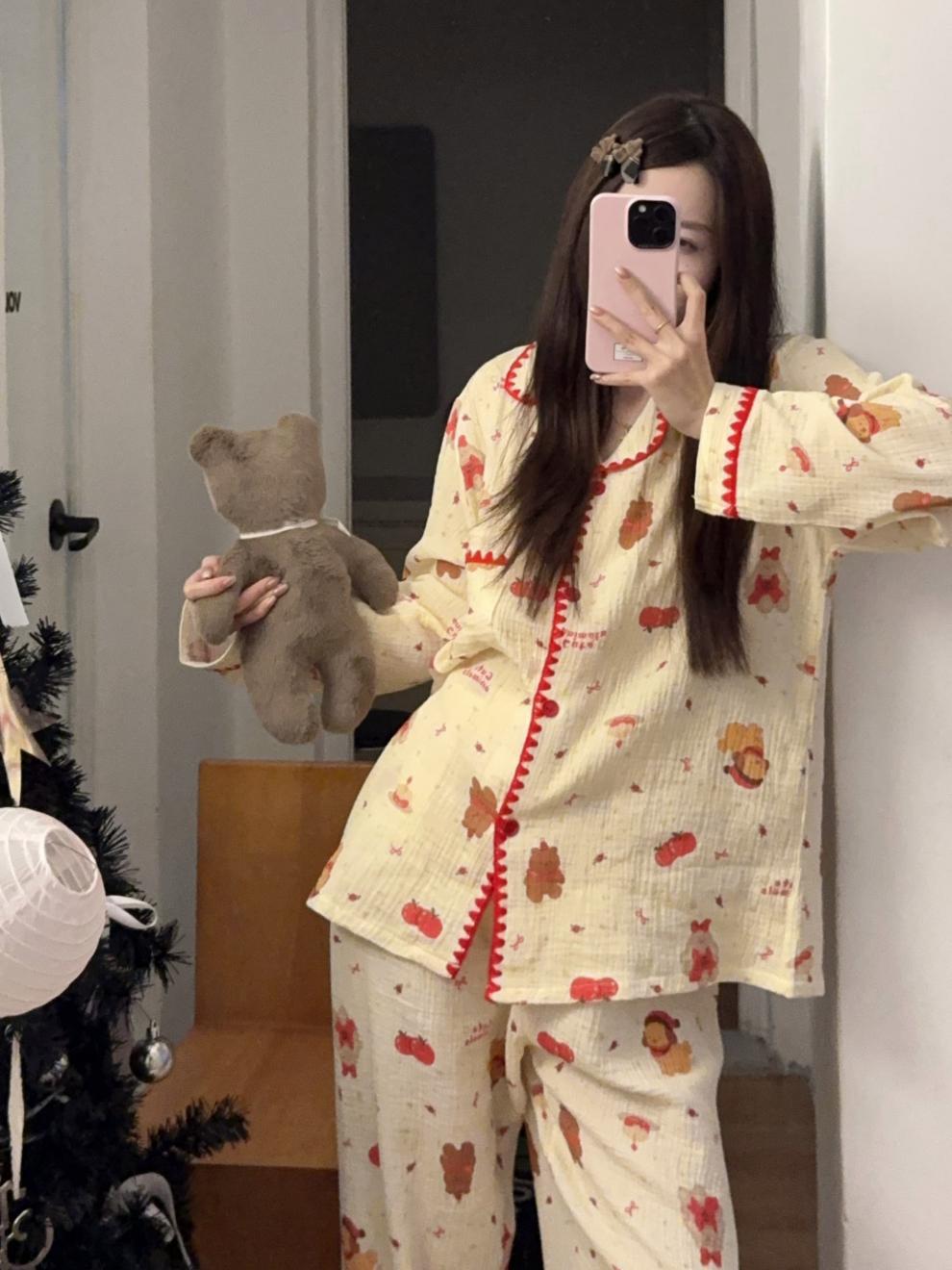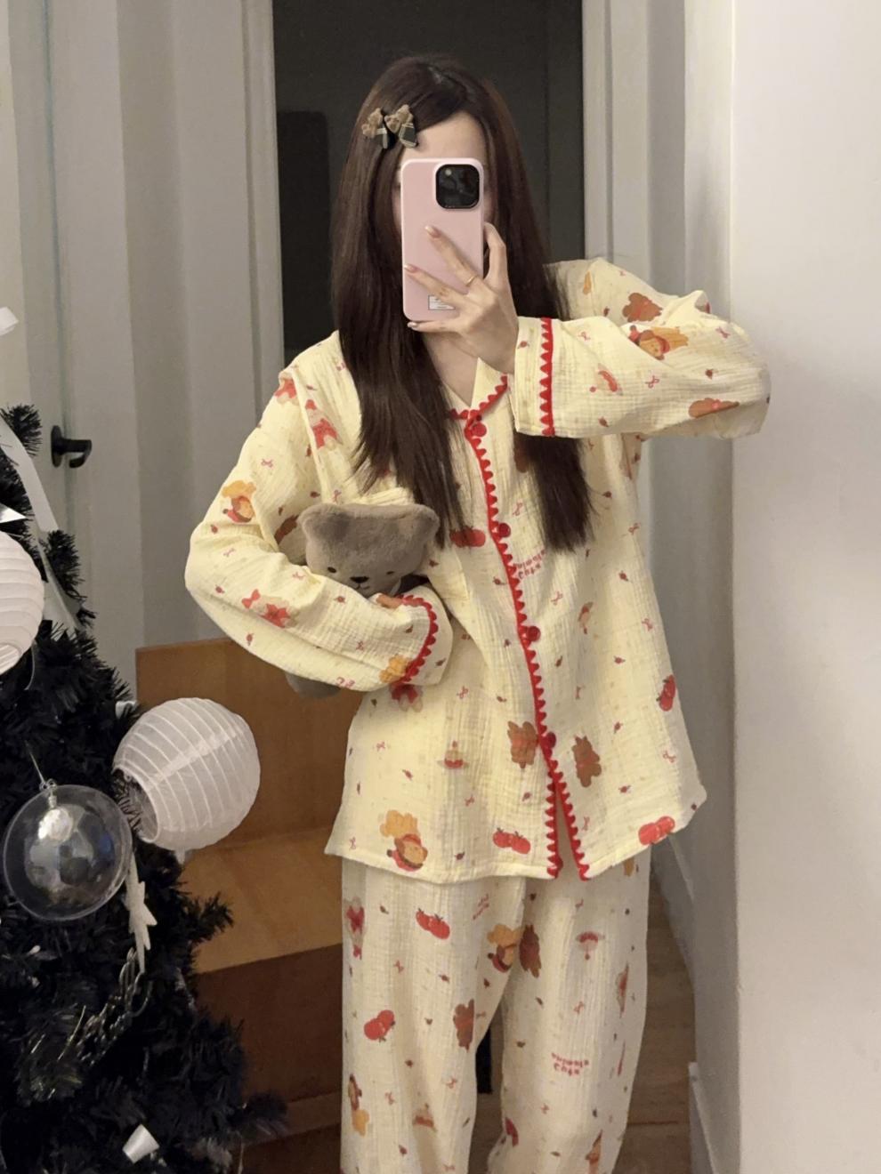 Pijamas de Algodón Japonéses Lindos para Mujer Otoño Primavera Manga Larga Dulce Dibujo Animado Estudiante Conjunto Ropa de Casa Físico Taobao Mayoreo