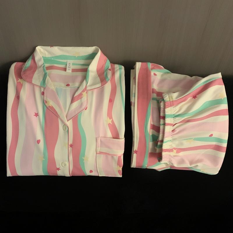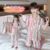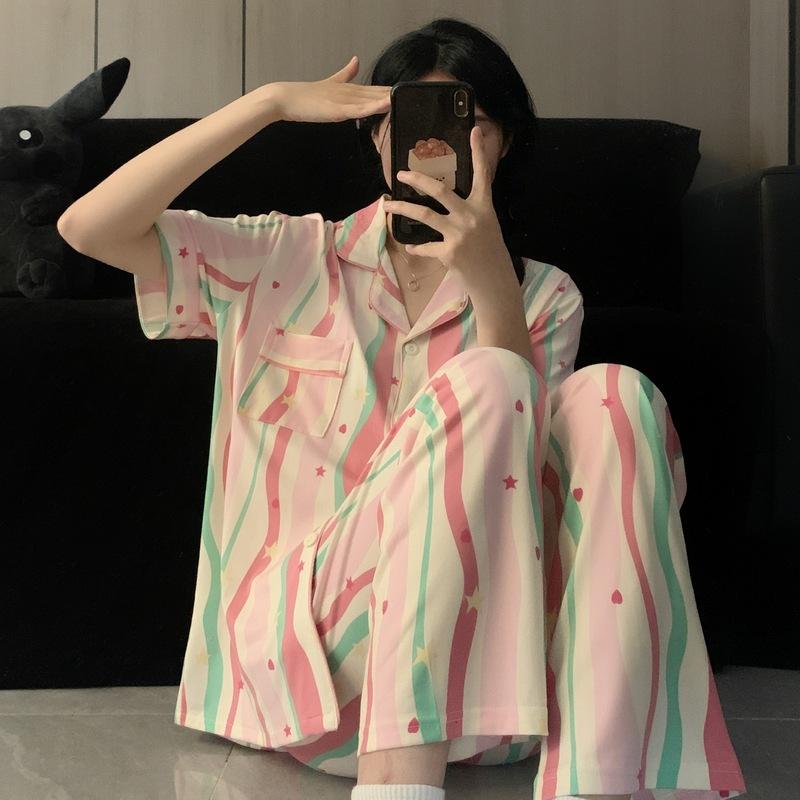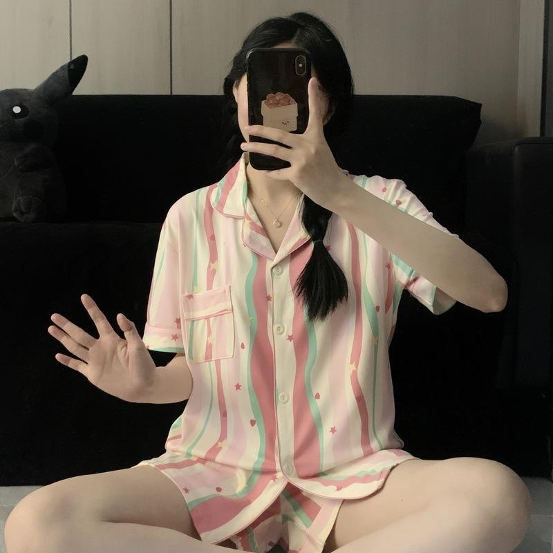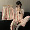 Pijama de Dopamina a Rayas Talla Grande para Mujer Primavera y Verano 2024 Nuevo Manga Corta Rosa Dulce Tres Piezas Ropa para el Hogar en Stock
