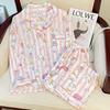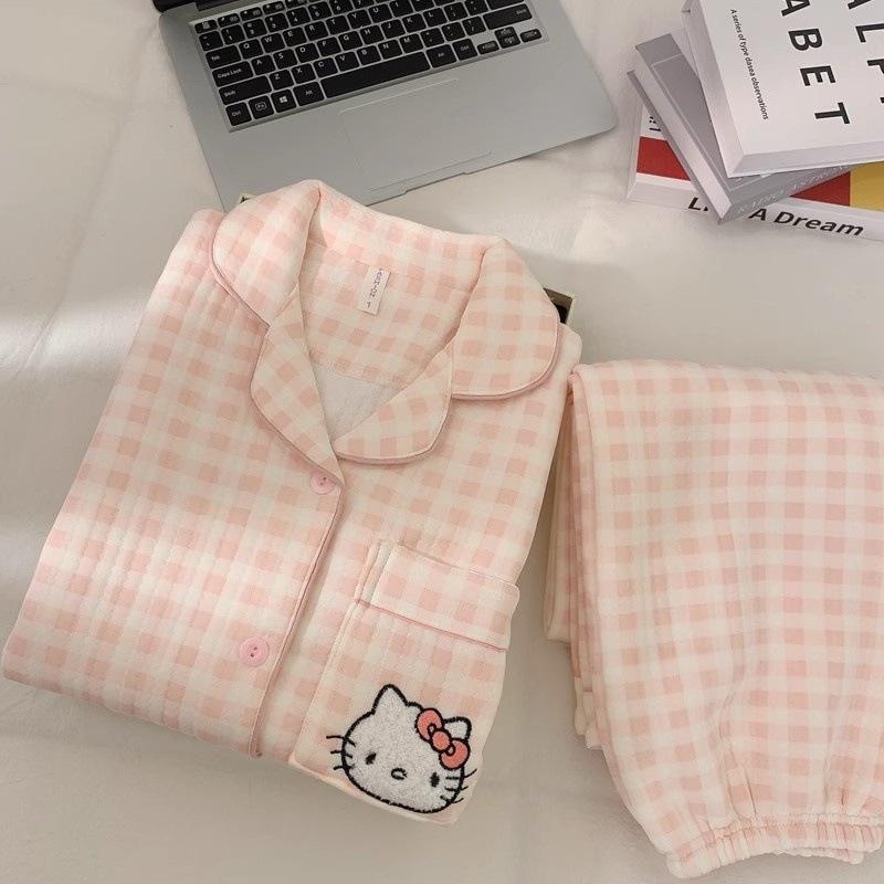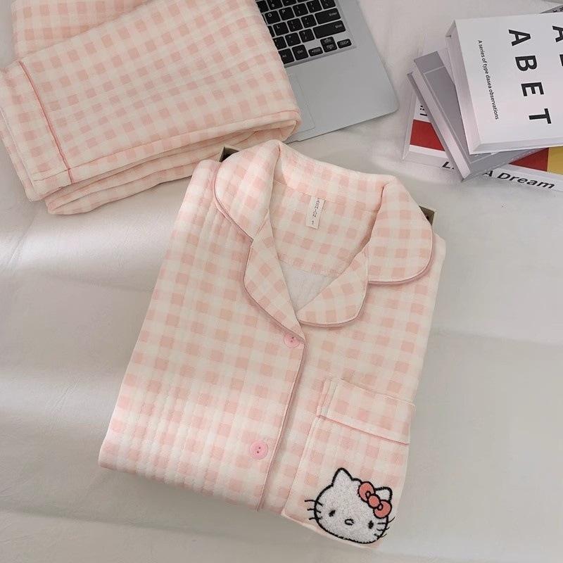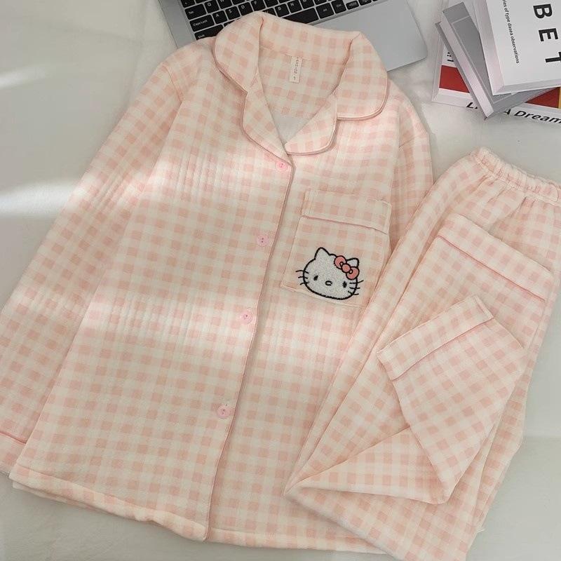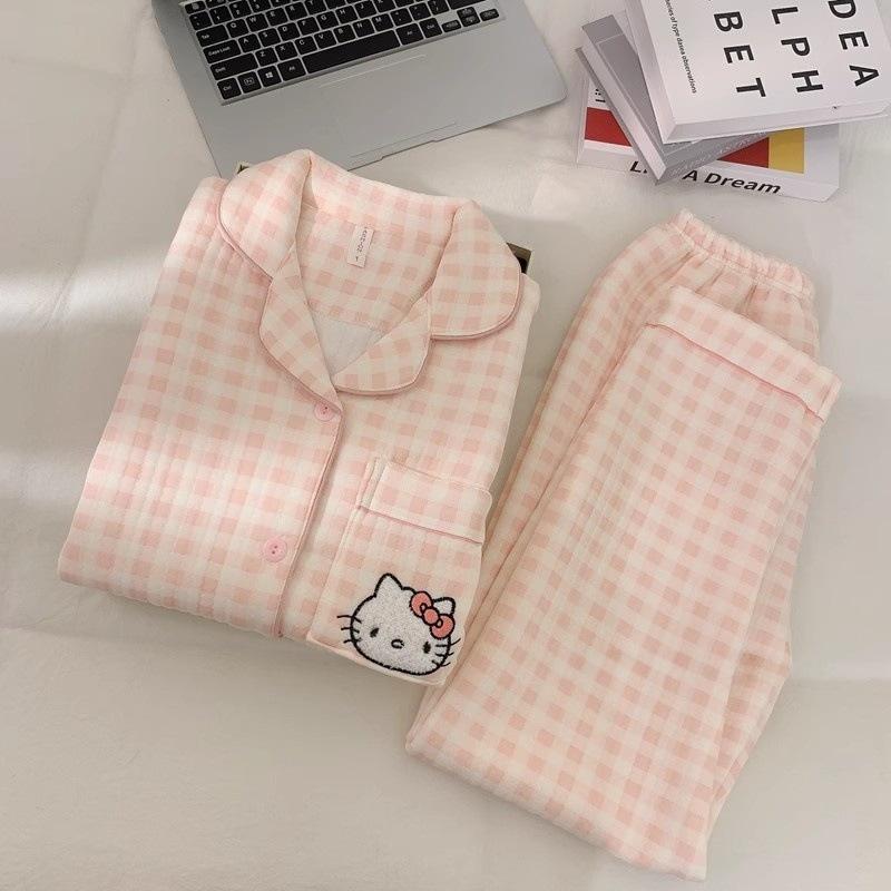 Pijama de algodón aire estilo ins japonés para otoño e invierno para niña, gato KT, para mujer, cálido, para estar en casa, conjunto de dos piezas, venta al por mayor transfronteriza
