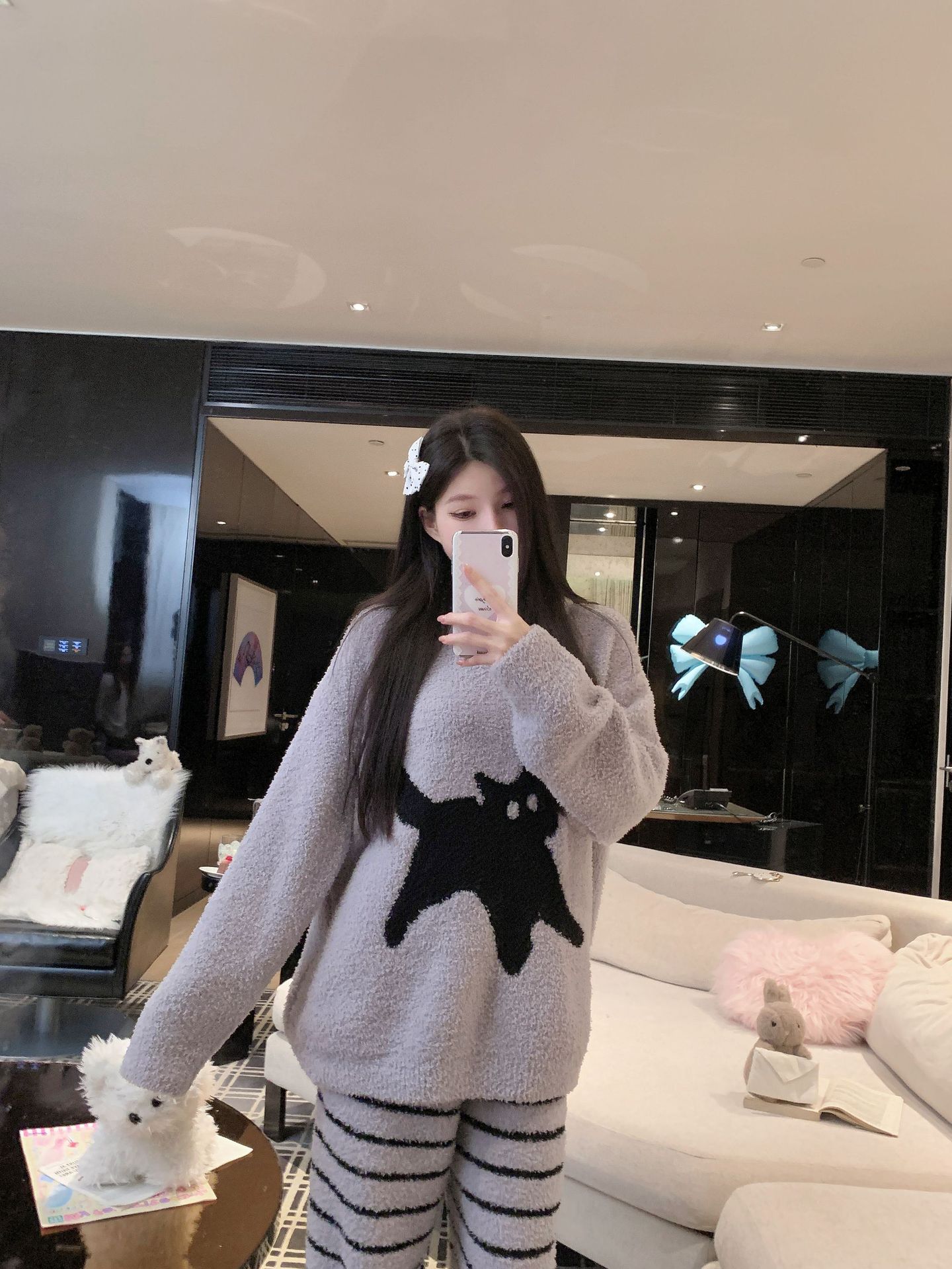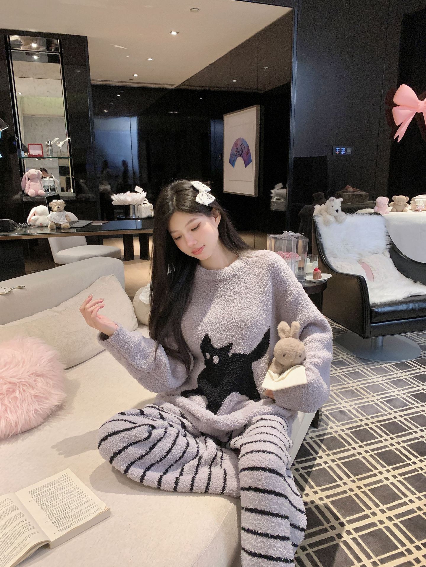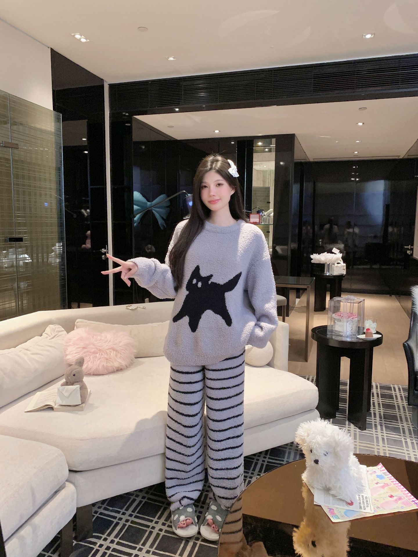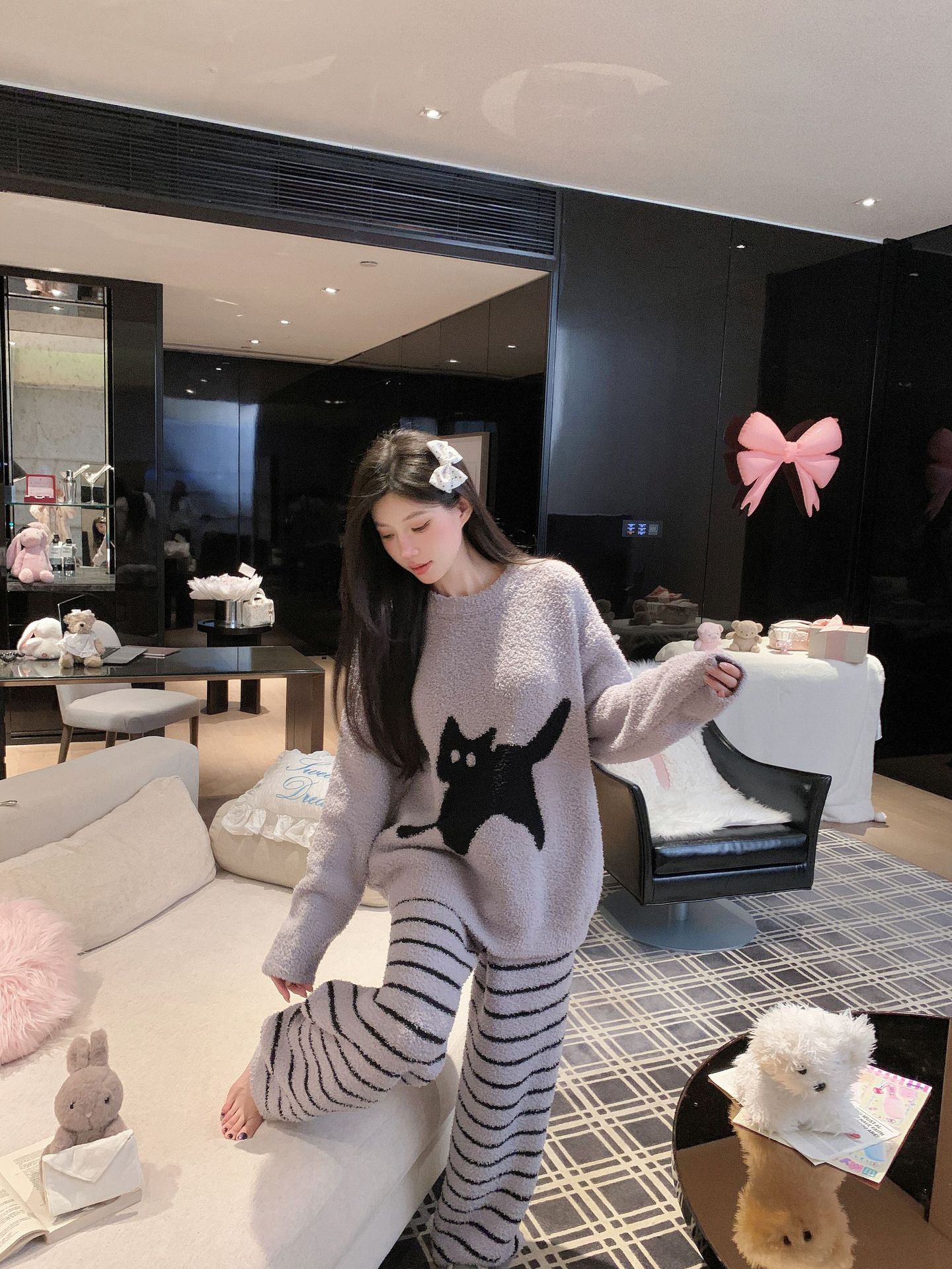 Pijama nuevo de dibujos animados de gato negro a rayas de medio terciopelo para mujer, otoño e invierno, suave y esponjoso, grueso, de forro polar coral, conjunto para estar en casa