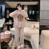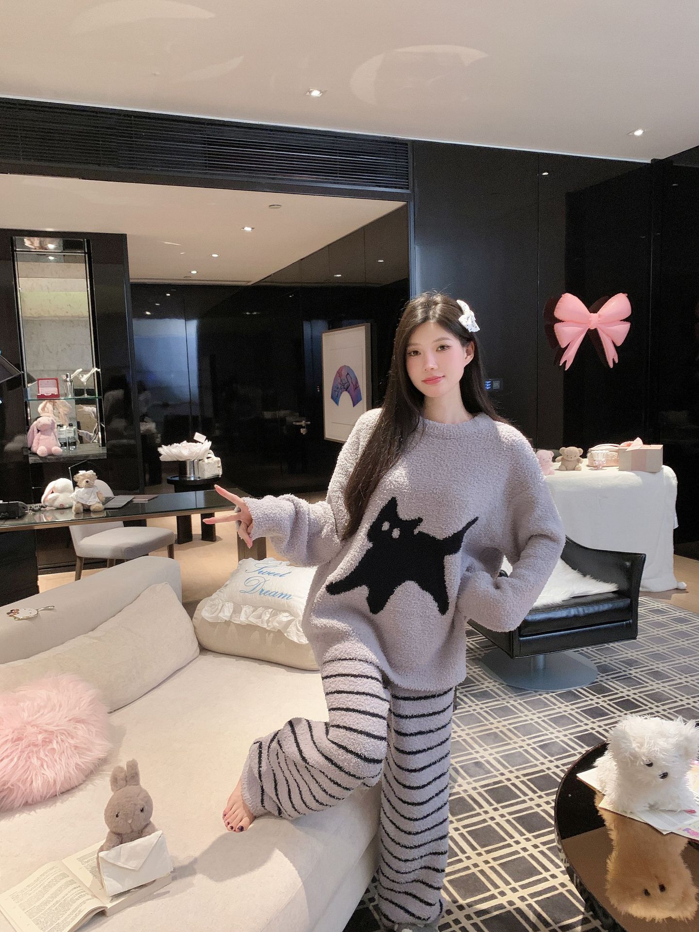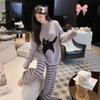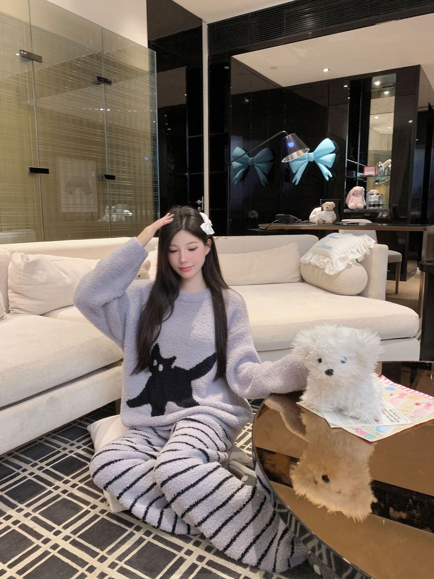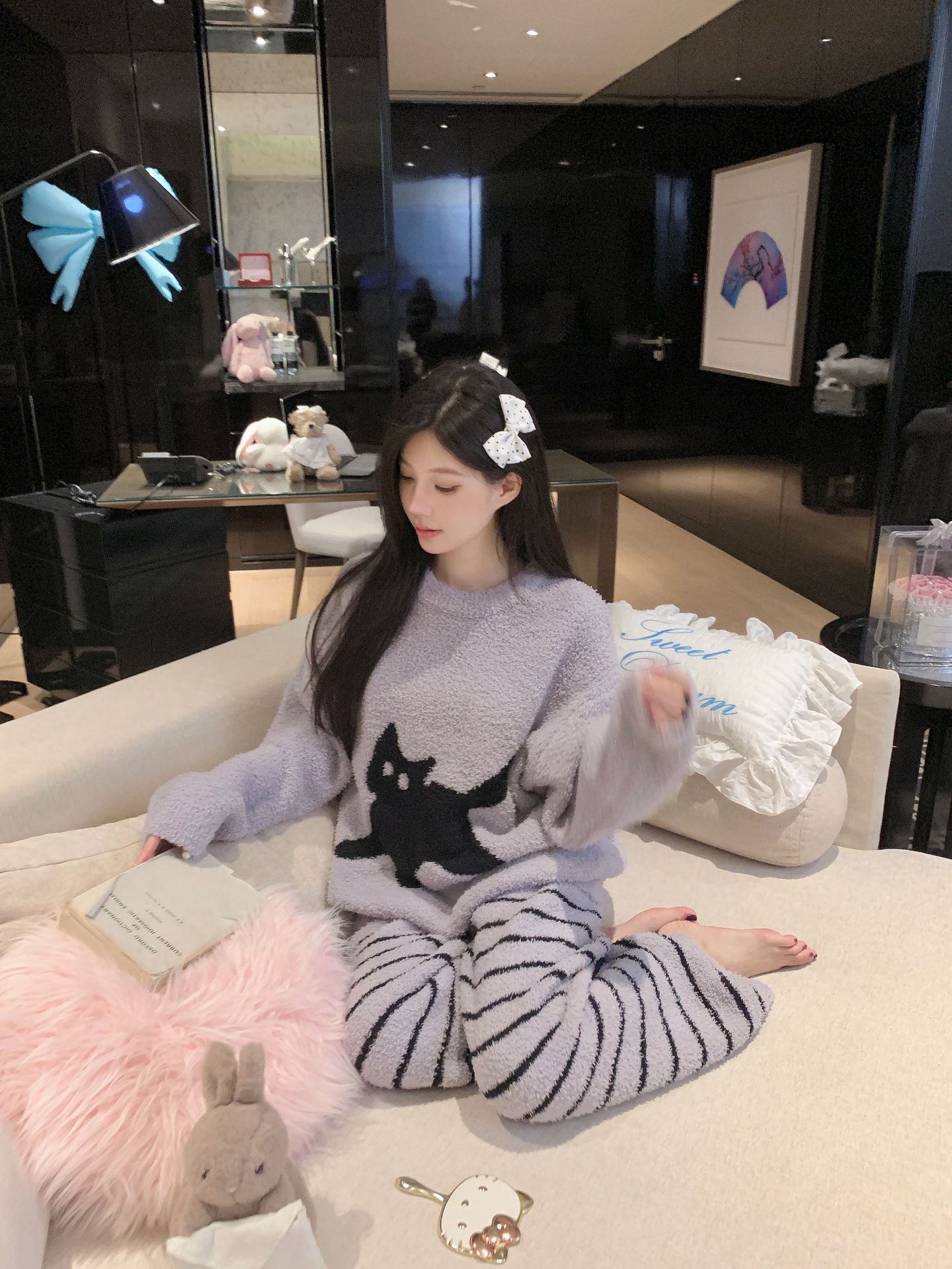 Pijama nuevo de dibujos animados de gato negro a rayas de medio terciopelo para mujer, otoño e invierno, suave y esponjoso, grueso, de forro polar coral, conjunto para estar en casa