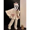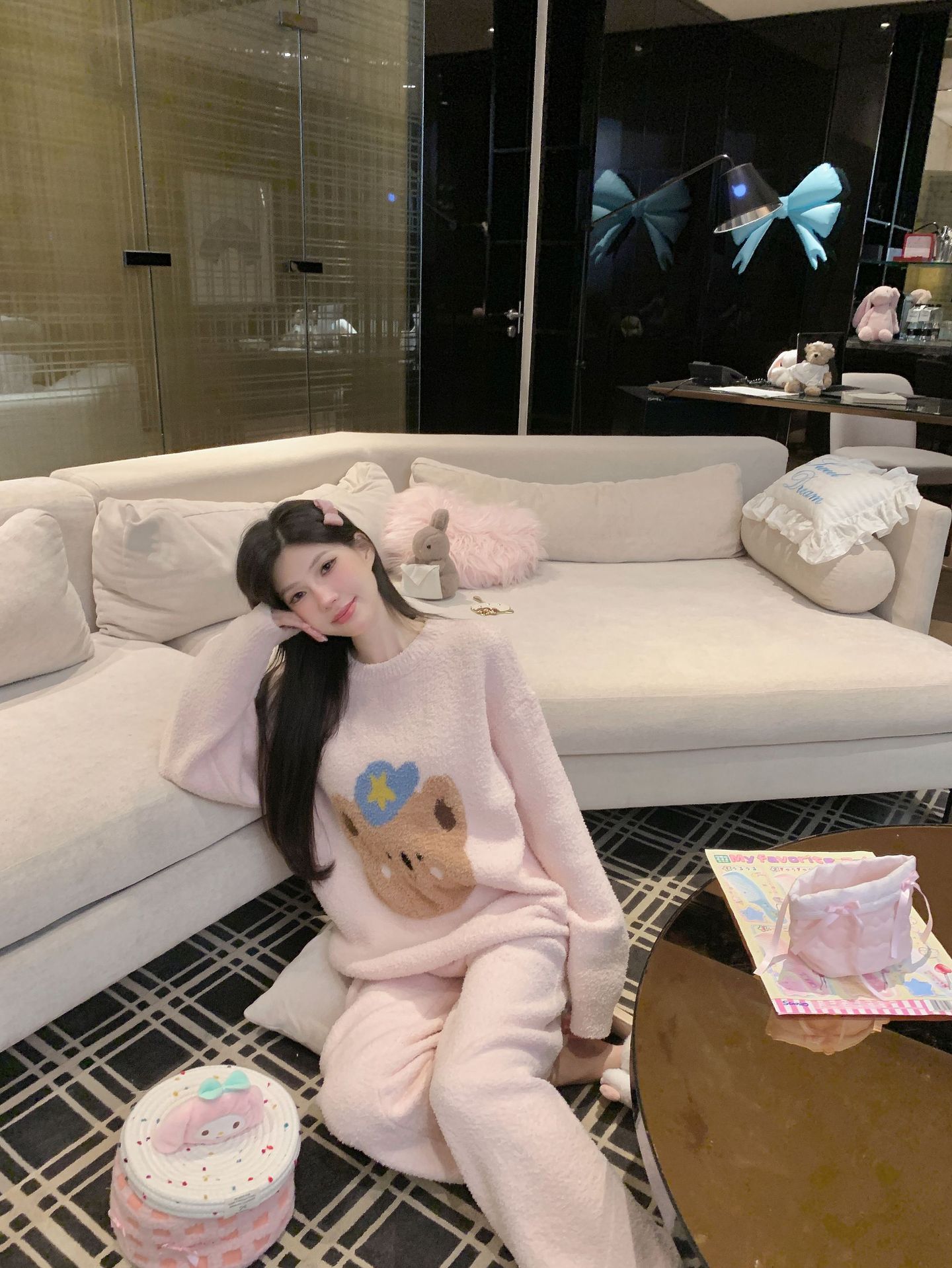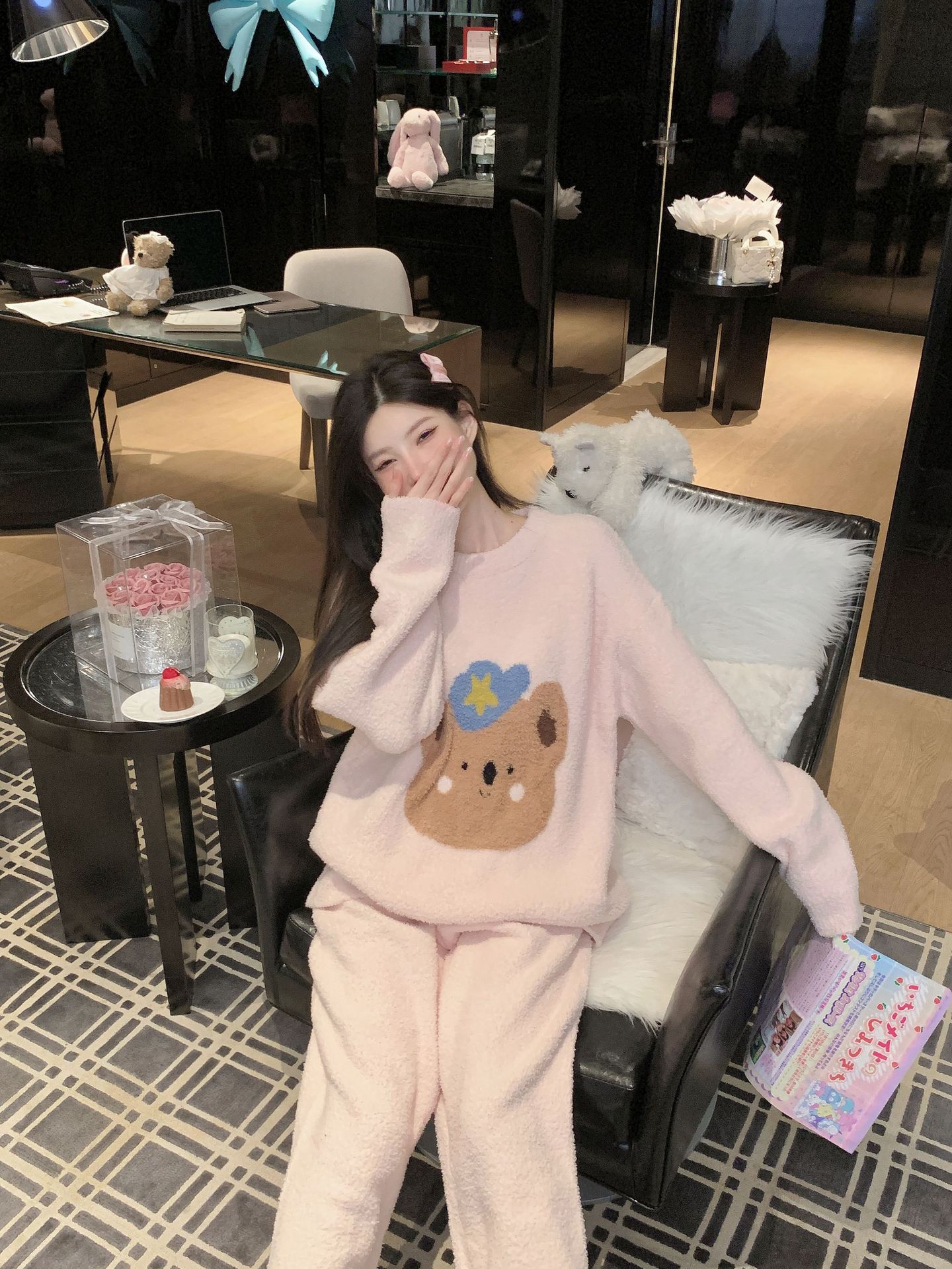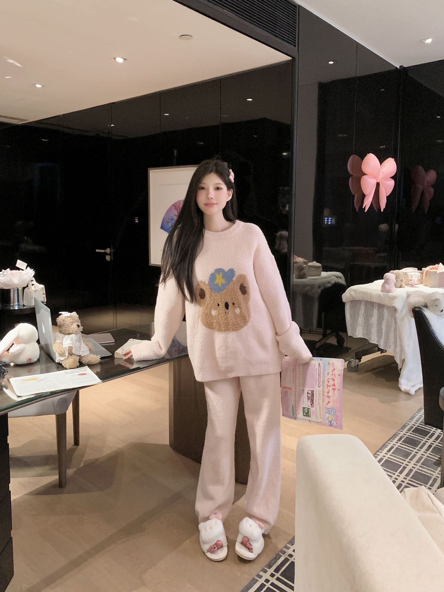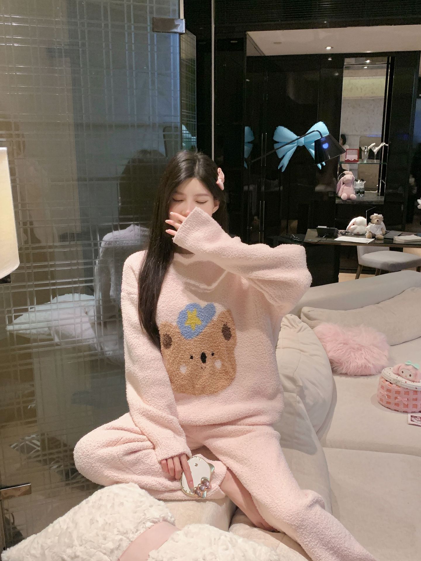Pijama nuevo de dibujos animados de gato negro a rayas de medio terciopelo para mujer, otoño e invierno, suave y esponjoso, grueso, de forro polar coral, conjunto para estar en casa